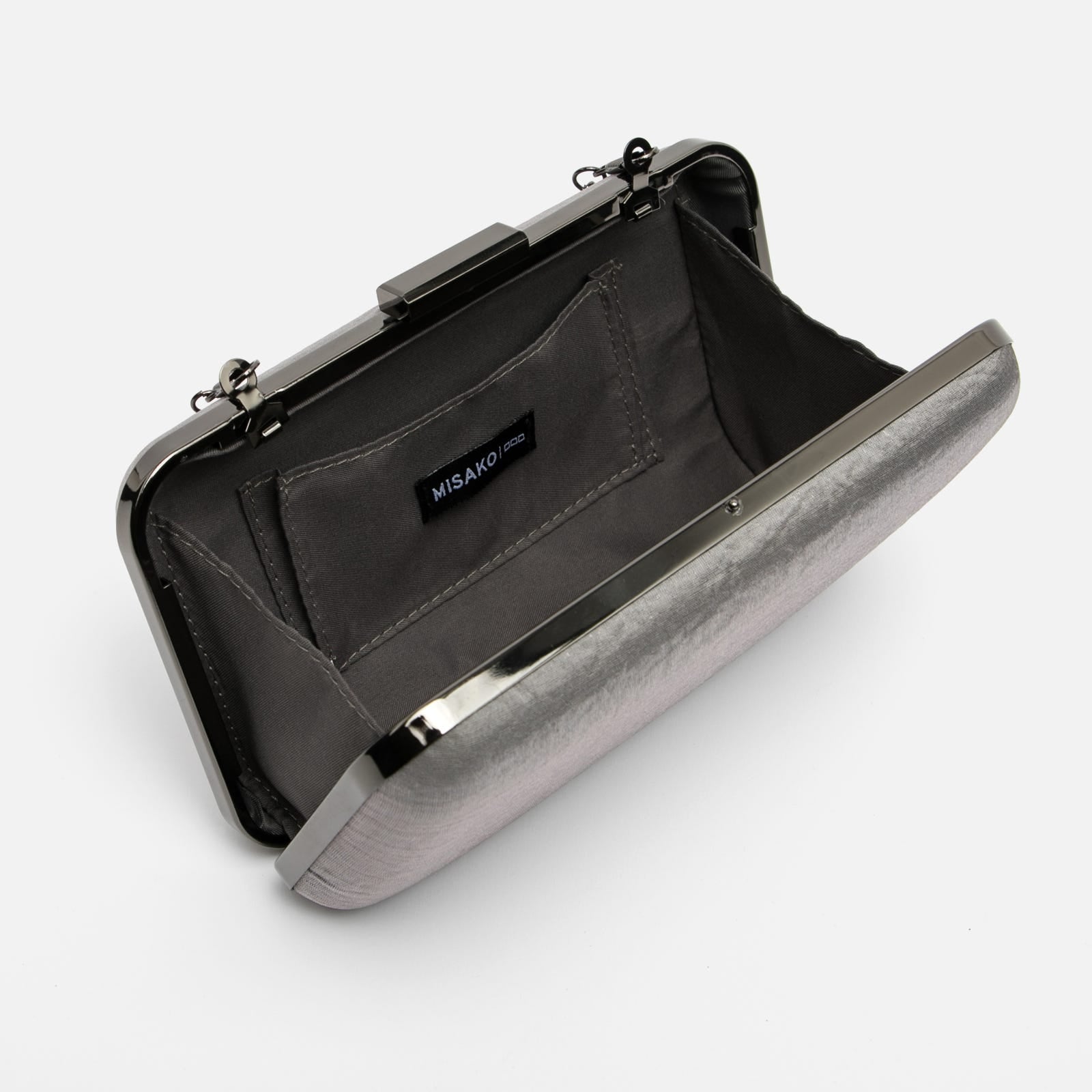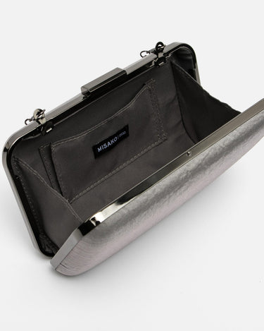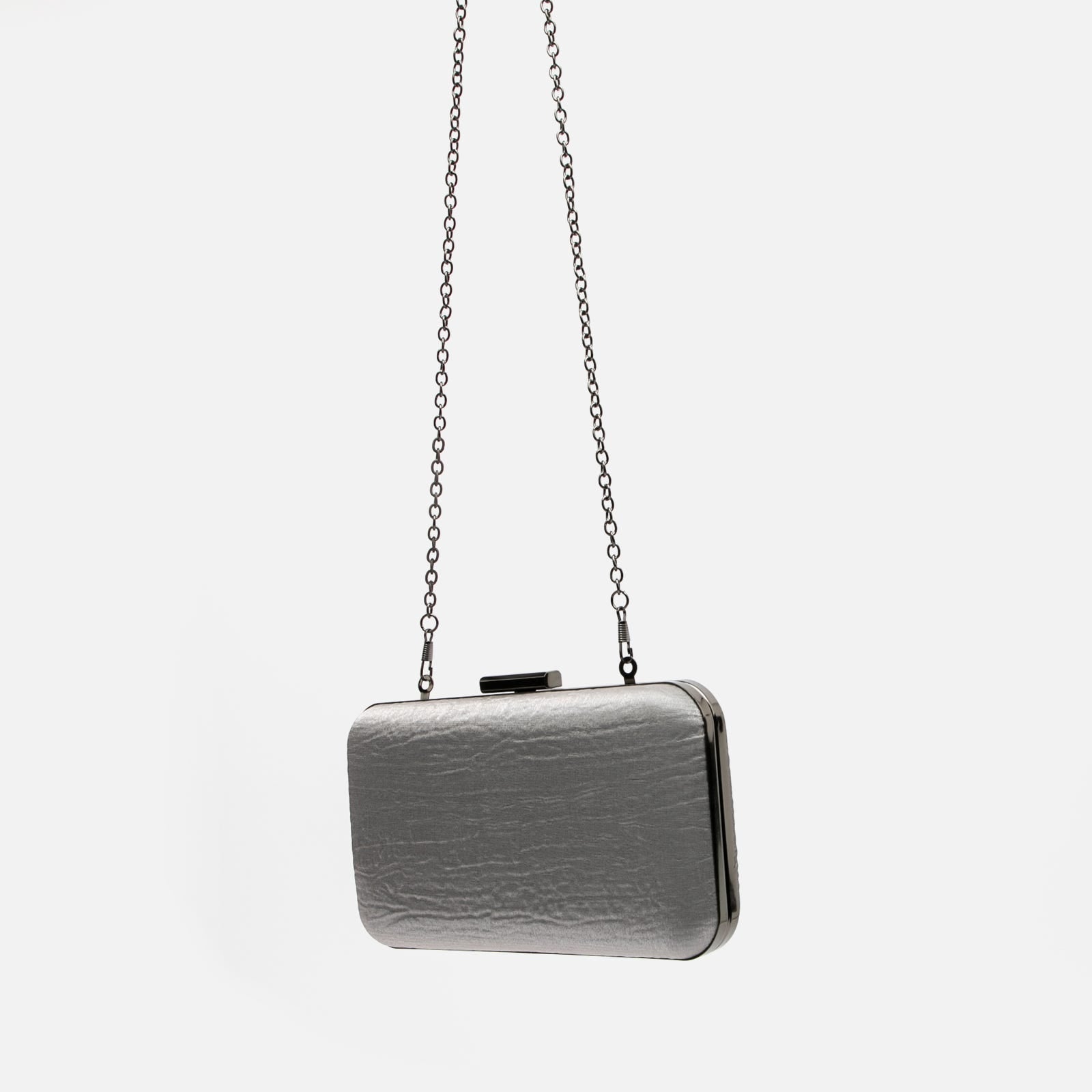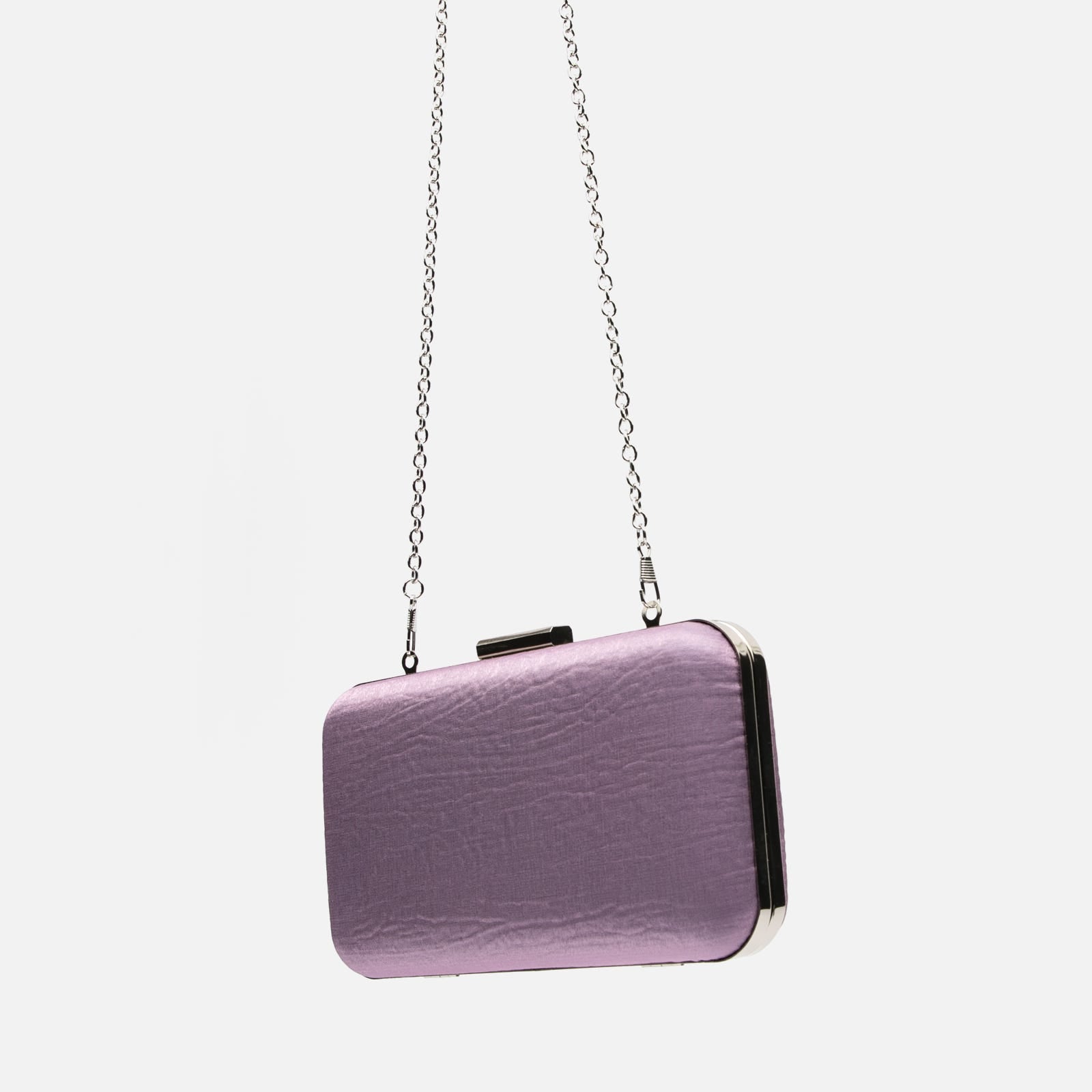 Satinierte Clutch-Tasche von Misako. Fach mit Metallverschluss. Enthält eine Kette.