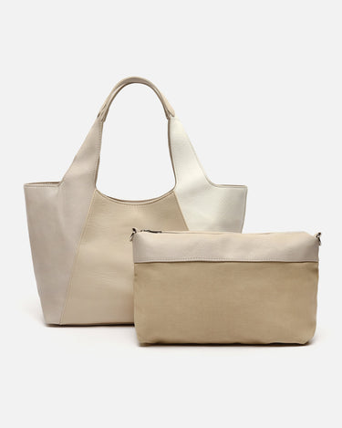 Sie ist aus dreifarbigem Material in Lederoptik gefertigt, hat eine matte Oberfläche und fühlt sich weich an. Sie verfügt über ein geräumiges Hauptfach mit Magnetverschluss und eine herausnehmbare Kosmetiktasche aus verschiedenen Stoffen, die die Organisation erleichtert und auch separat als Zusatztasche oder Clutch verwendet werden kann, was für zusätzliche Praktikabilität sorgt.