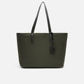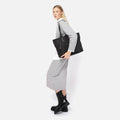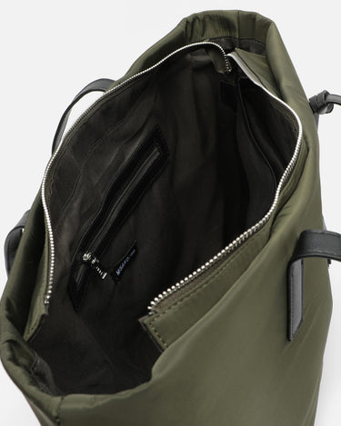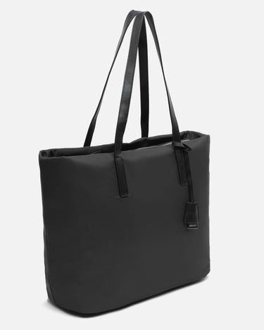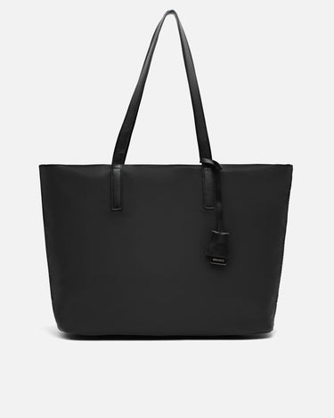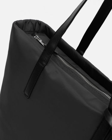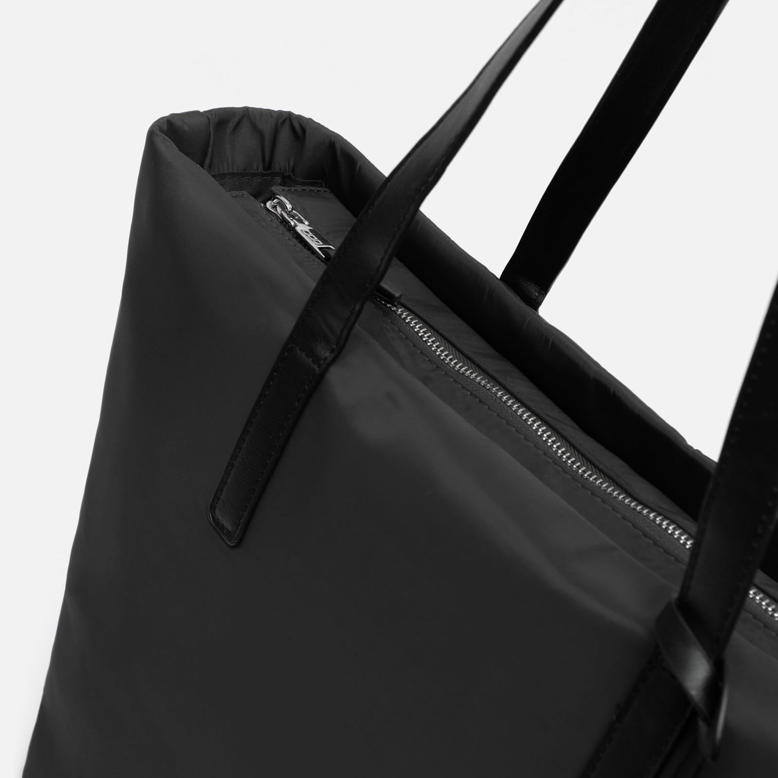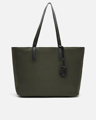 Made from satin nylon, this shopper has a minimalist design and leather-effect finishes that add elegance and striking contrast. Its neutral tones make it easy to combine, while its spacious interior with top closure allows you to organise your essentials with ease. The long handles make it particularly comfortable, even when wearing loose jackets or mid-season jumpers.