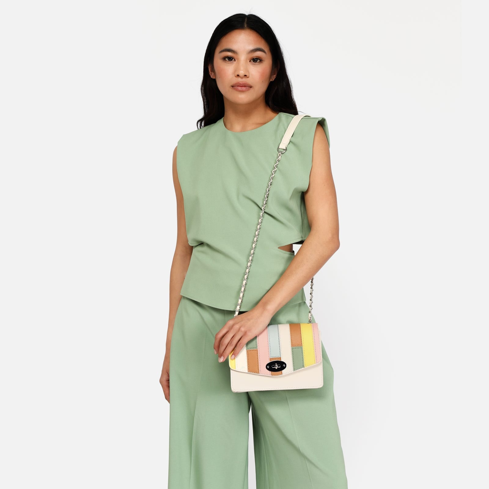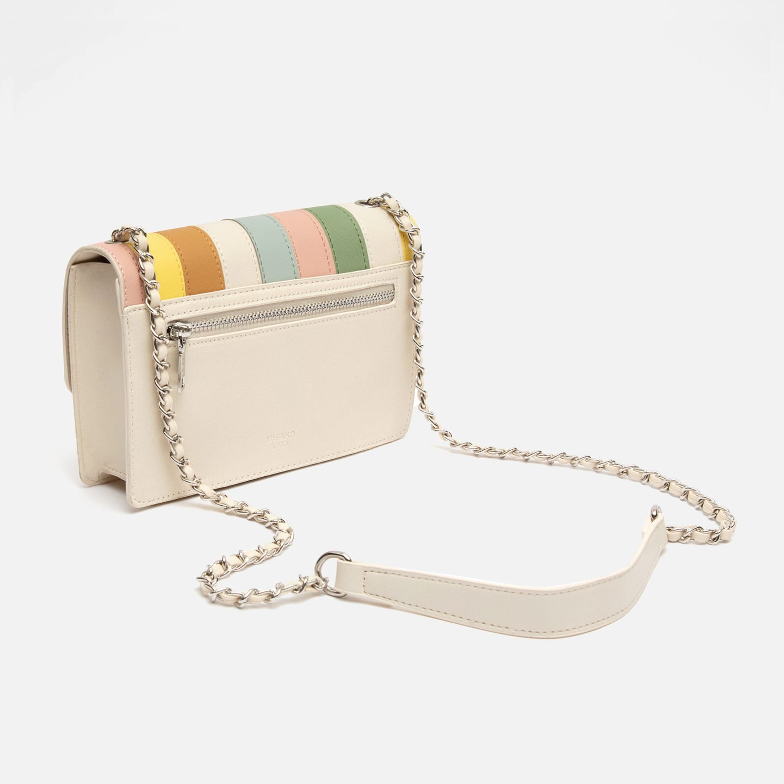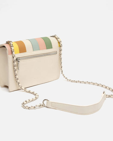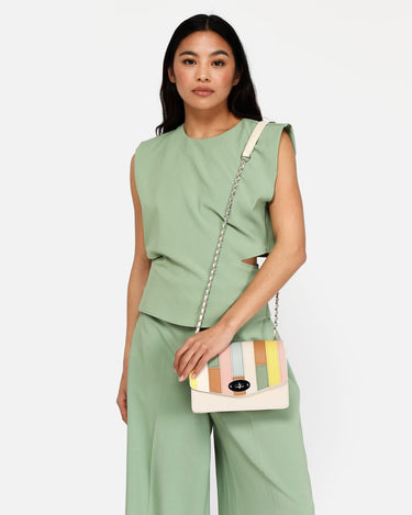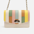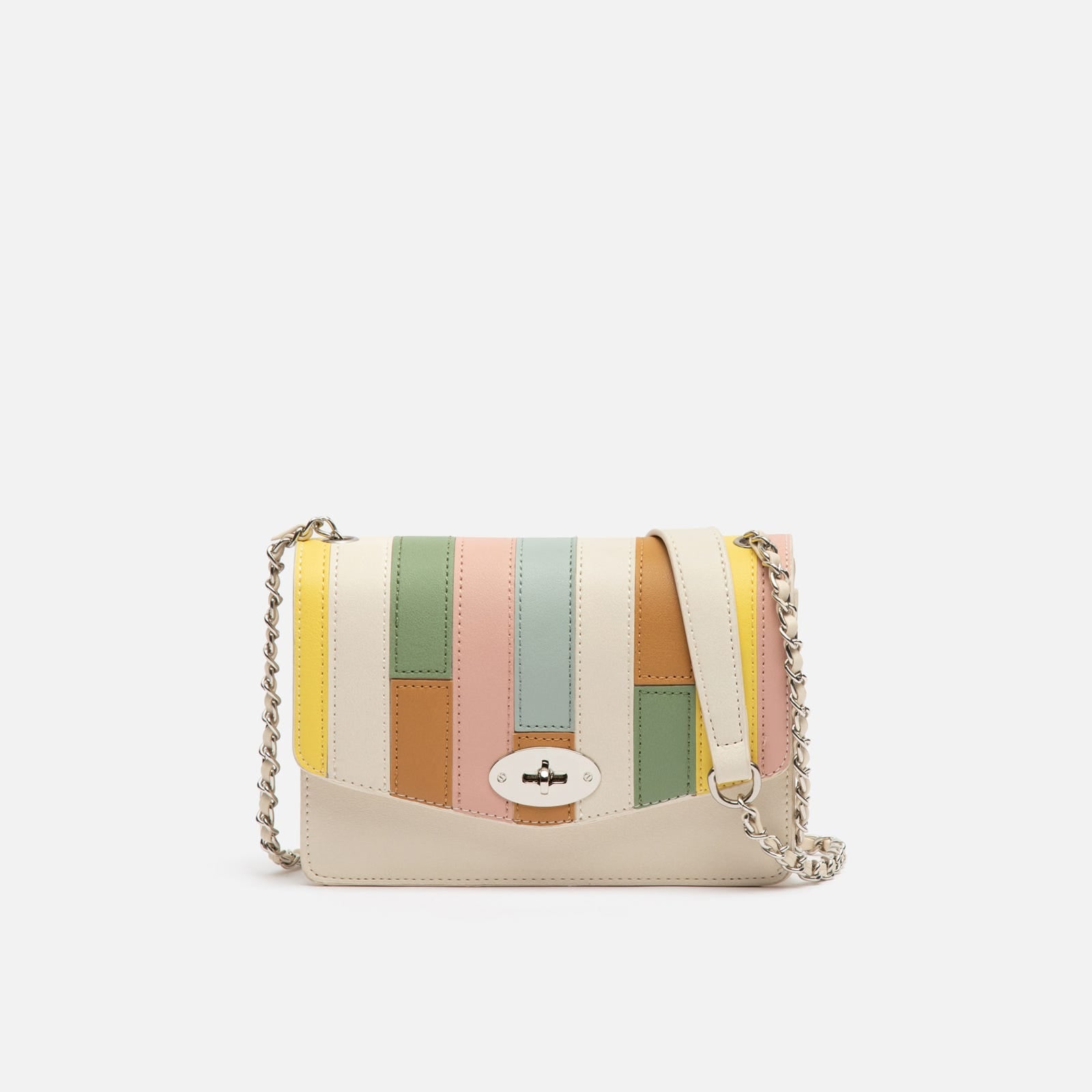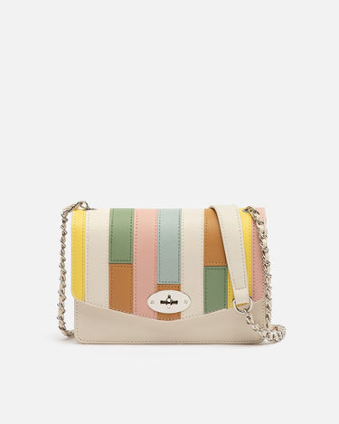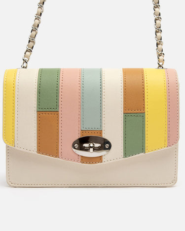 This white party bag with colourful patchwork on the flap is the perfect accessory to add a different touch to your outfits. With a main compartment that includes an interior zip pocket, it offers secure space for your essentials. The overall clasp closure ensures the security of your items while adding a touch of sophistication. Plus, its chain handle allows you to carry it comfortably over the shoulder or across the body.