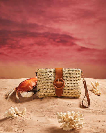 Misako's raffia-effect shoulder bag features a spacious compartment with a handy interior pocket and zip closure to keep your belongings secure. It features a magnetic button closure and camel belt decoration, adding a touch of unique style. With its detachable hand strap and detachable adjustable shoulder strap, you can carry it comfortably as you prefer. This bag is the perfect choice to complete your summer look.