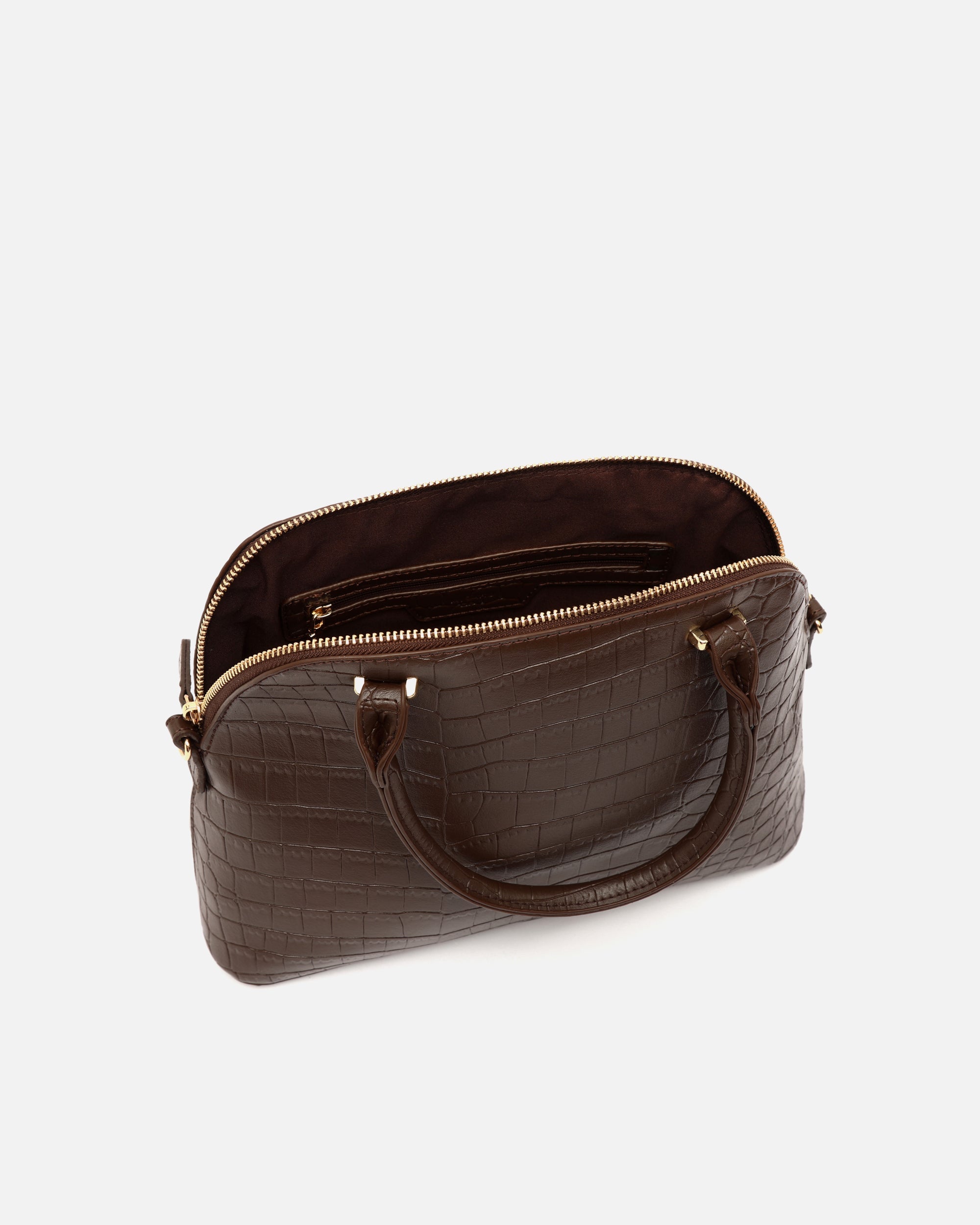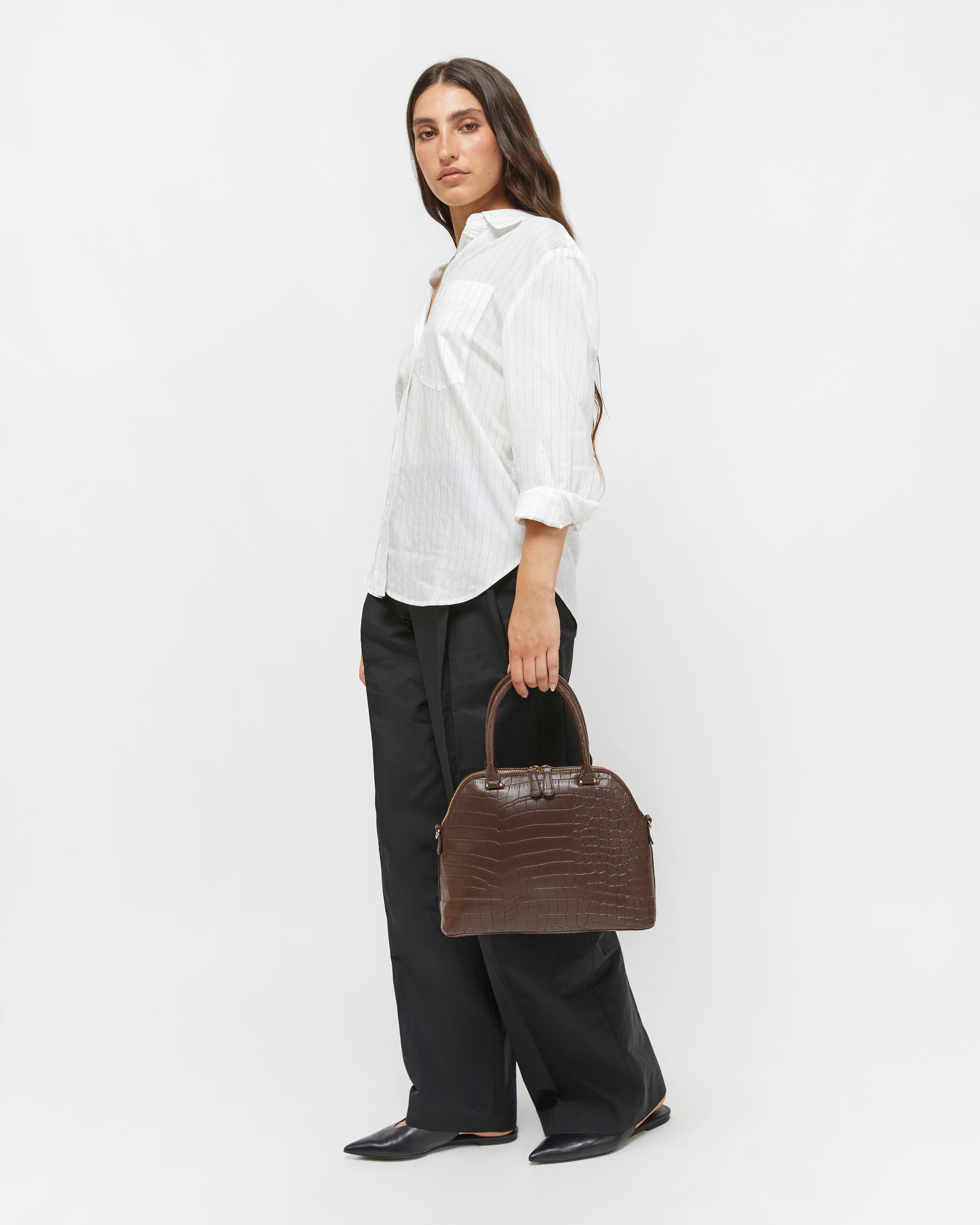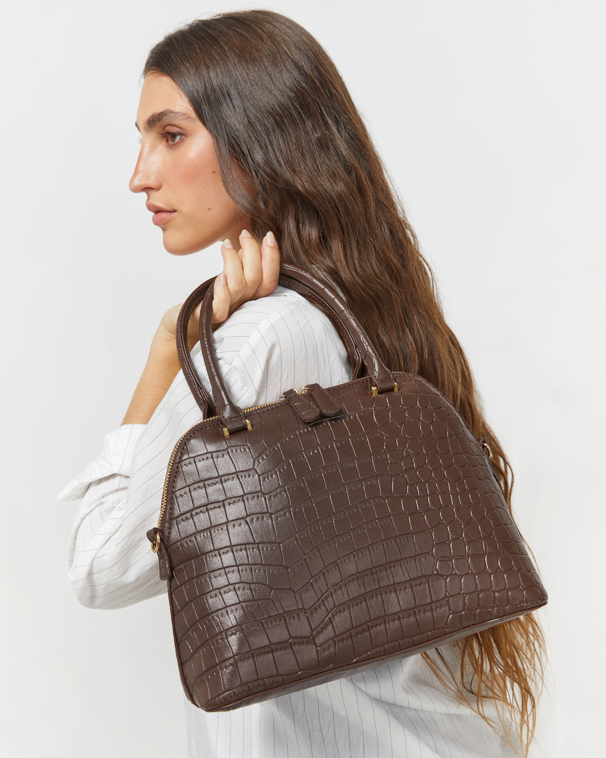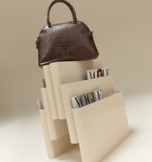 More than just a bag, Misako's Denixa is an accessory with lots of personality. It features an elegant bowling bag design with an animal print finish, adding texture and a touch of sophistication. Its structured profile and gold metal details make it a versatile piece, perfect for accompanying you on all your stylish adventures.