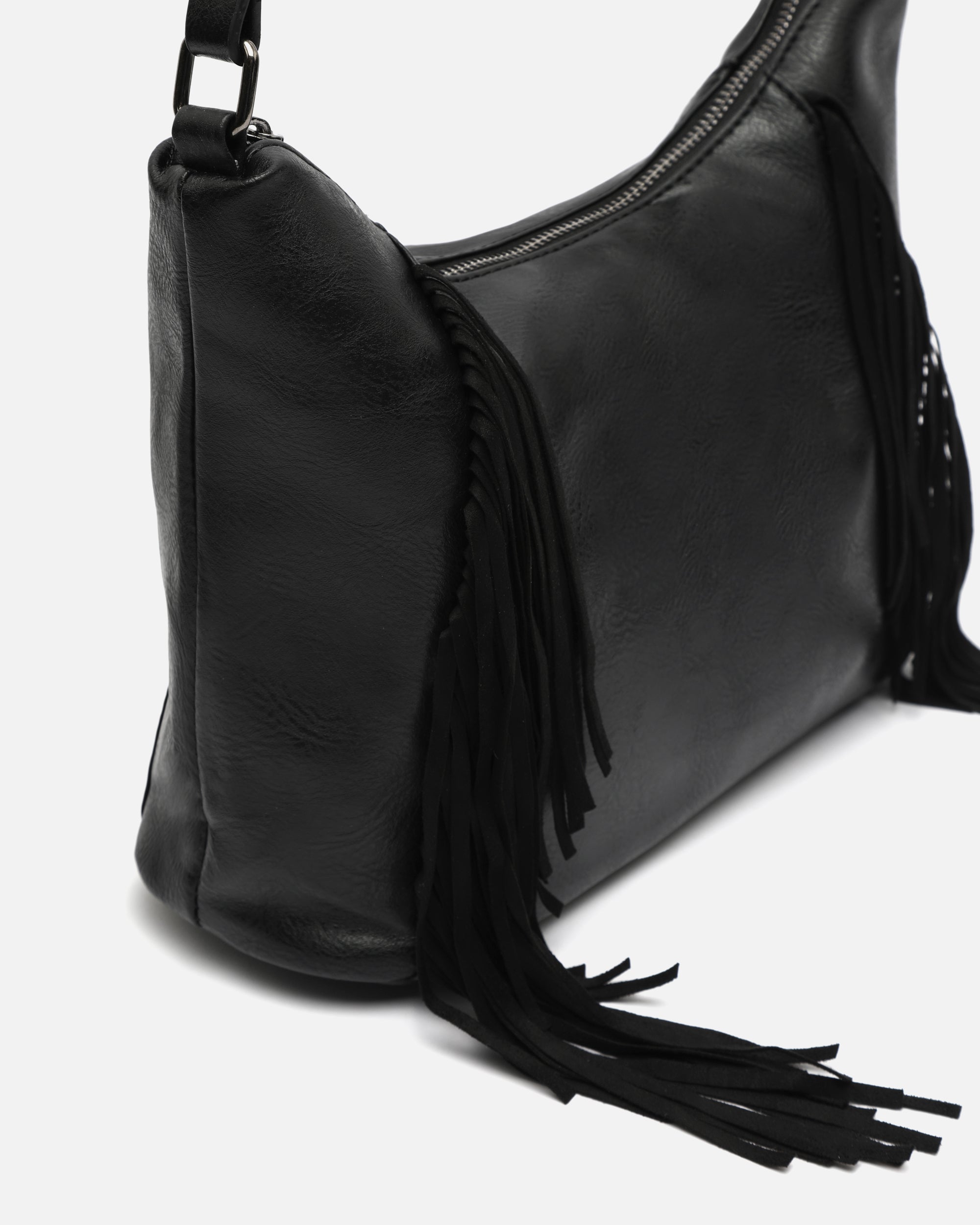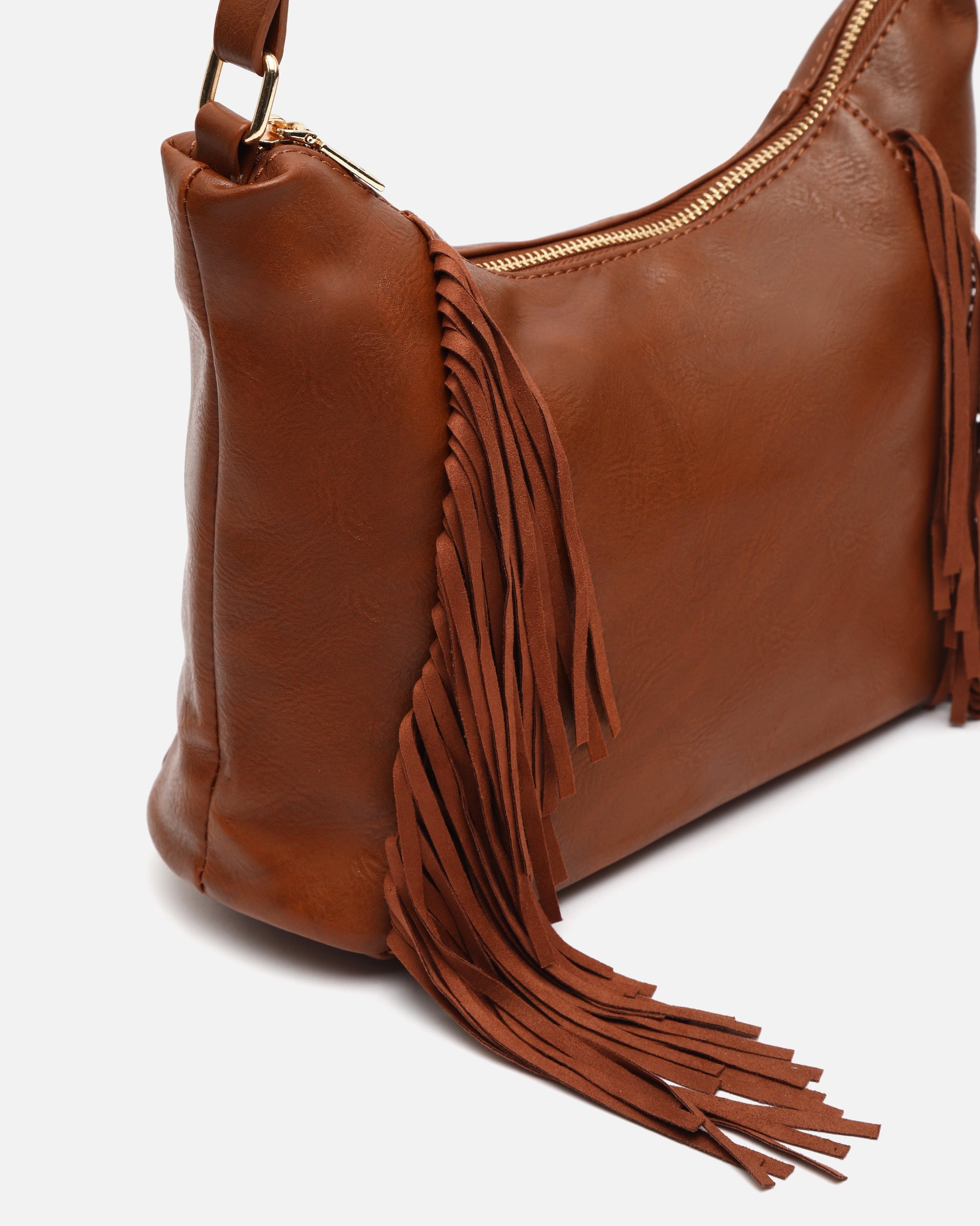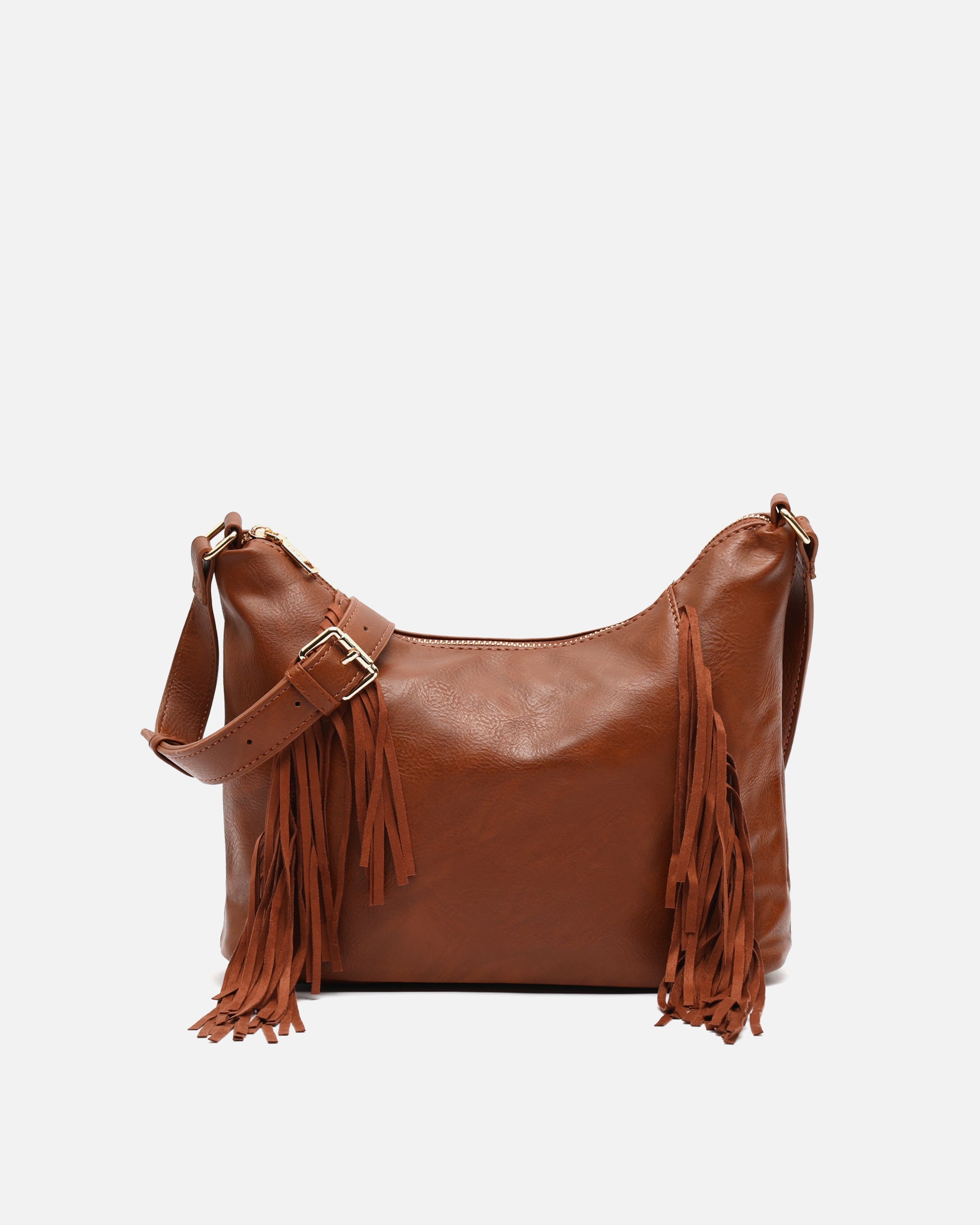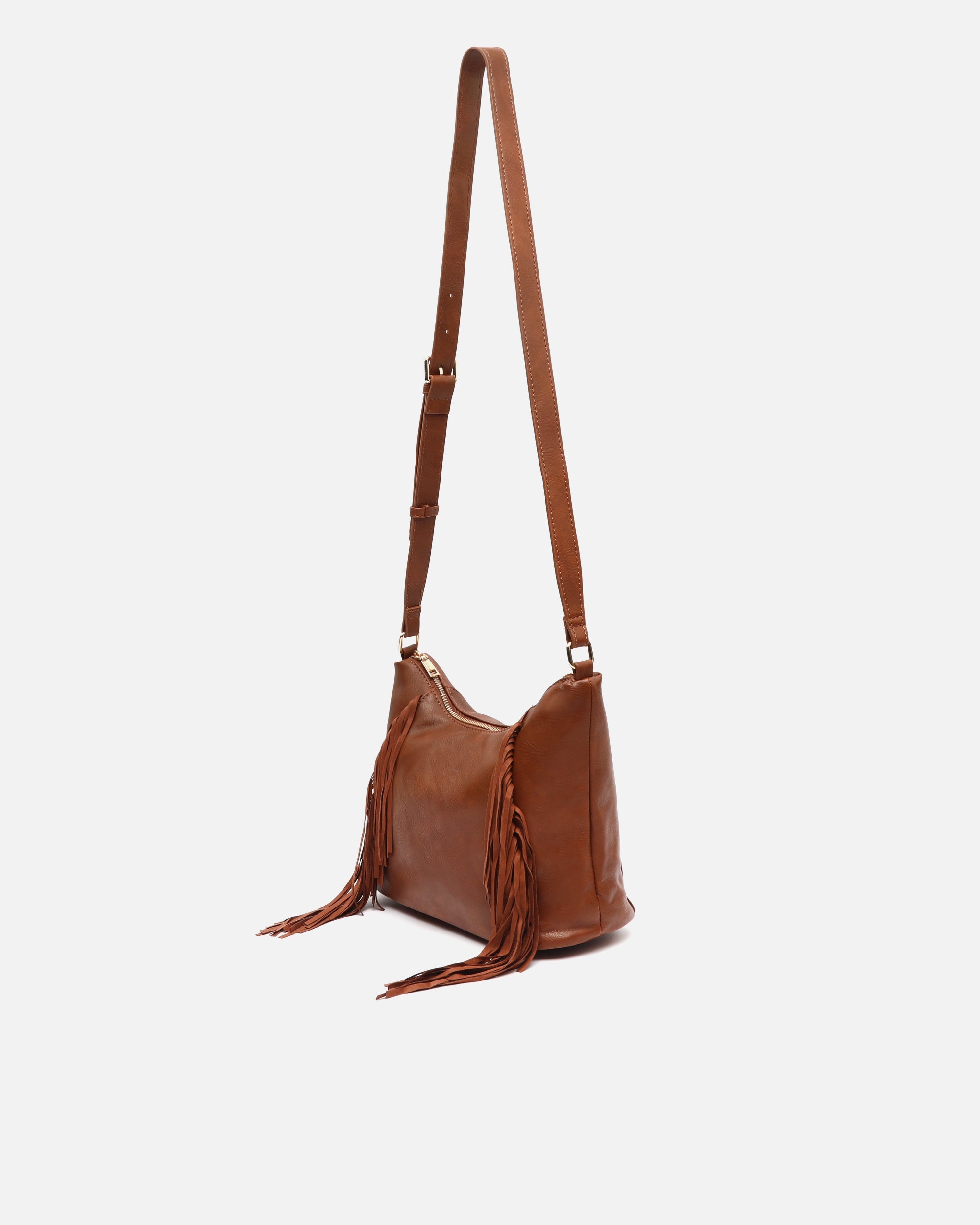 Evi by Misako is a boho-chic shoulder bag in a lightweight, easy-to-wear format. Its leather-effect design, in neutral tones, stands out for its long fringe details, which add movement and a casual air.