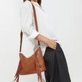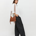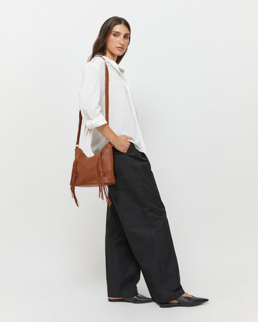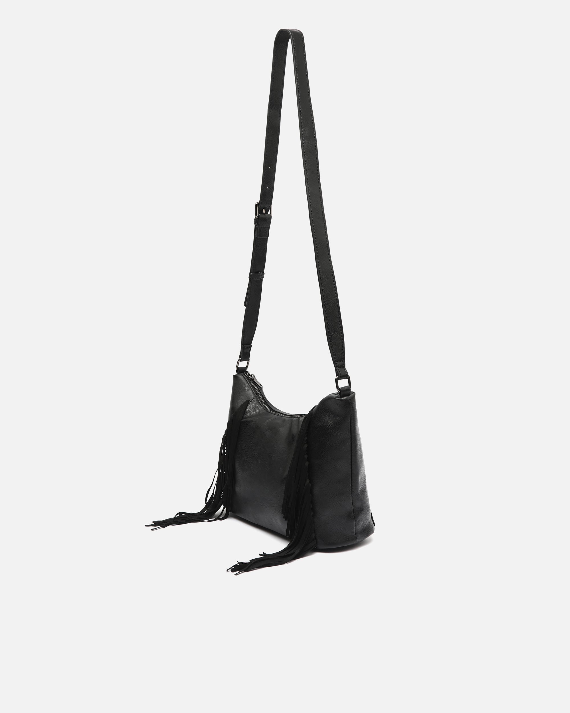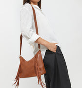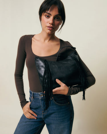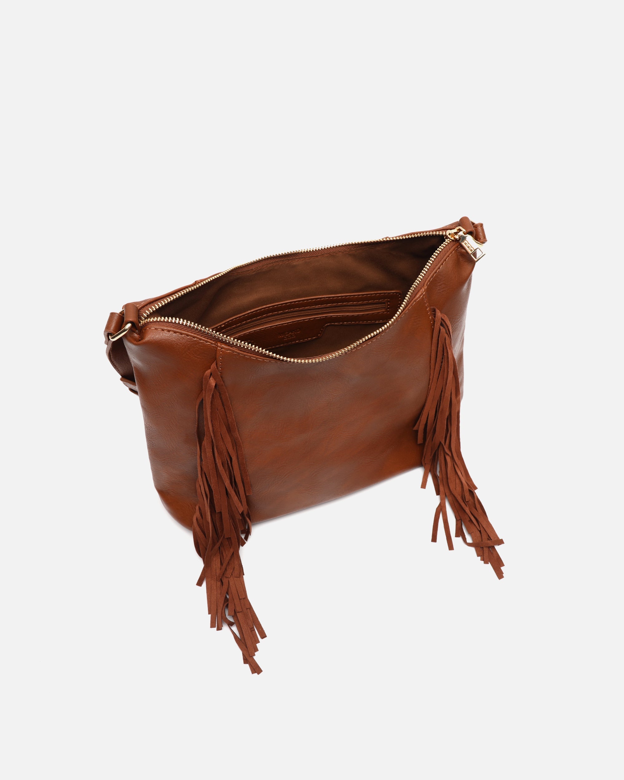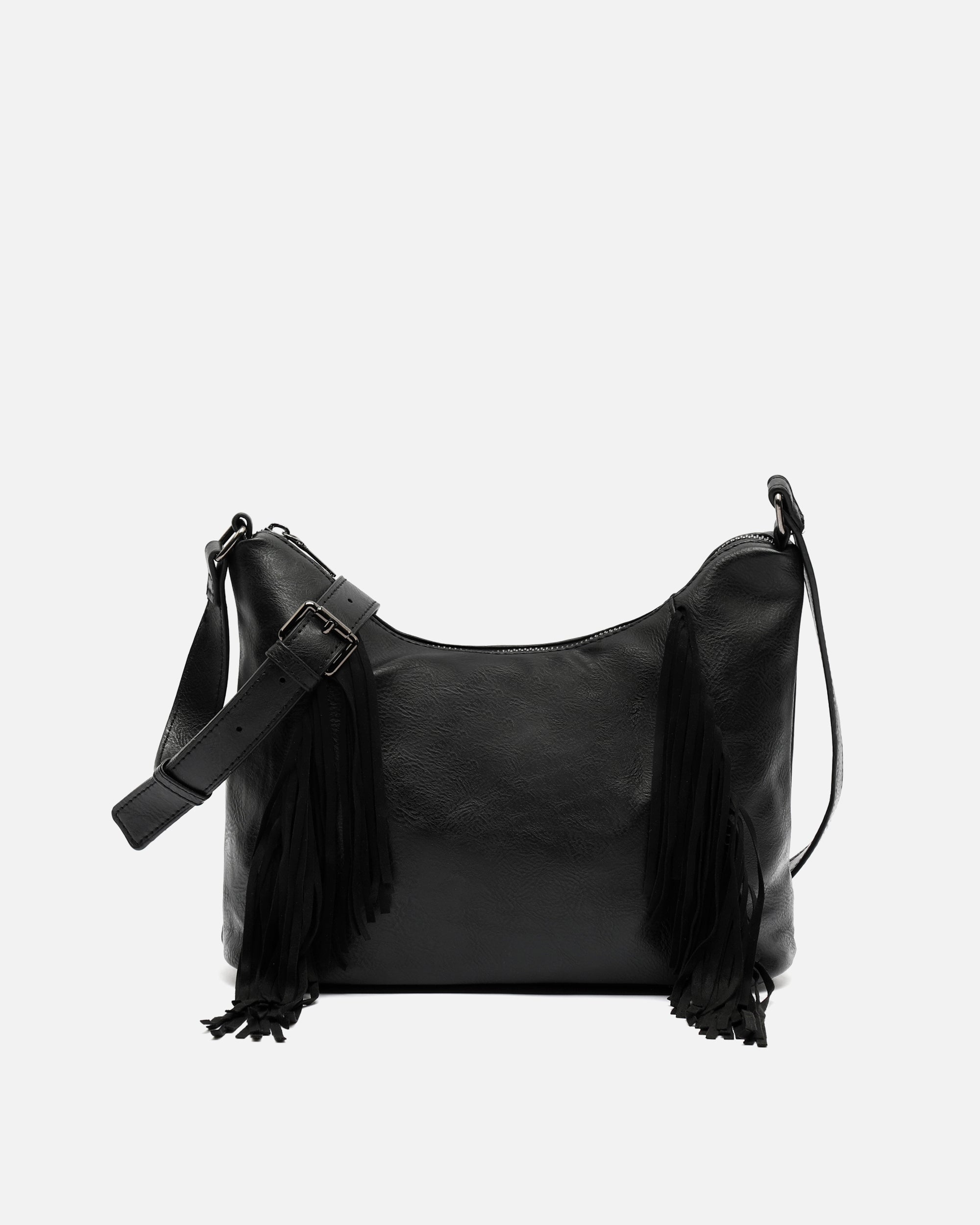 Evi by Misako is a boho-chic shoulder bag in a lightweight, easy-to-wear format. Its leather-effect design, in neutral tones, stands out for its long fringe details, which add movement and a casual air.