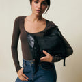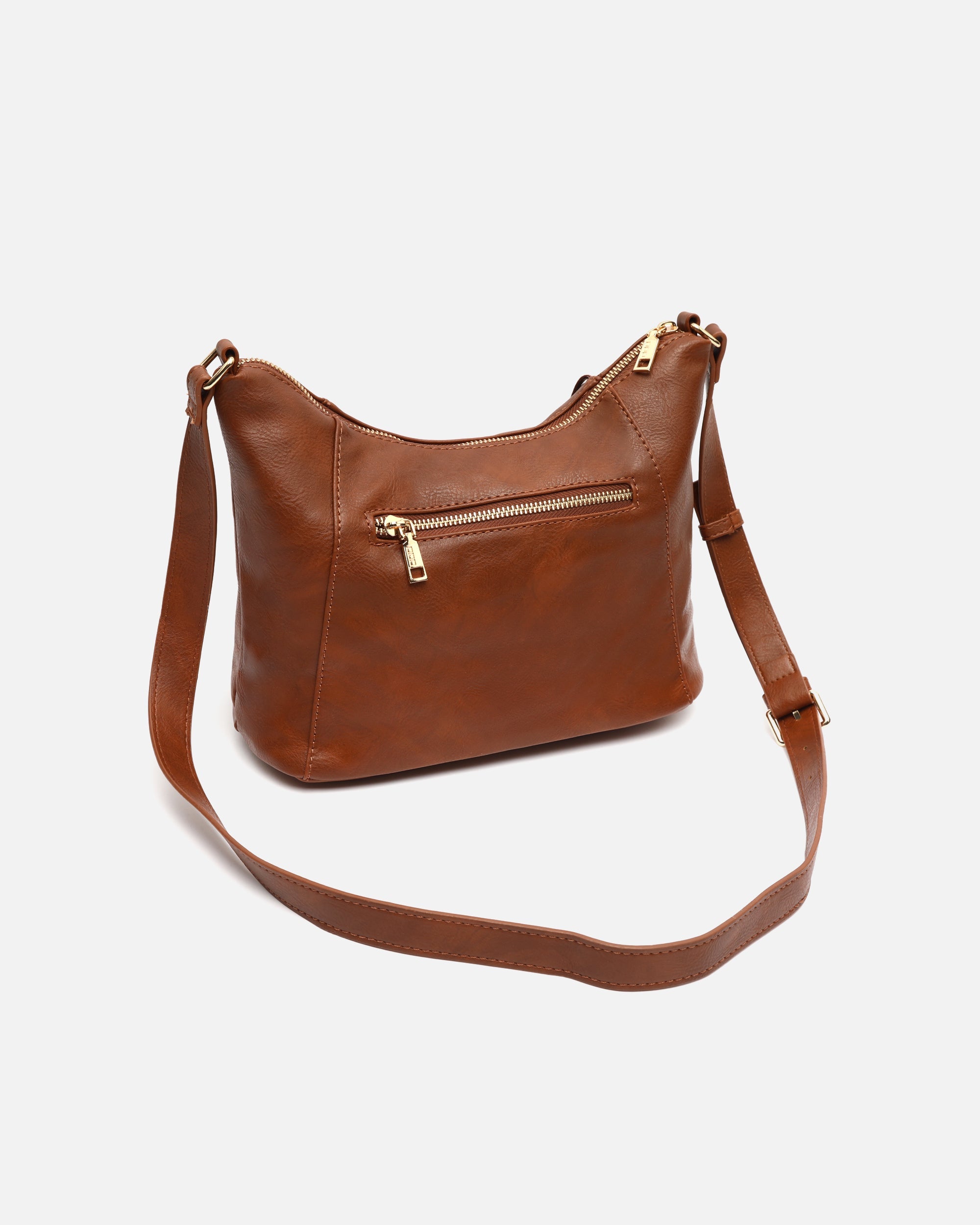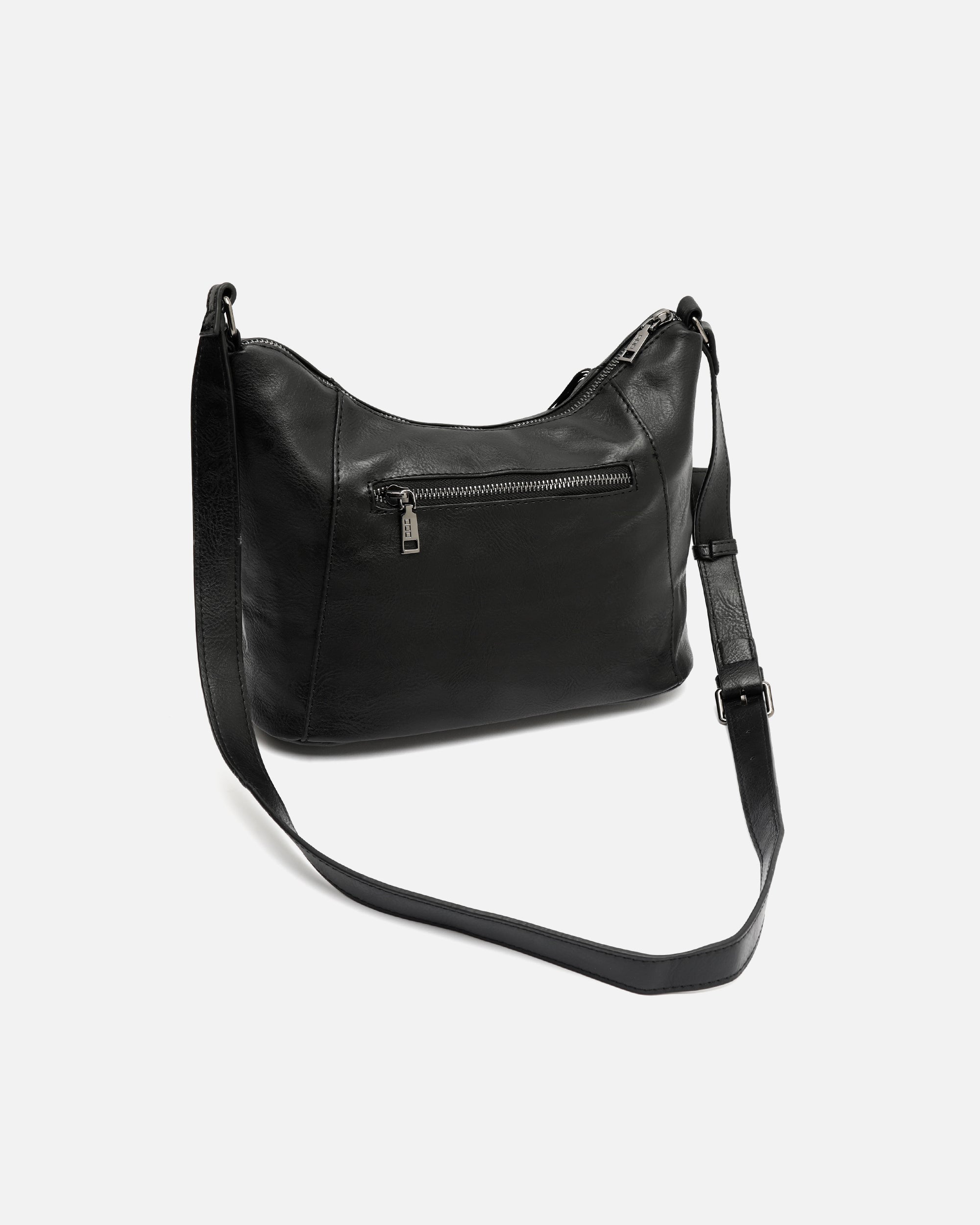 Its soft, slightly structured silhouette fits naturally to the body, ideal for those looking for a comfortable accessory. It features a main compartment with top zip and a quick-access side pocket.