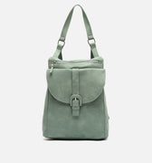 Crafted in soft-touch leather-effect fabric, it features a curved front flap, finished with a decorative tone-on-tone strap and buckle that enhances its design. It features strategically placed pockets, a practical dual closure system and a hidden front pocket under the flap with a magnetic clasp for added security.