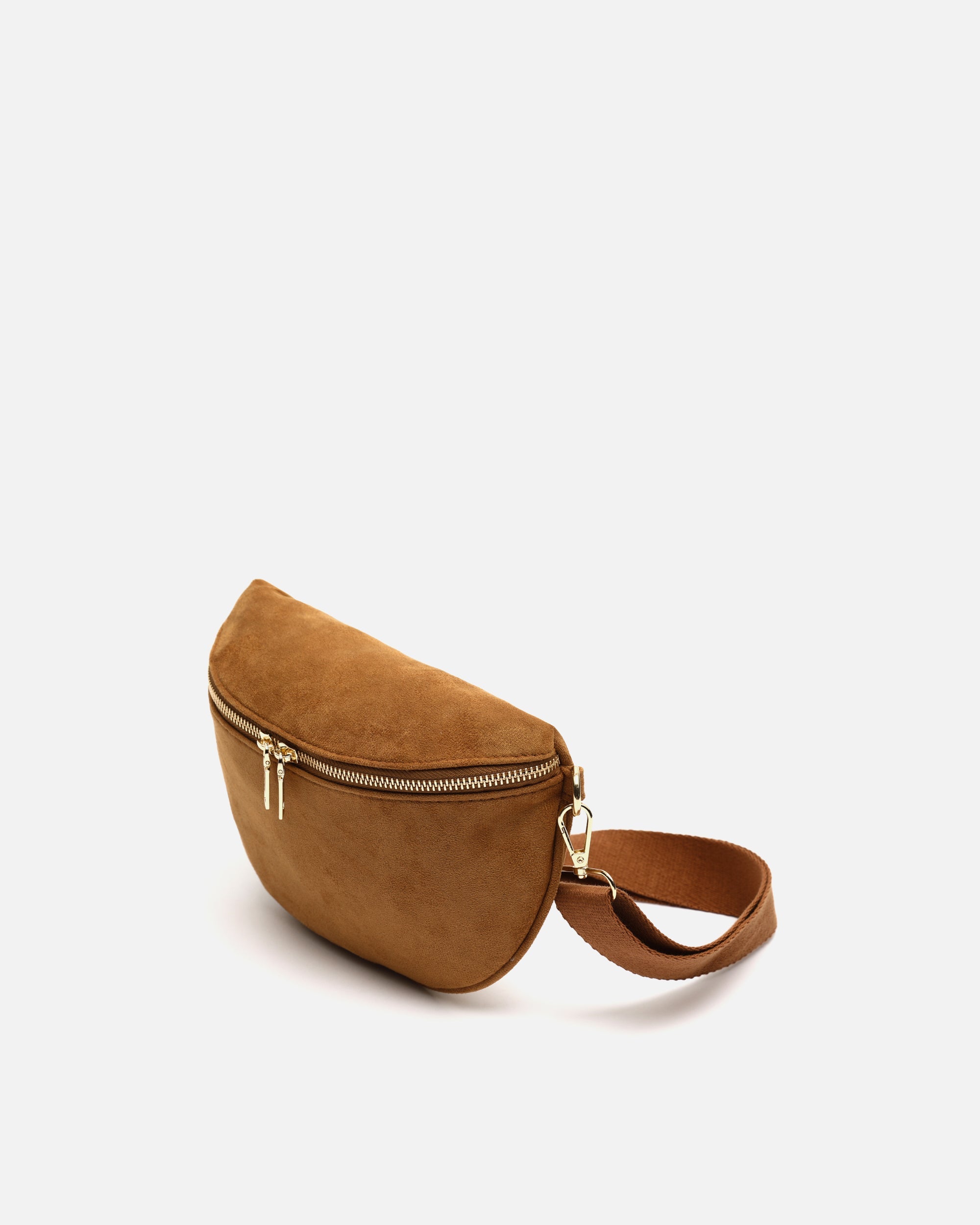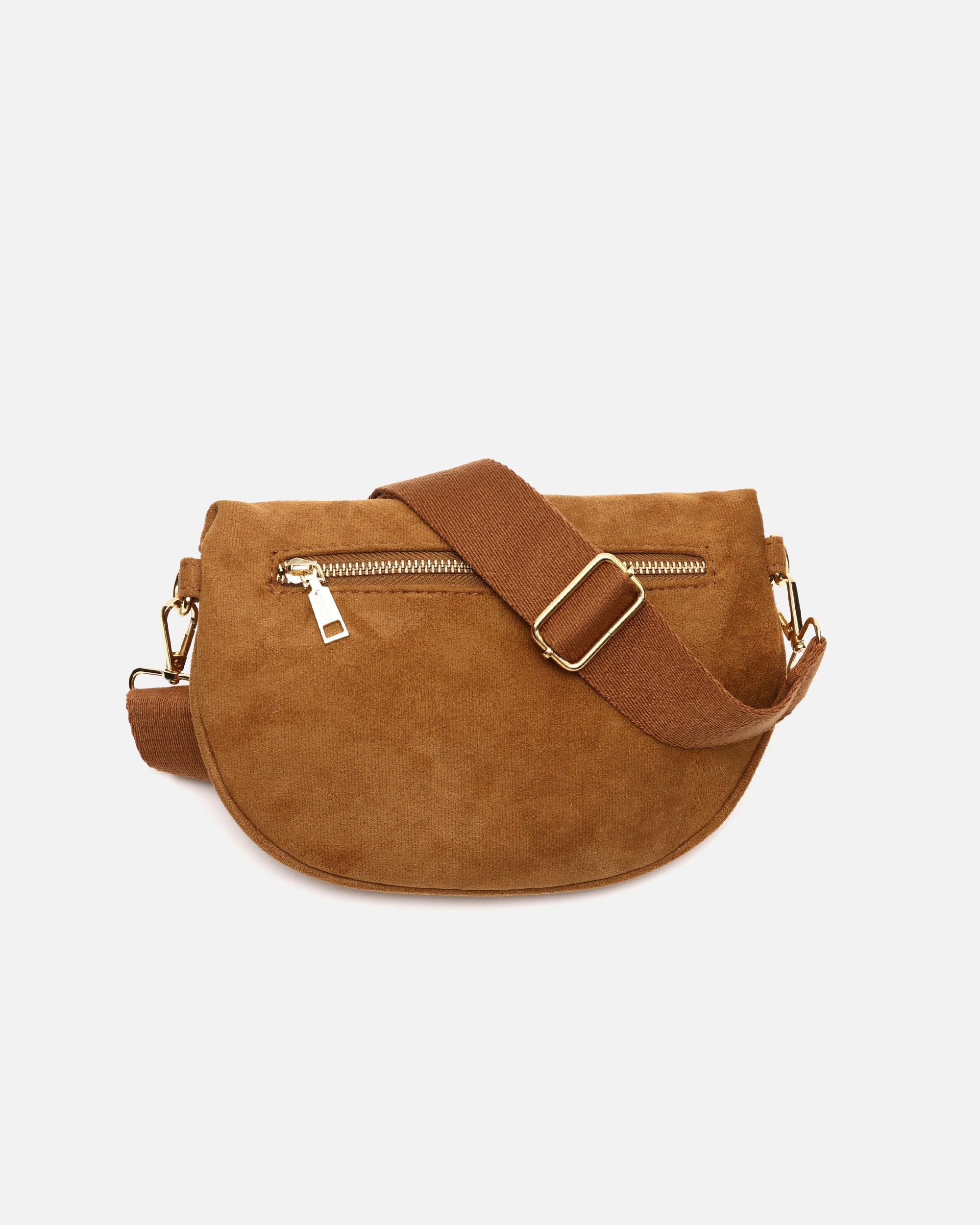 Made from suede-effect fabric, it stands out for its velvety finish, soft to the touch, and its warm tone that adds character and combines with all kinds of outfits. On the outside, its clean design is enhanced by metal zips and thoughtful details such as the elegant gold-coloured handles.