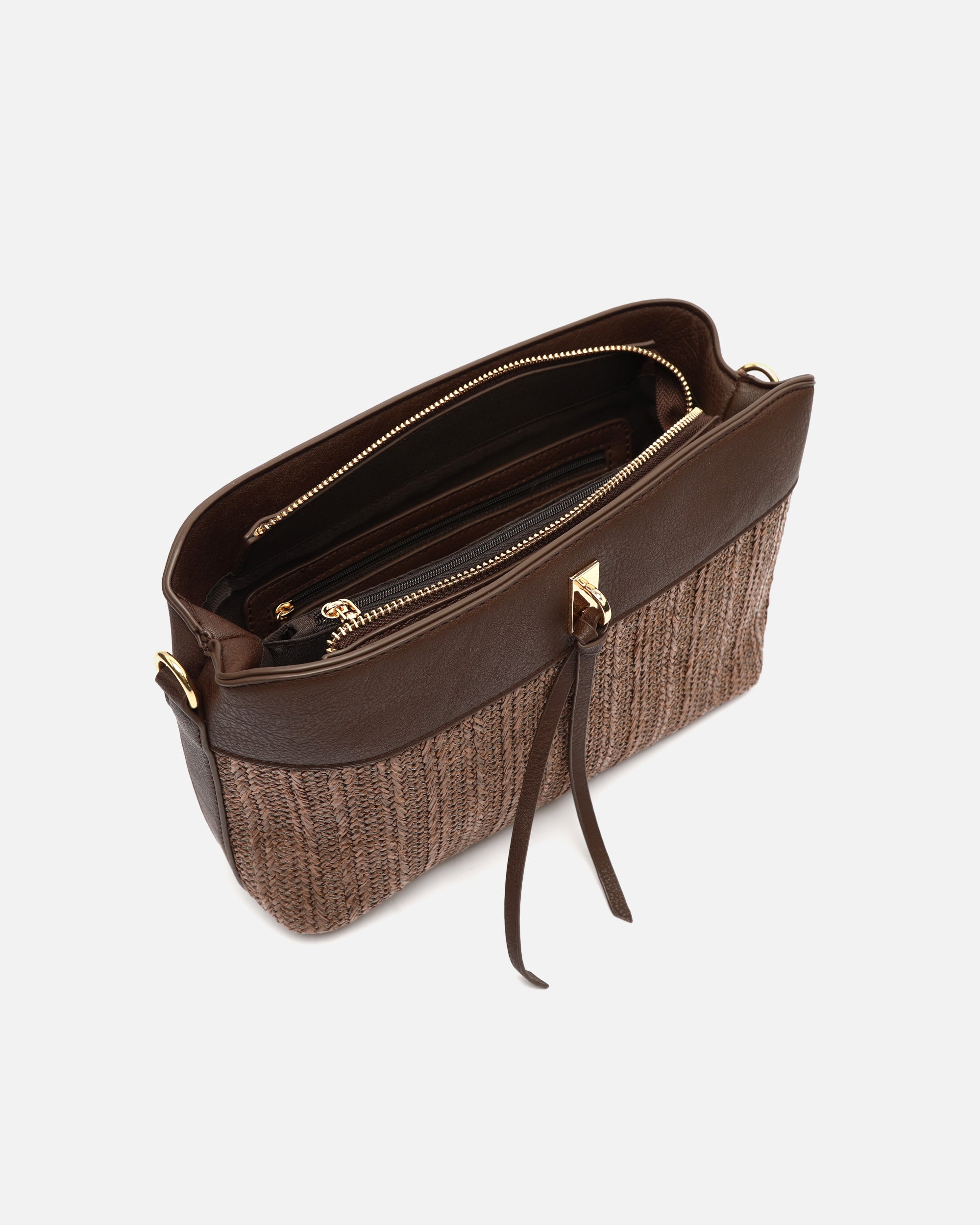 Ce petit sac à bandoulière à effet raphia ajoute style et fonctionnalité à vos tenues printemps-été. Il est doté d'un compartiment principal qui comprend une poche intérieure zippée au centre, idéale pour garder vos objets essentiels en toute sécurité. Il offre également plus d'espace sur les côtés pour vos autres affaires. Sa fermeture à glissière permet de sécuriser vos effets personnels tout en garantissant un accès rapide et pratique. Il est également doté d'une bandoulière réglable et amovible qui vous permet de le porter confortablement selon vos préférences.