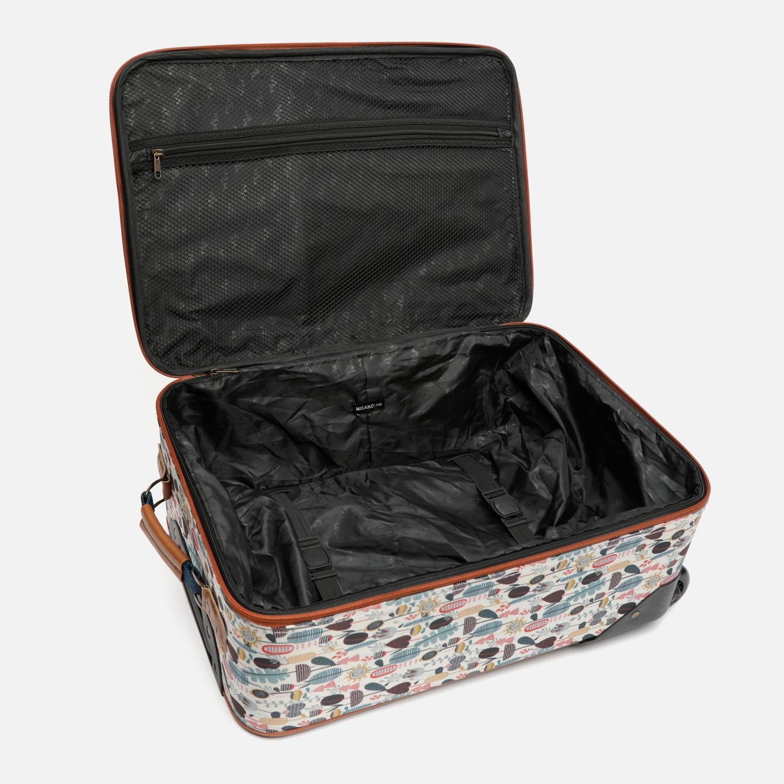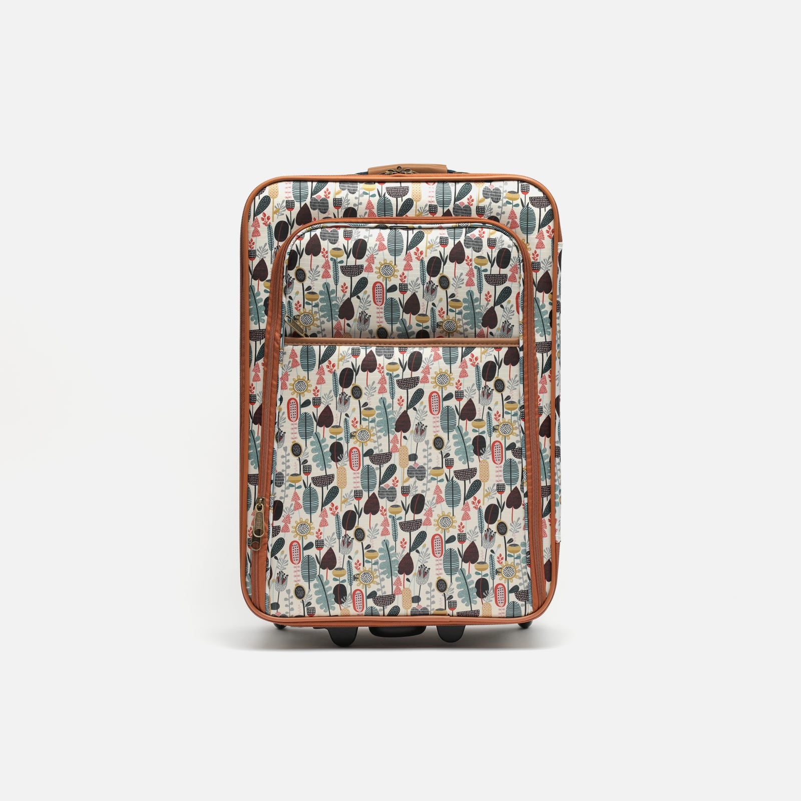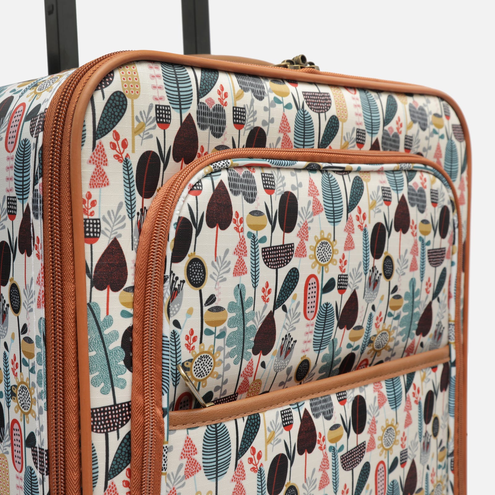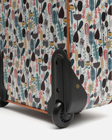 Son extérieur présente un imprimé floral et végétal accrocheur dans des tons chauds, parfait pour les aéroports ou toute autre destination.