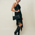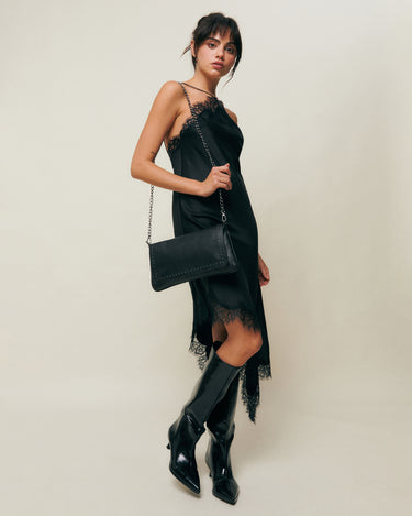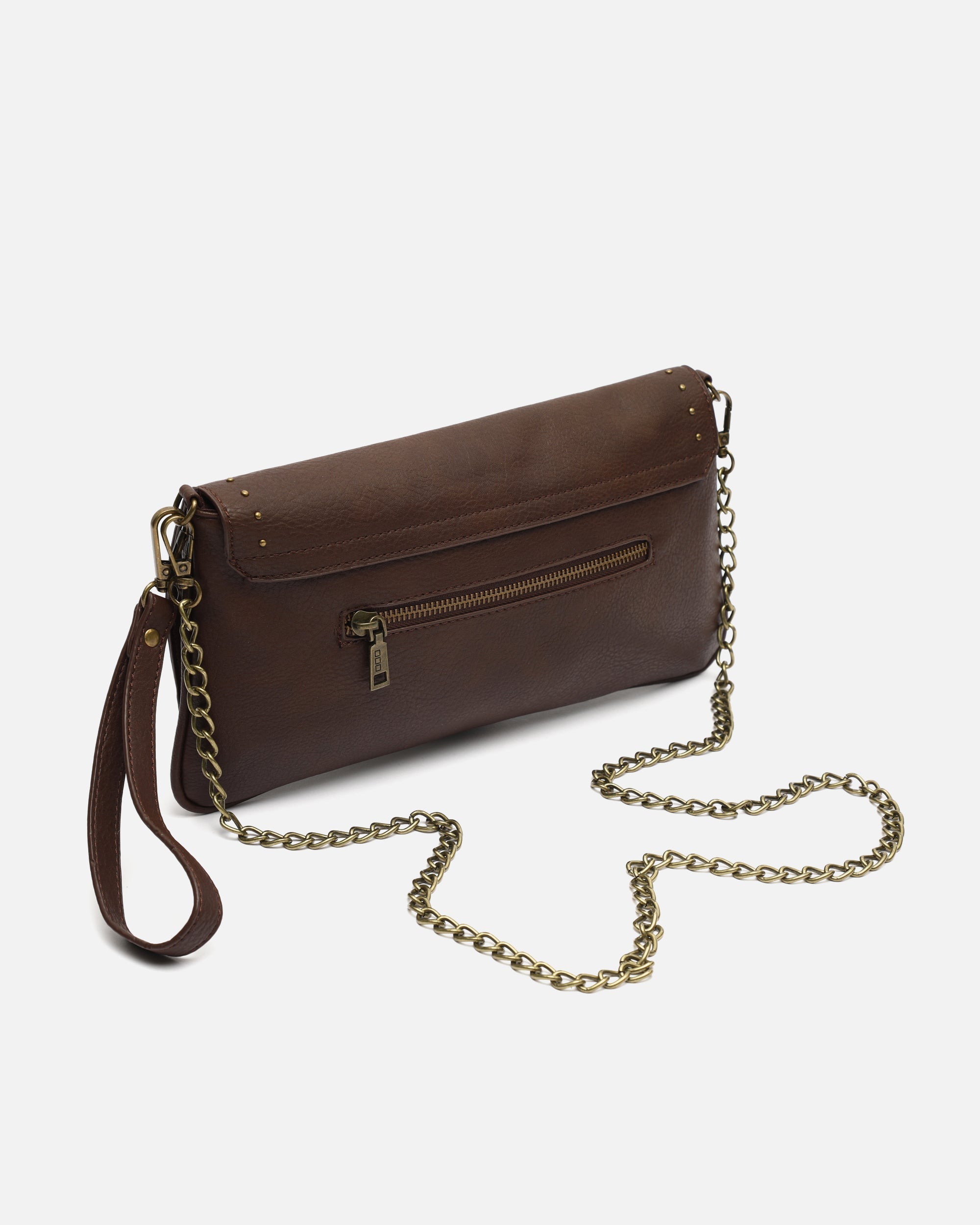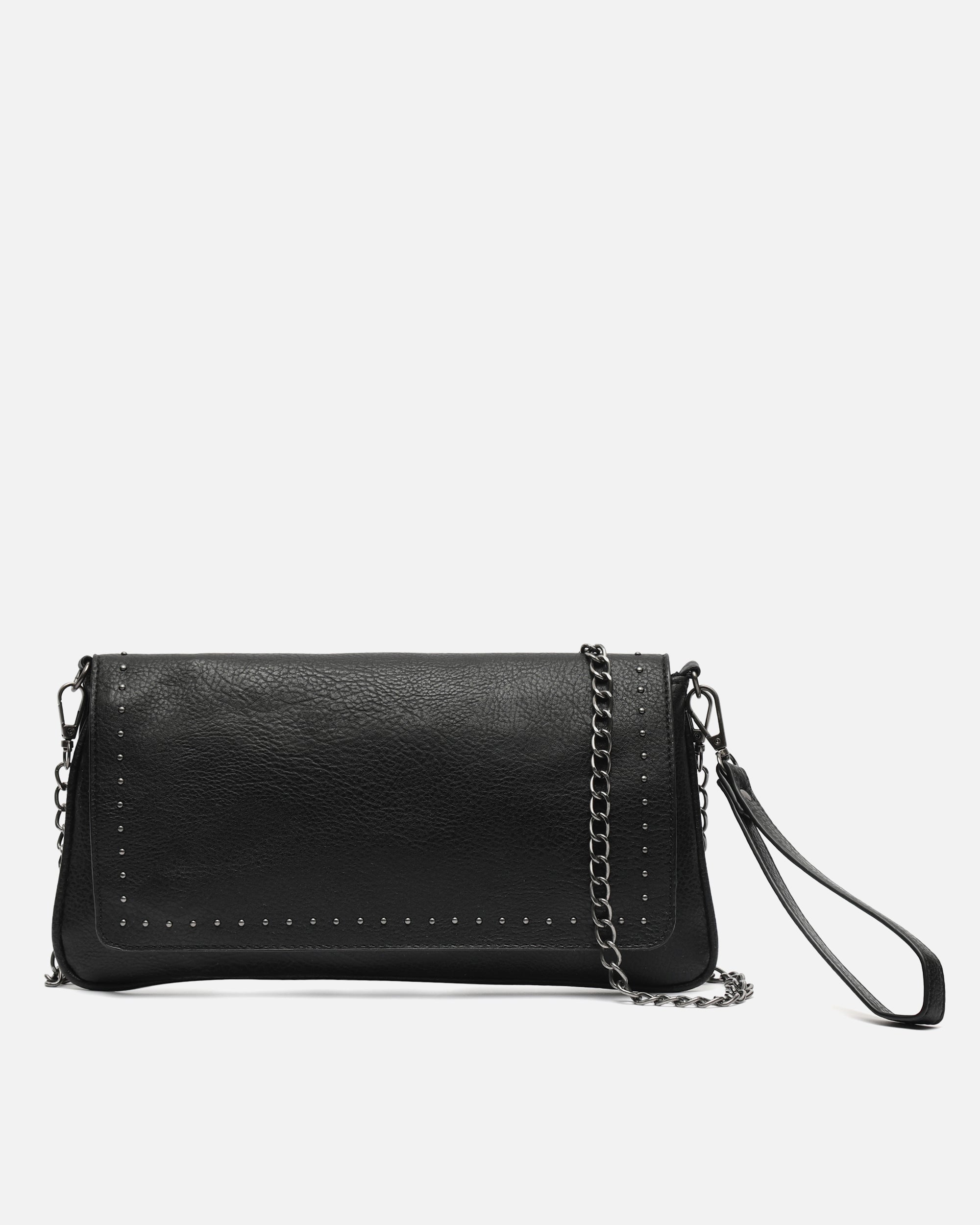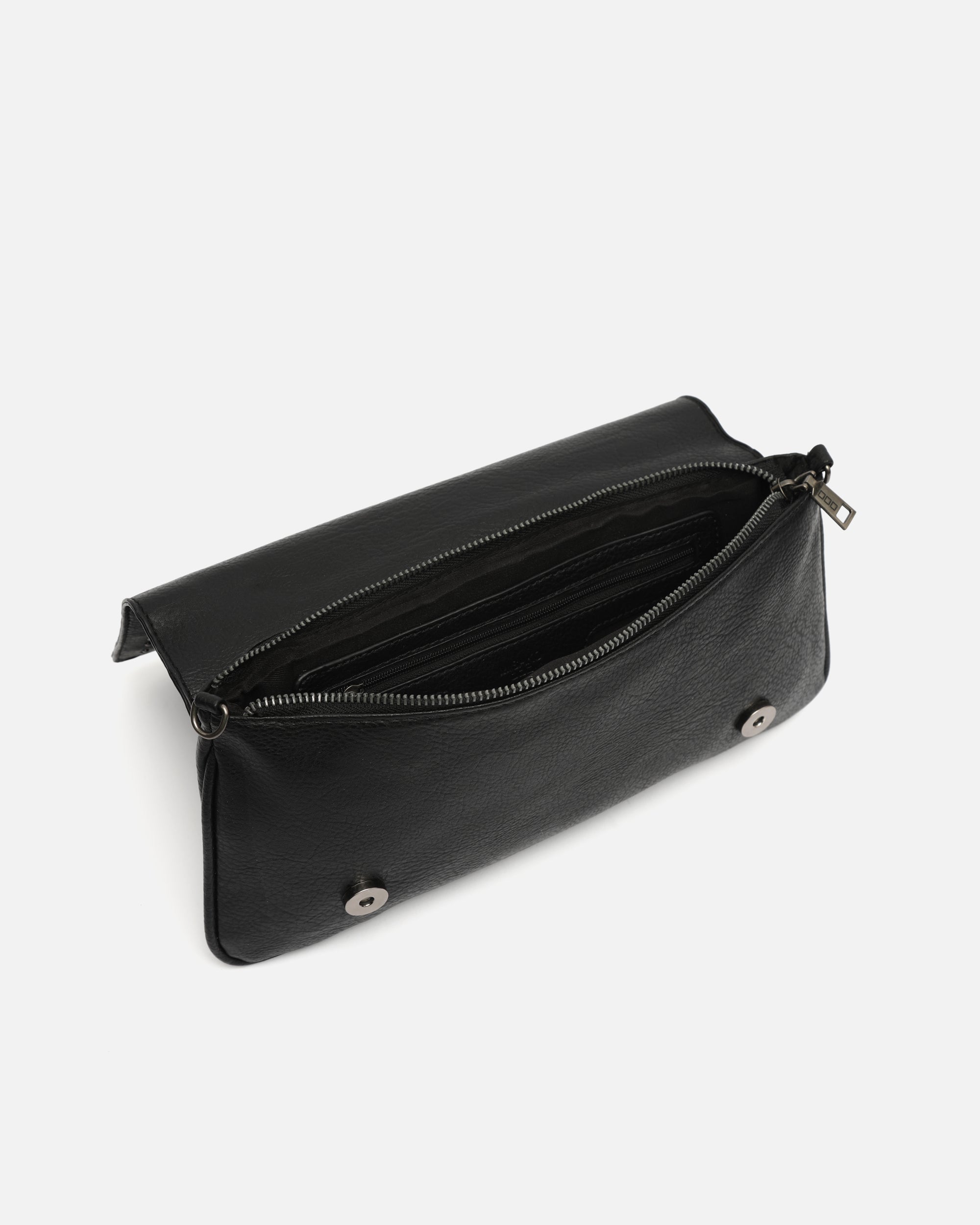 À l'extérieur, un élégant rabat avant avec de subtils détails métalliques rehausse son design sophistiqué, tandis que les fermoirs magnétiques protègent vos essentiels. Sa bandoulière en chaîne argentée amovible vous permet de le porter confortablement à l'épaule, et la poignée latérale vous offre la possibilité de l'utiliser comme une pochette. À l'arrière, une poche zippée permet d'accéder rapidement à l'essentiel et à l'intérieur, un autre compartiment vous aide à tout ranger.