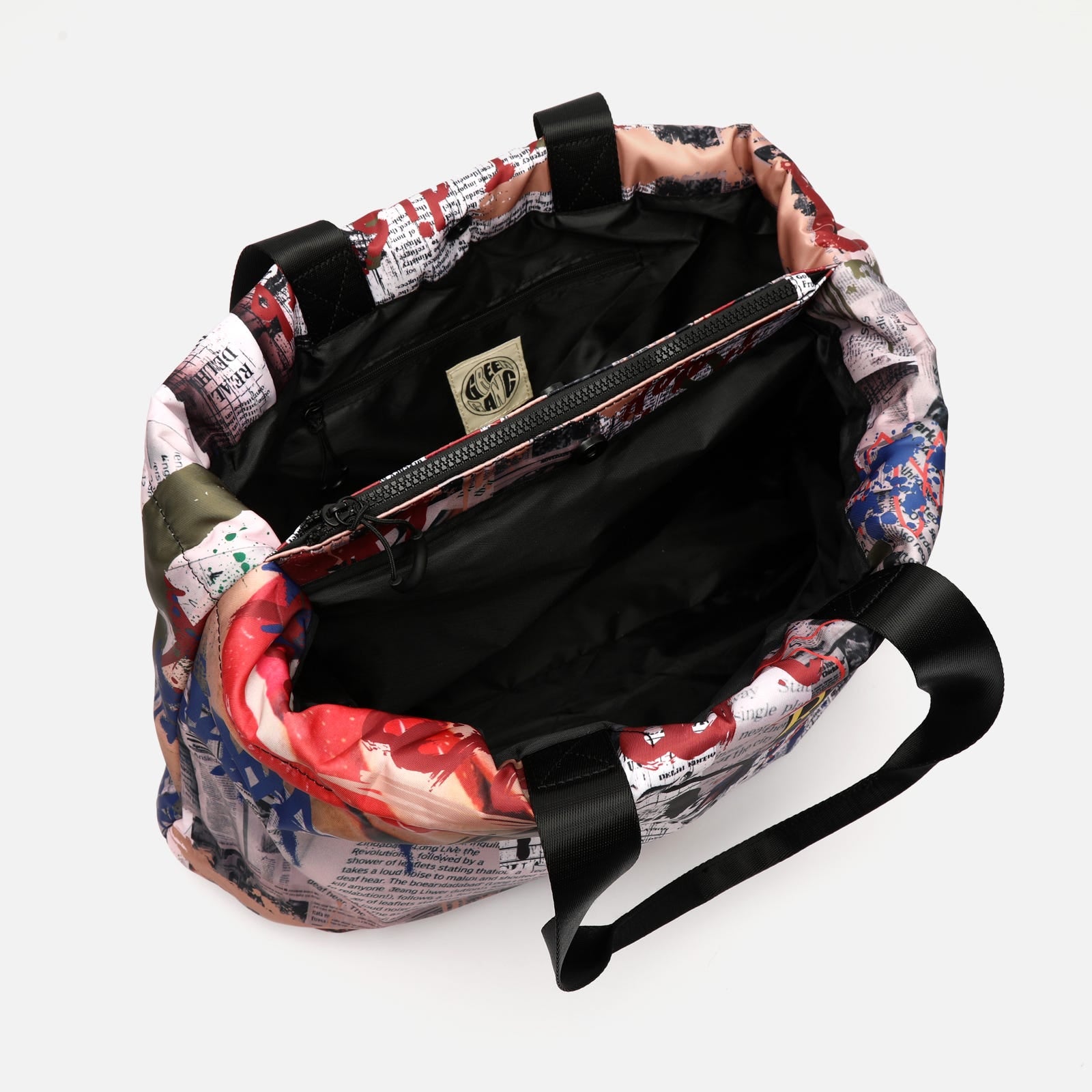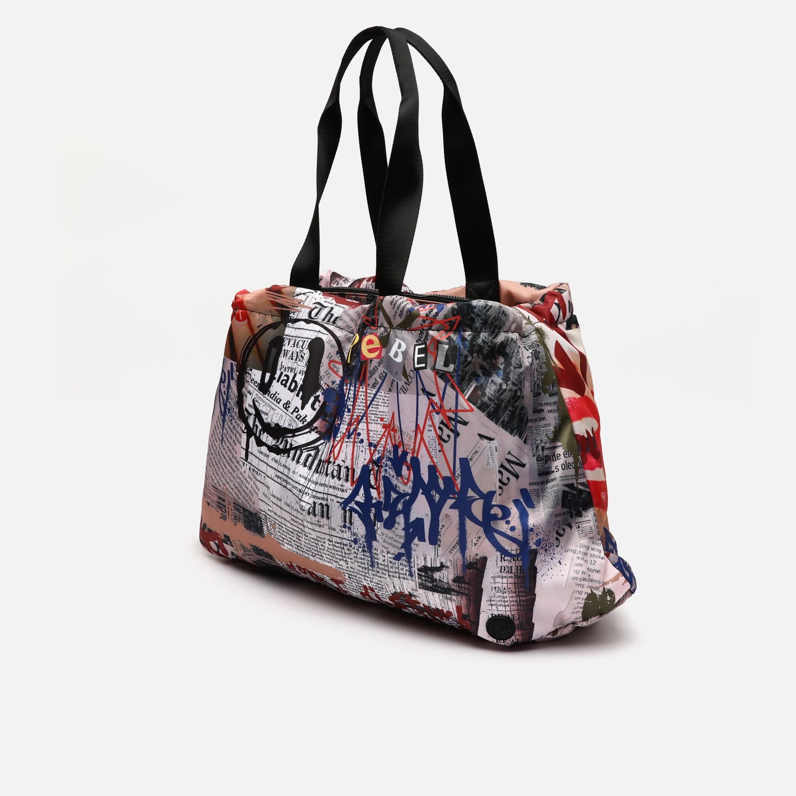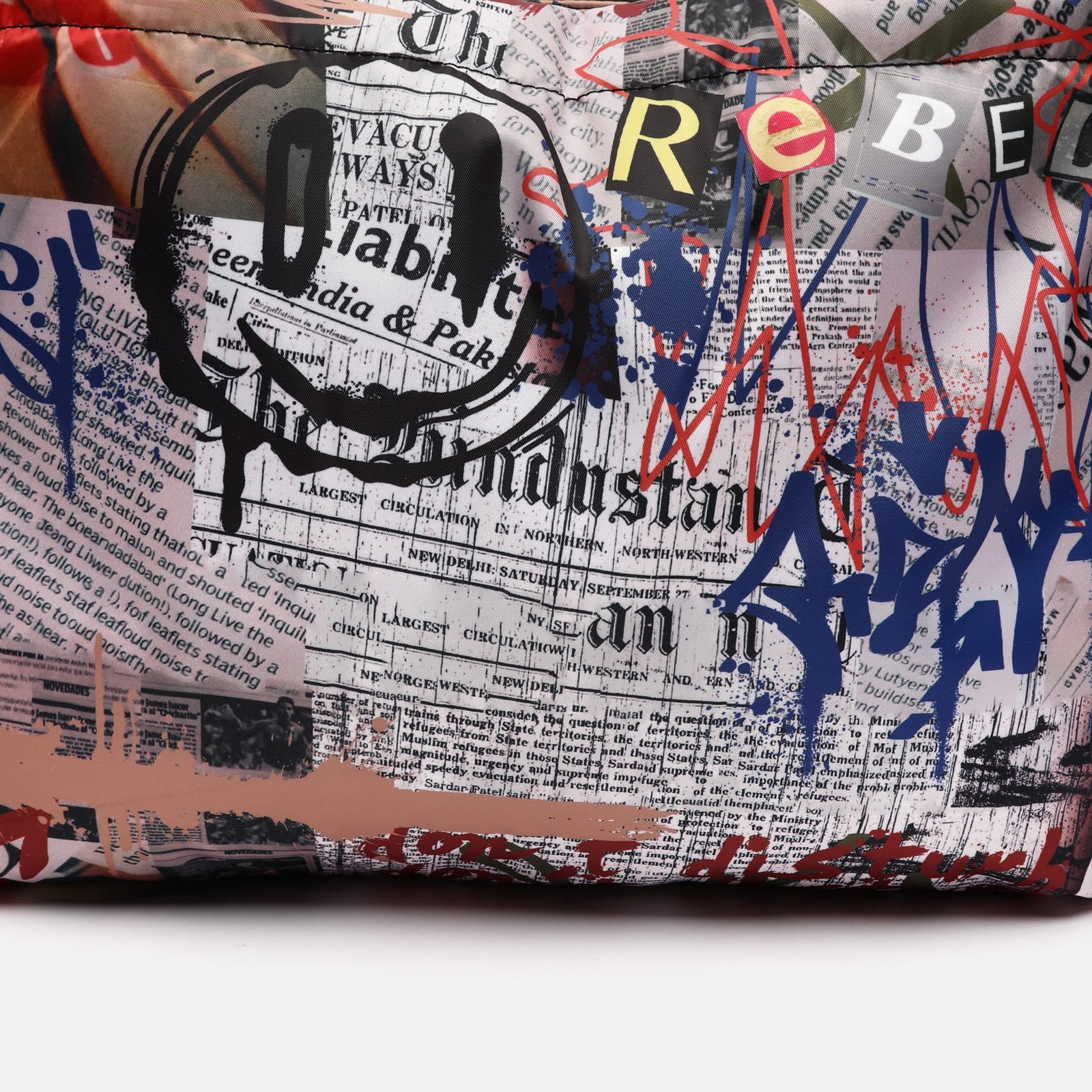 Ce grand sac à bandoulière en nylon recyclé présente un imprimé urbain moderne qui lui confère une touche unique. Son compartiment principal est spacieux et pratique, avec une poche intérieure zippée pour ranger vos affaires. Les côtés offrent un espace supplémentaire et la fermeture à bouton magnétique permet d'accéder rapidement à vos affaires. Idéal pour un usage quotidien.