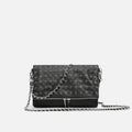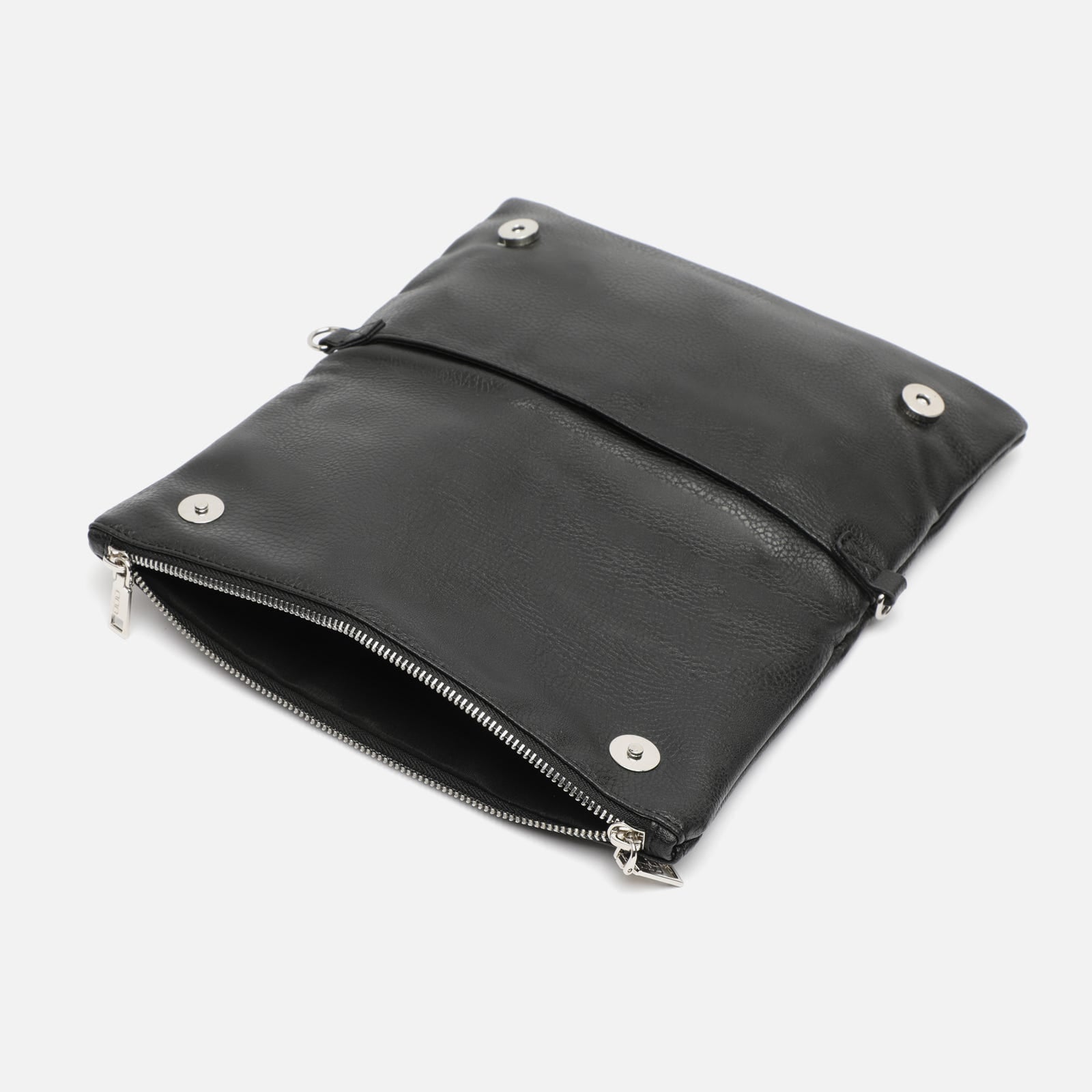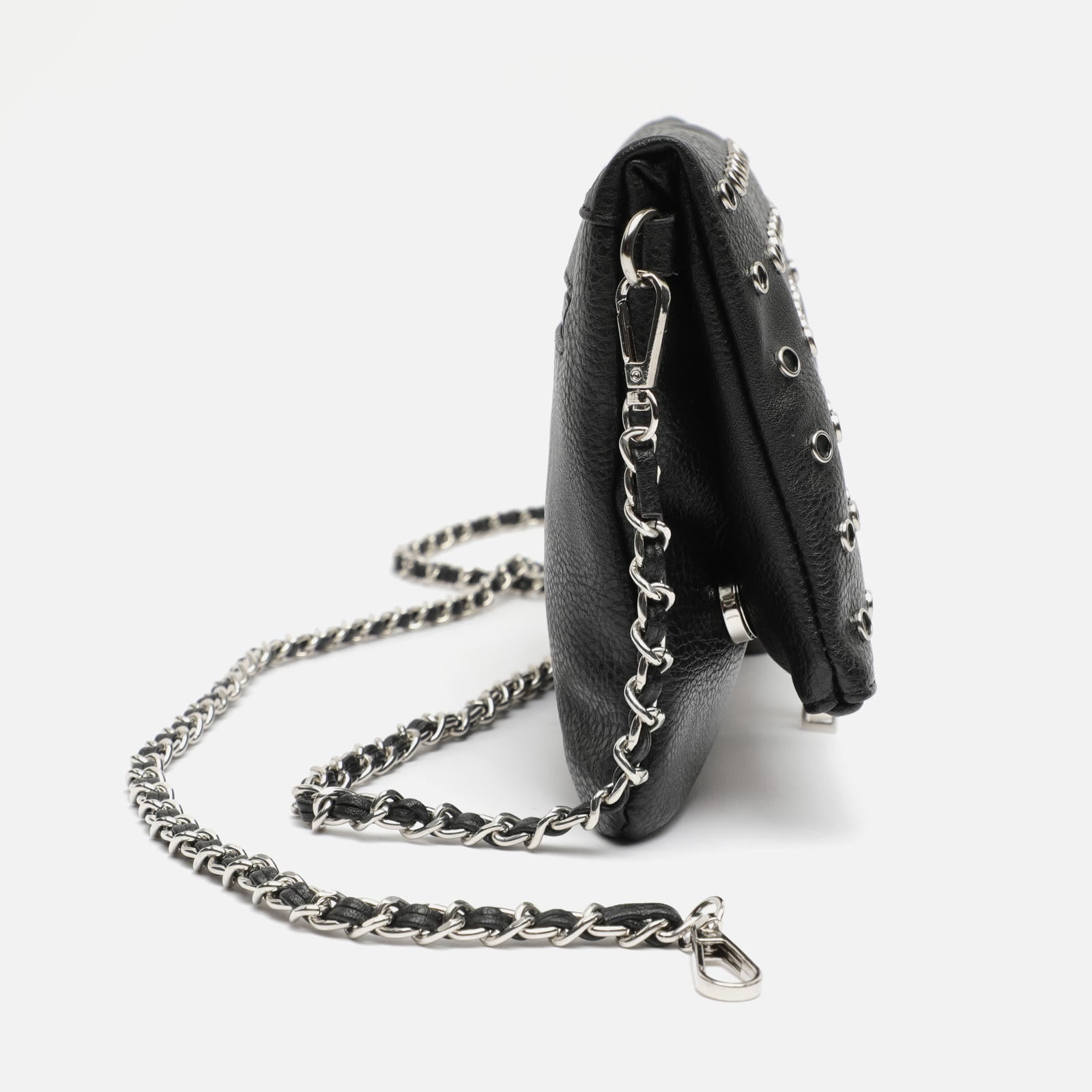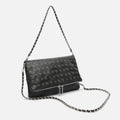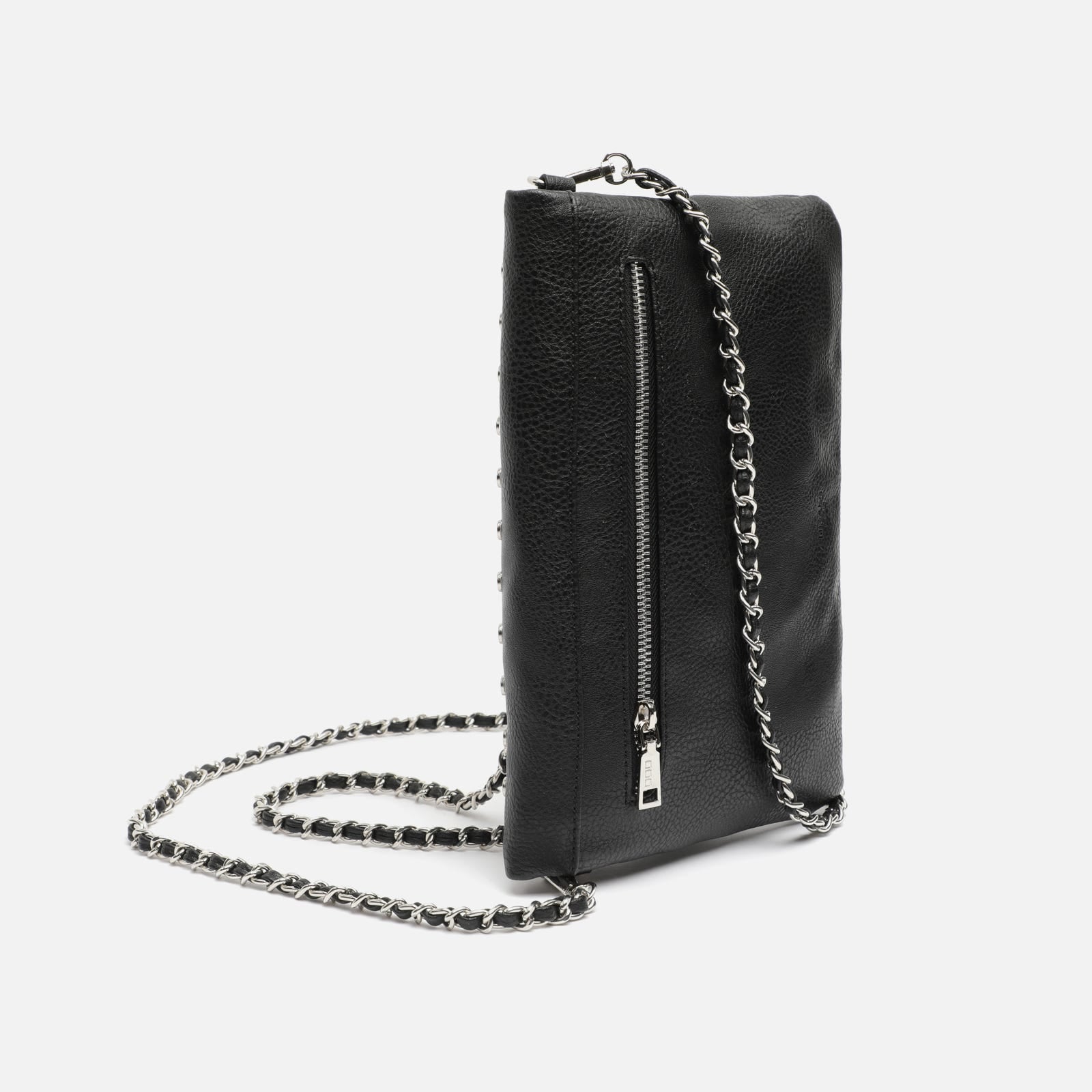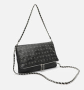 La touche finale est apportée par les remarquables bandoulières, l'une longue et l'autre courte avec des maillons argentés entrelacés avec une lanière en similicuir, toutes deux détachables et réglables pour un portage à l'épaule, en travers du corps ou en pochette.