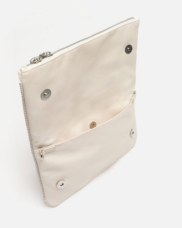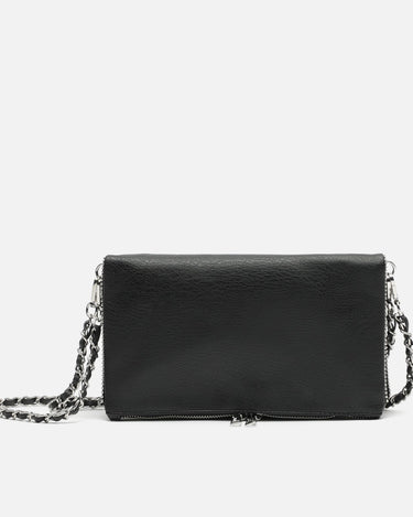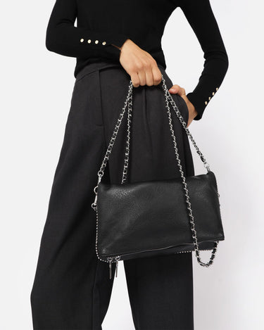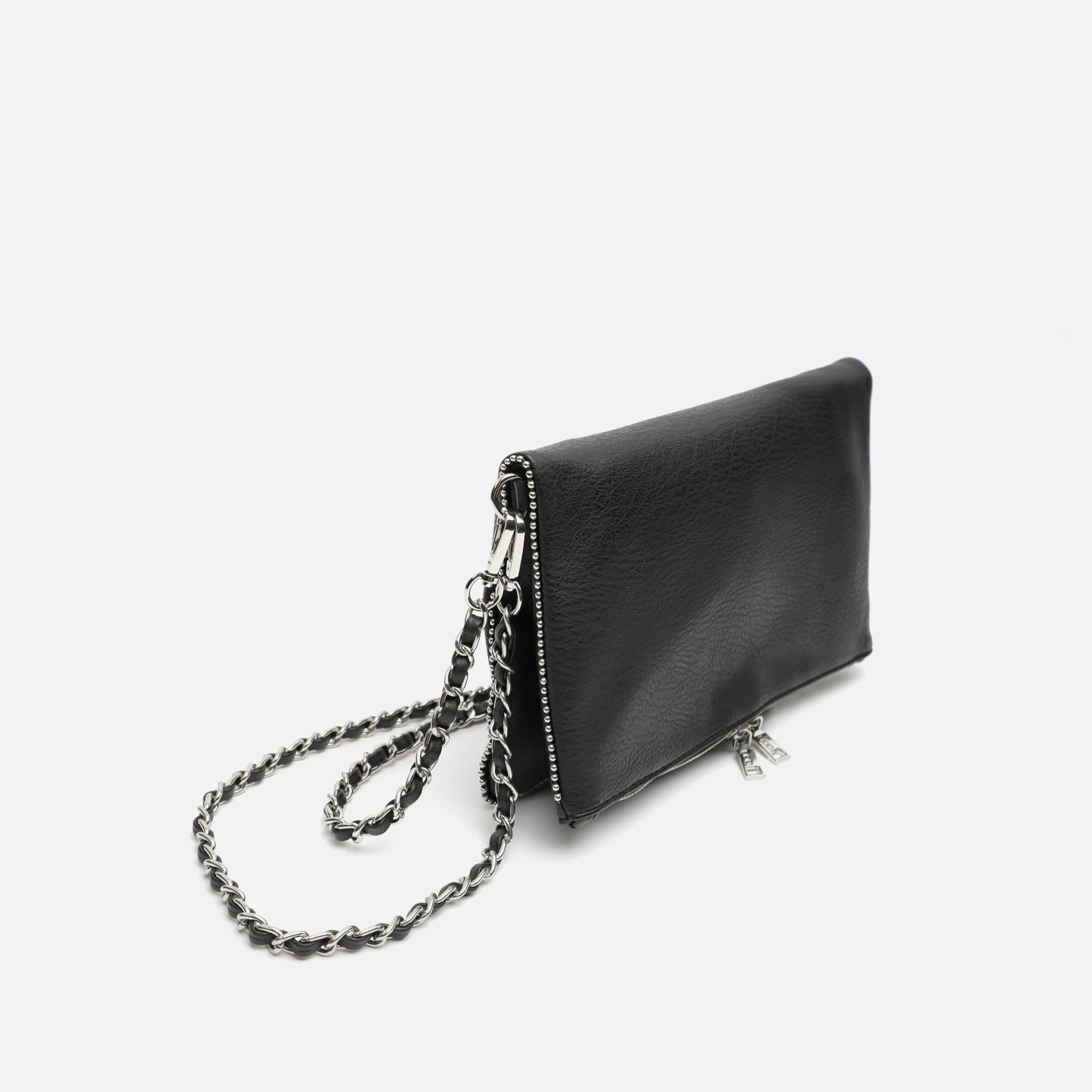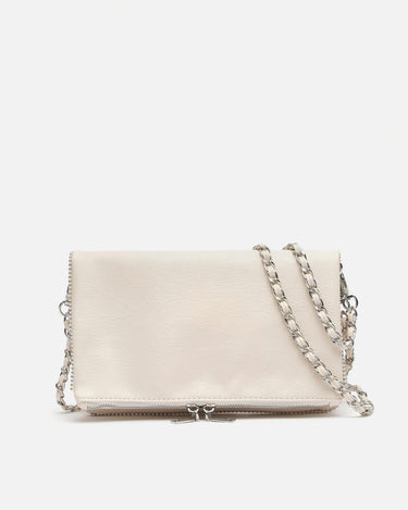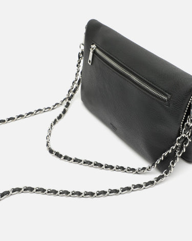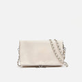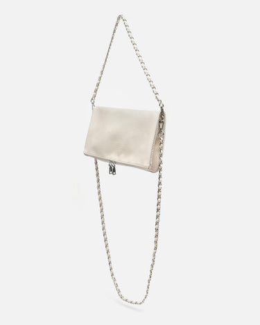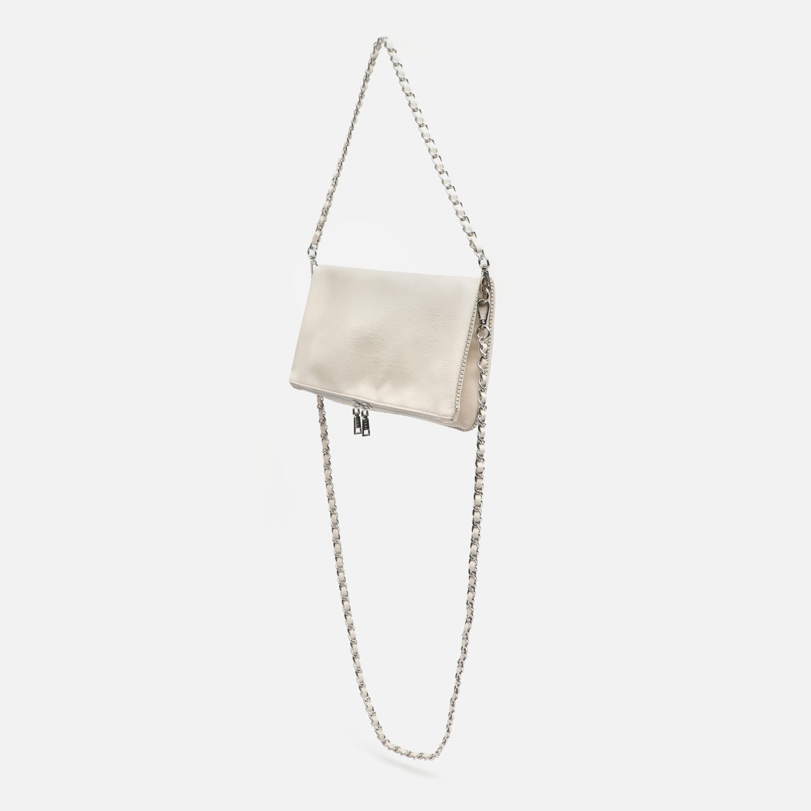 La doppia zip metallica sul fondo separa lo scomparto principale, ideale per riporre gli oggetti da tenere a portata di mano senza dover aprire l'intera borsa. Il suo corpo rettangolare, realizzato in pelle, è completato da finiture argentate e catene intrecciate che esaltano il design originale di questo accessorio.