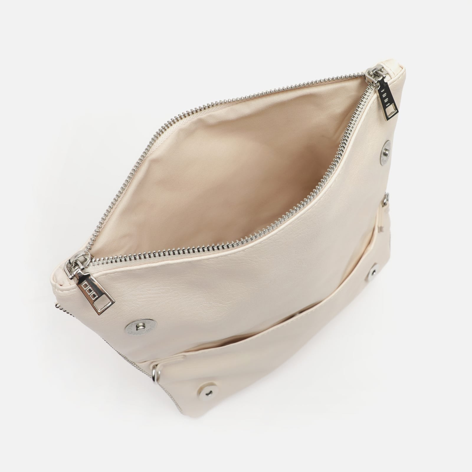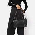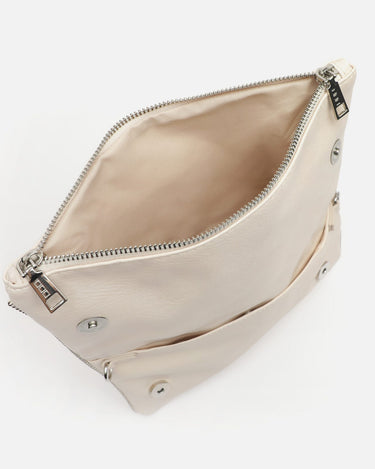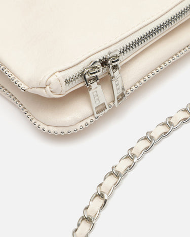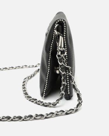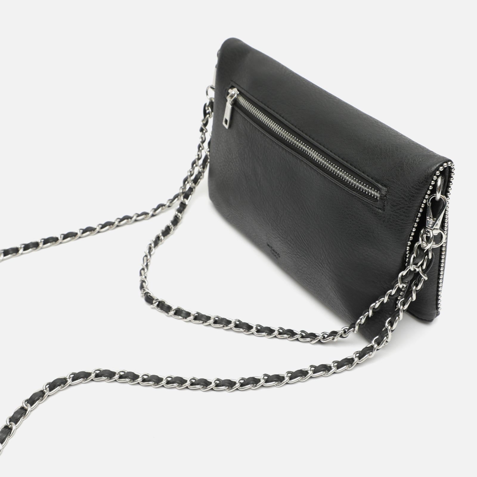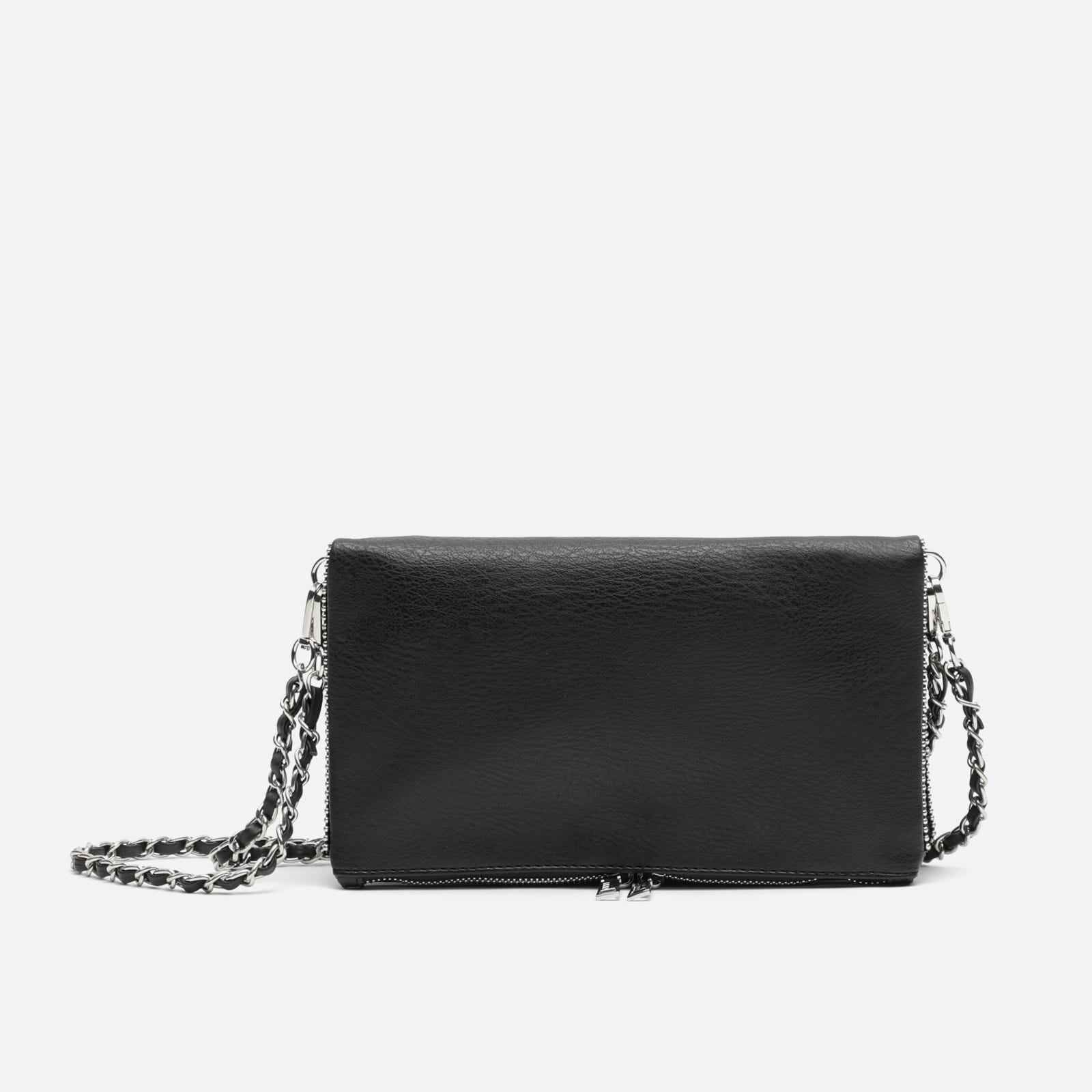 La doppia zip metallica sul fondo separa lo scomparto principale, ideale per riporre gli oggetti da tenere a portata di mano senza dover aprire l'intera borsa. Il suo corpo rettangolare, realizzato in pelle, è completato da finiture argentate e catene intrecciate che esaltano il design originale di questo accessorio.