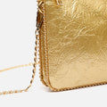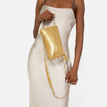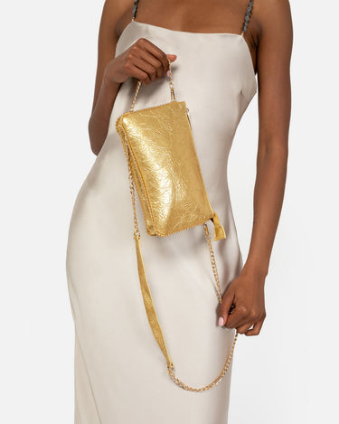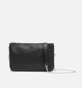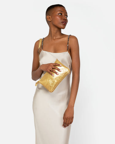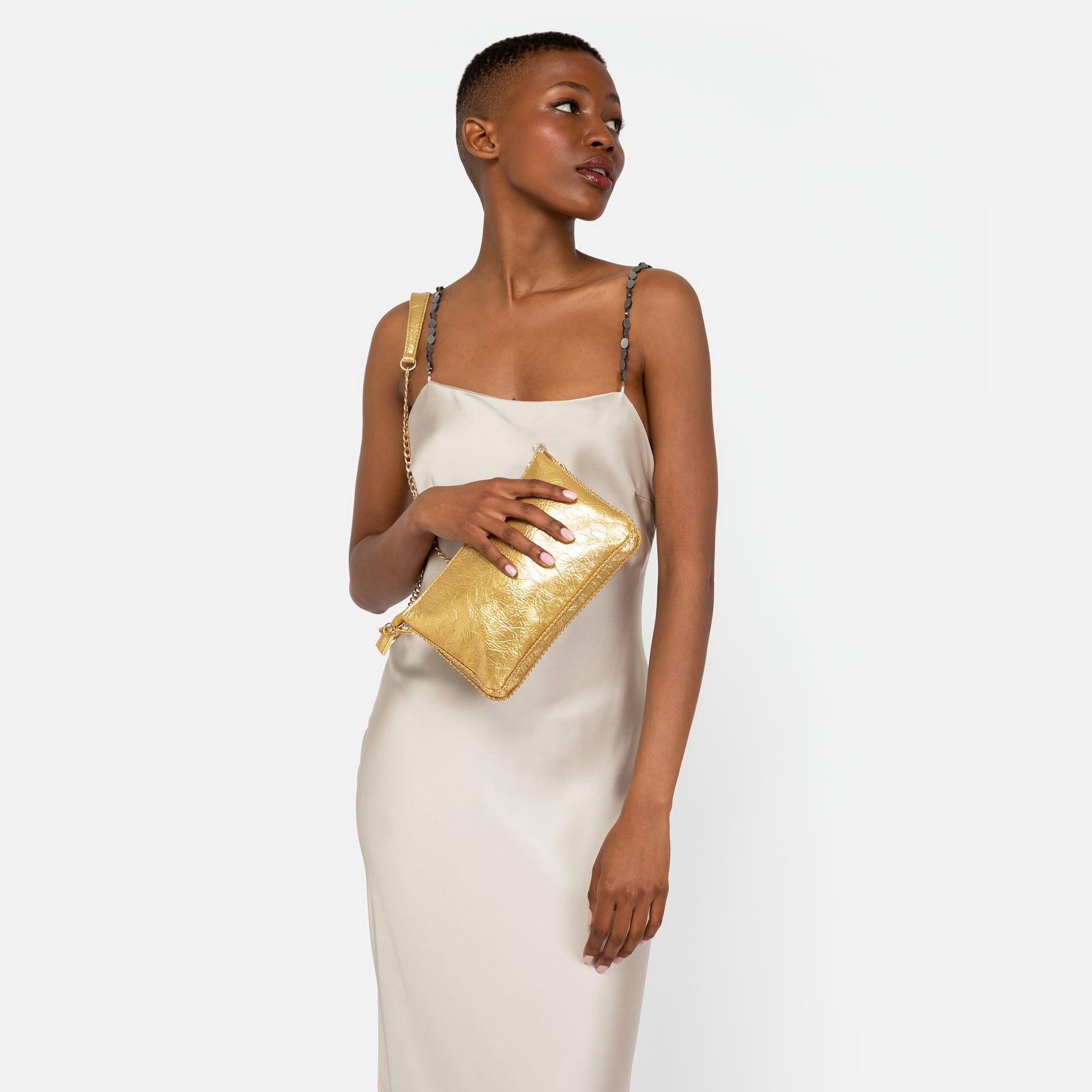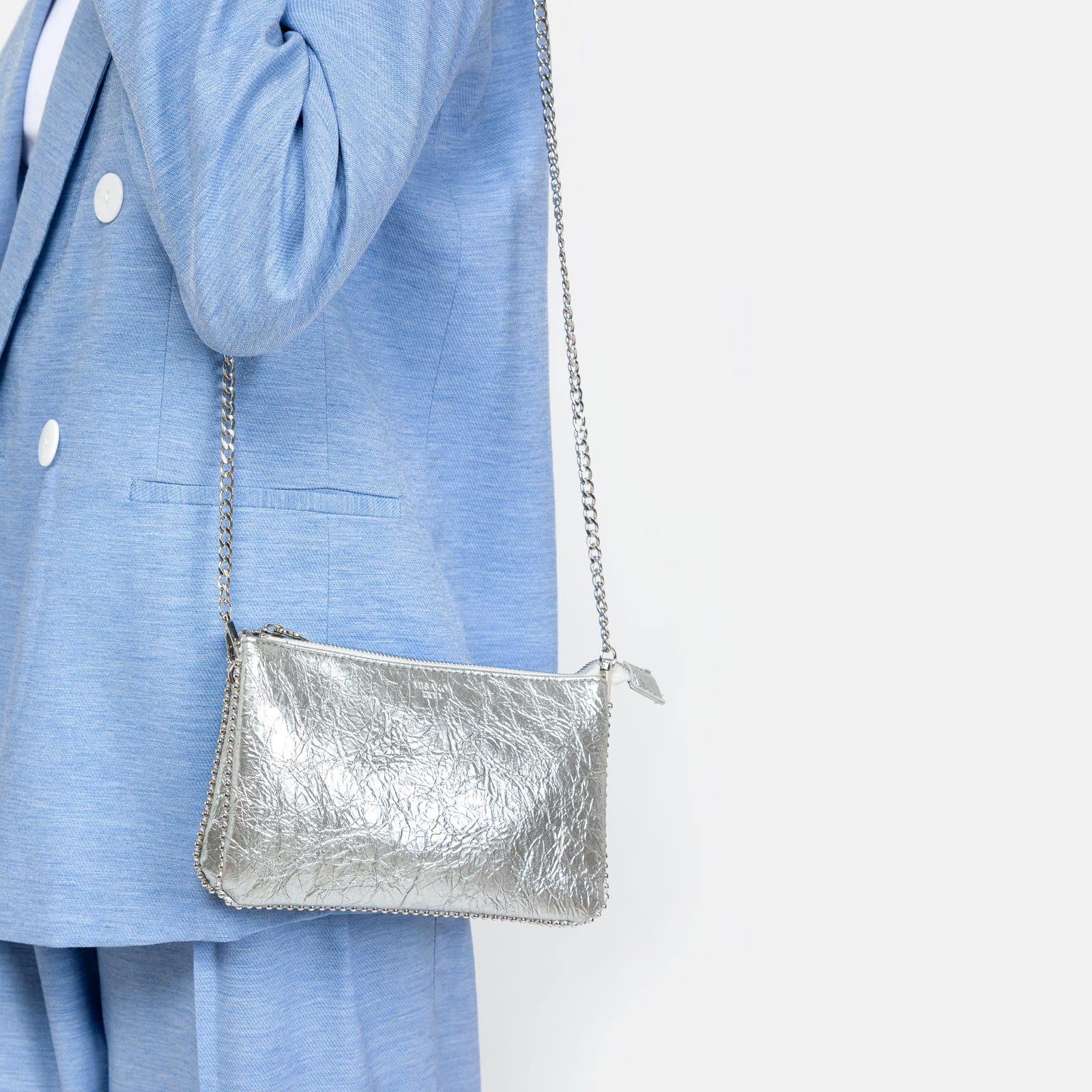 La sua tracolla, un'elegante combinazione di catena metallica e cinturino in pelle, permette di indossarla comodamente a spalla o sul corpo, valorizzando senza sforzo qualsiasi look. È anche staccabile, in modo da poterla trasformare in pochi secondi in una clutch, ideale per un evento più formale.