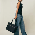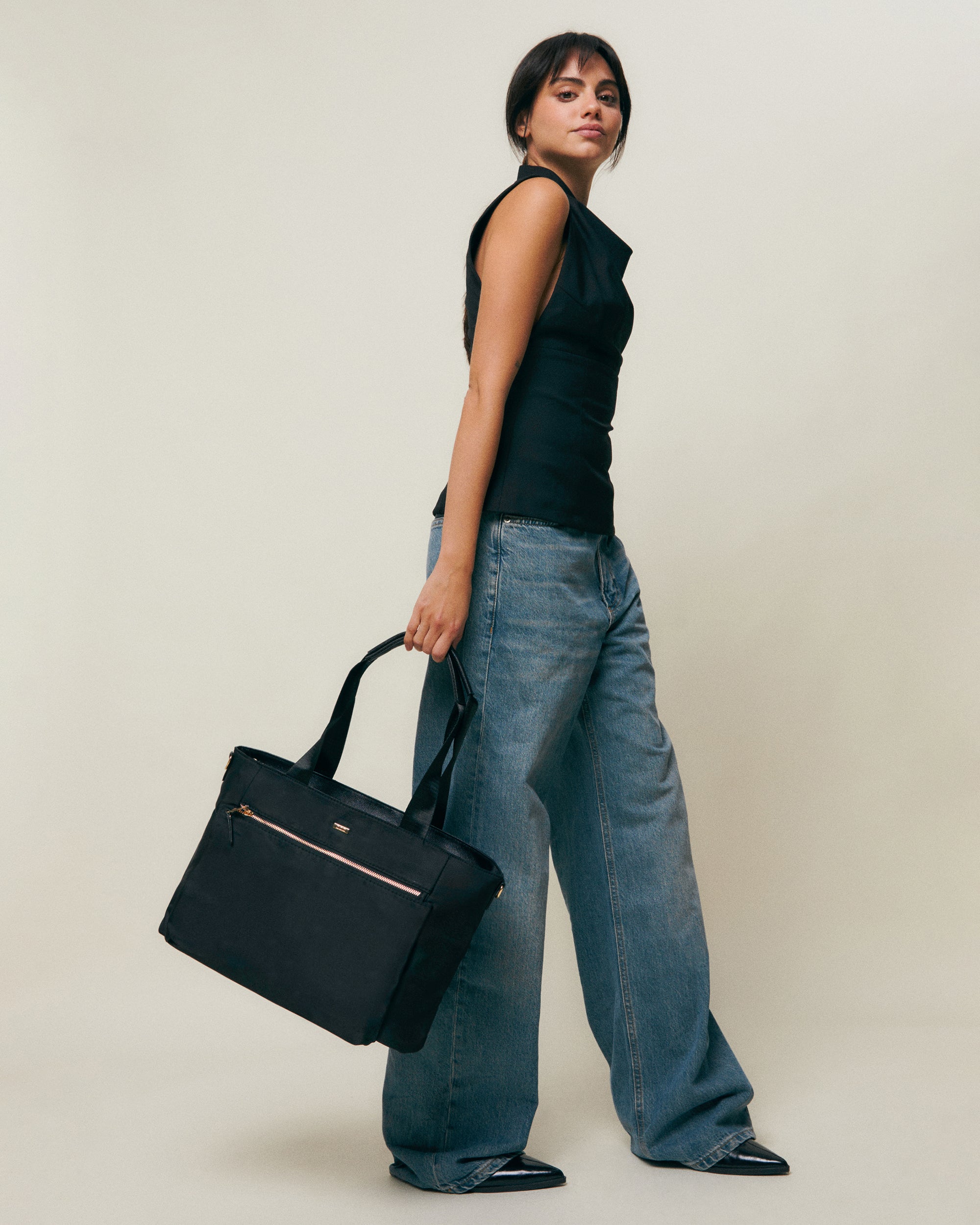 Realizzata in tela di alta qualità con finitura resistente all'acqua, incorpora dettagli in effetto pelle e dettagli metallici che le conferiscono un tocco sofisticato. È realizzata in tela di alta qualità con finitura resistente all'acqua e incorpora dettagli in effetto pelle e dettagli metallici che le conferiscono un tocco sofisticato. I manici corti e la tracolla regolabile e rimovibile ti consentono di portarla nel modo che più ti si addice in ogni momento.