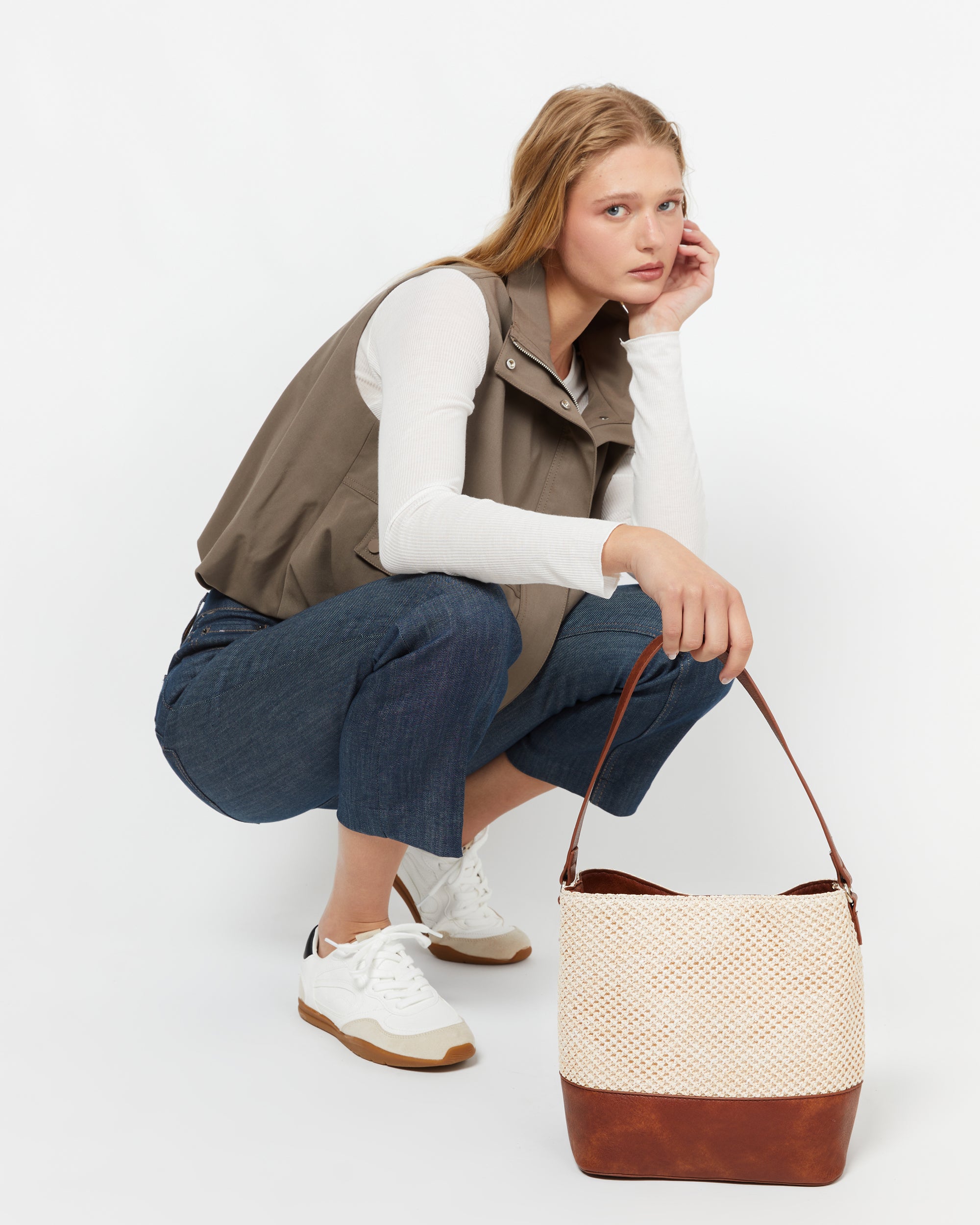 Borsa a tracolla piccola effetto rafia con tracolla rimovibile
