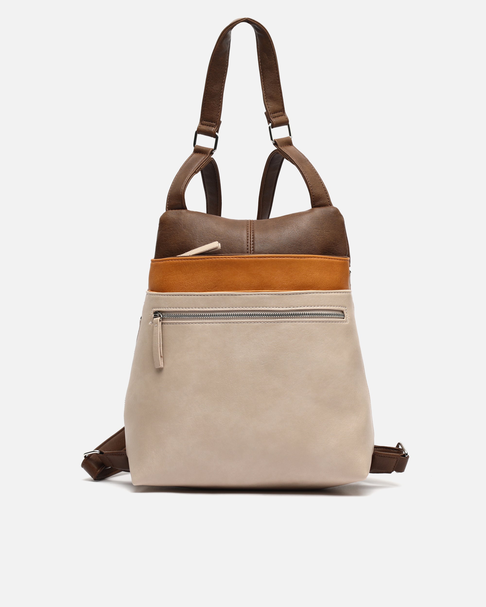 Fabriqué en simili cuir et dans une élégante combinaison de tons terre, il est léger, résistant et s'adapte facilement aussi bien à des looks décontractés qu'à des tenues plus sophistiquées. Il comprend une poche avant avec fermeture éclair horizontale pour les objets fréquemment utilisés, une autre poche supérieure intégrée dans la bande de couleur contrastée, idéale pour les documents ou les accessoires plats, et une poche latérale pour les petits objets indispensables. Sa polyvalence est mise en valeur par ses anses réglables, qui permettent de le porter comme un sac à dos, et par sa poignée courte, qui offre la possibilité de l'utiliser comme sac à main.