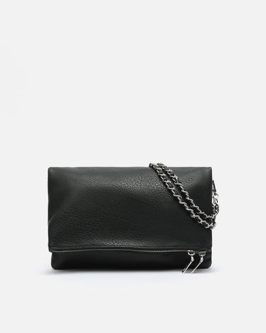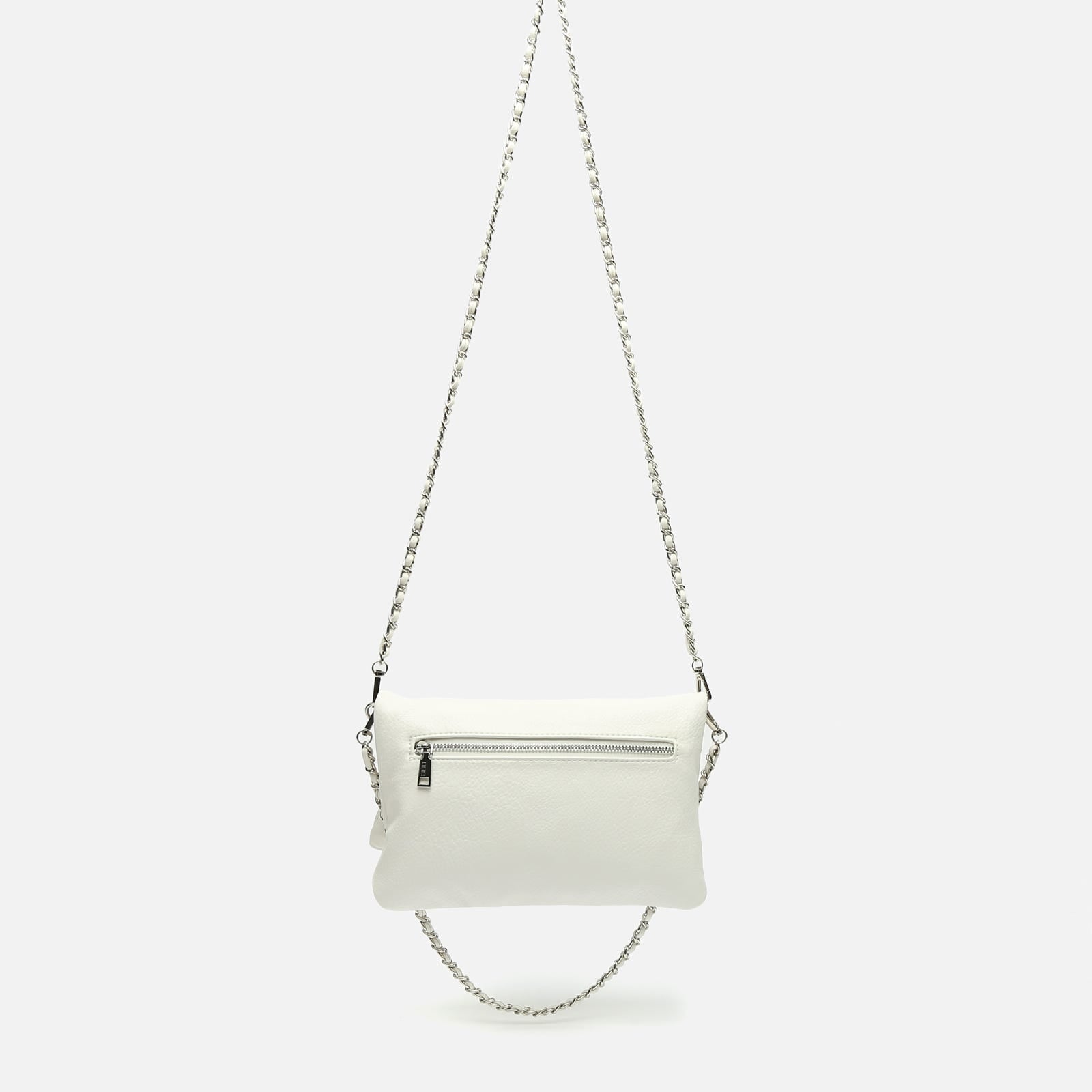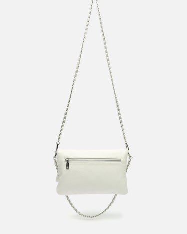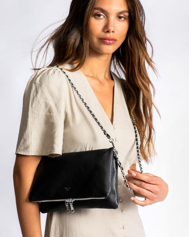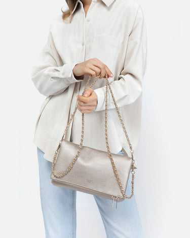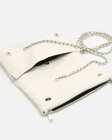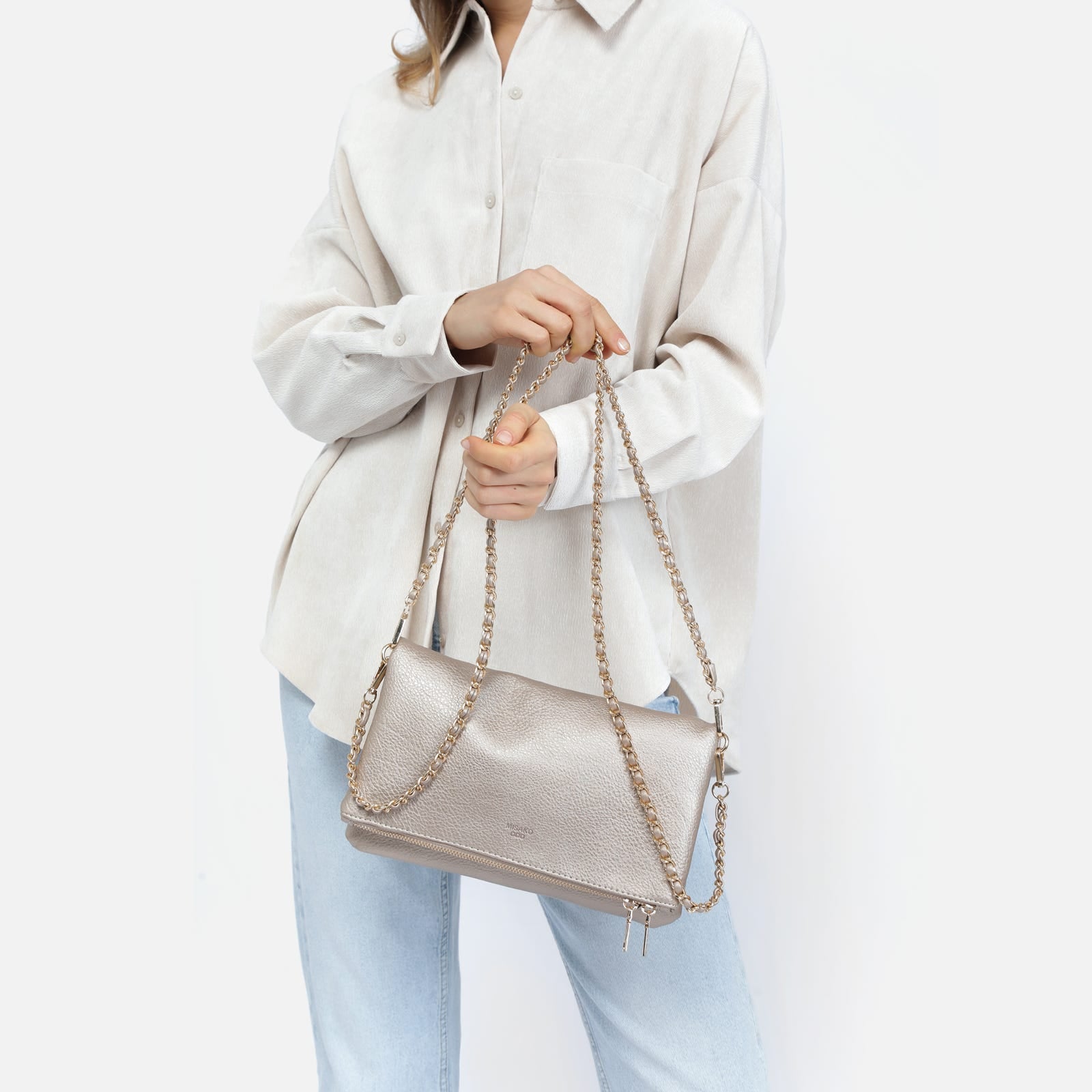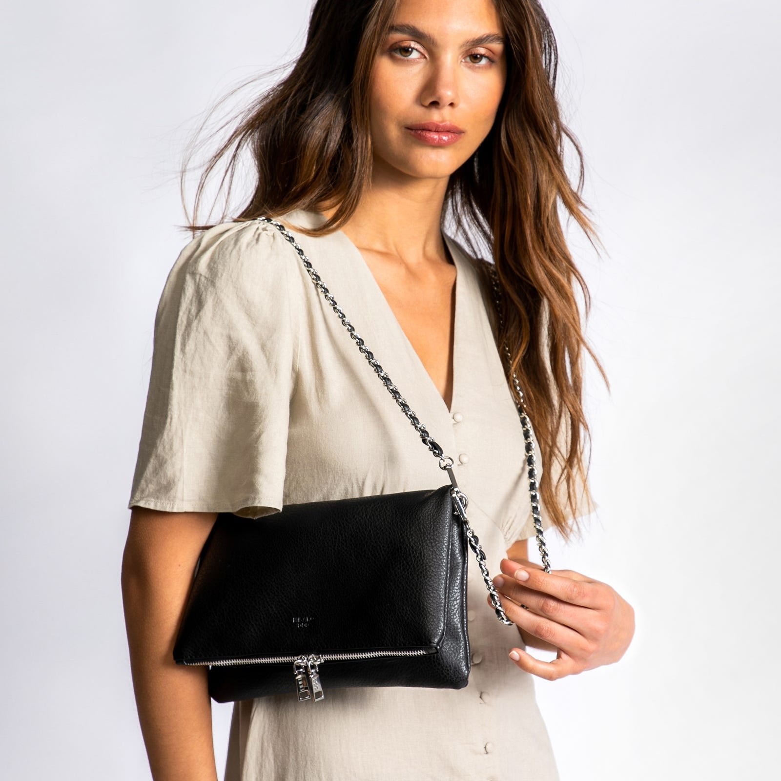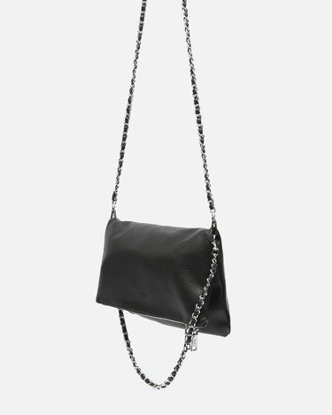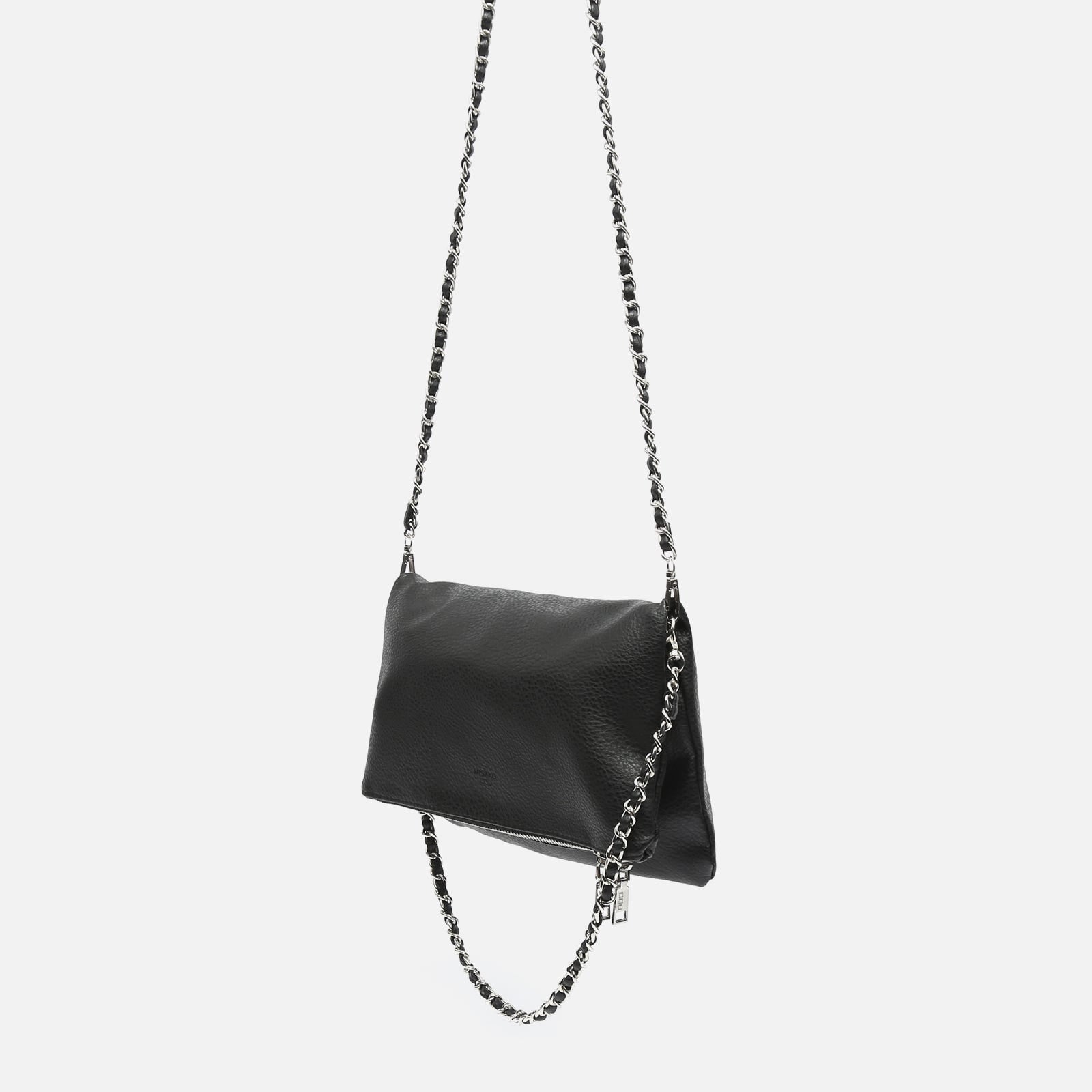 La sua distribuzione interna sorprende: due scomparti indipendenti con chiusura, uno con cerniera e l'altro con bottoni magnetici, offrono un'organizzazione intelligente per trasportare dall'essenziale ai piccoli oggetti per ogni evenienza. La catena intrecciata in similpelle conferisce un sottile tocco rock che la rende un accessorio di personalità, perfetto per look che cercano un equilibrio tra sofisticato e disinvolto. Inoltre, il doppio manico rimovibile permette di portarla a mano, a spalla o a tracolla.