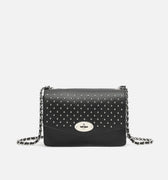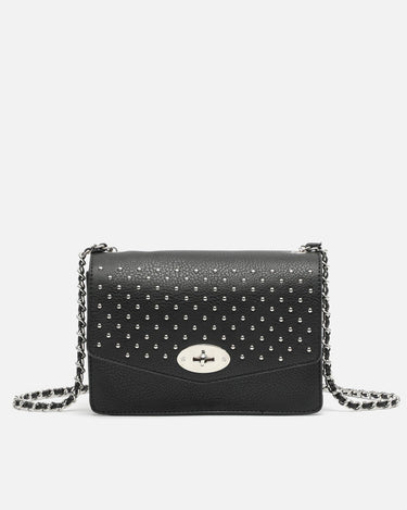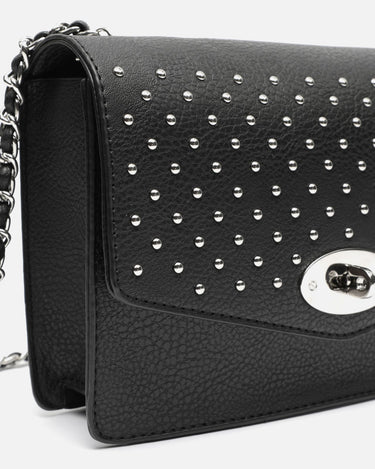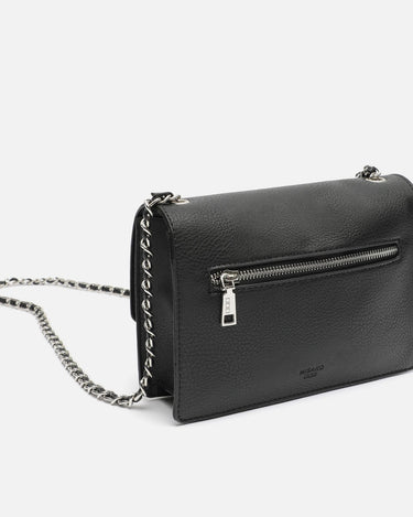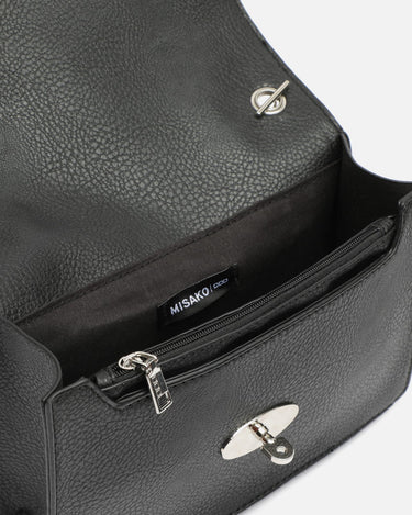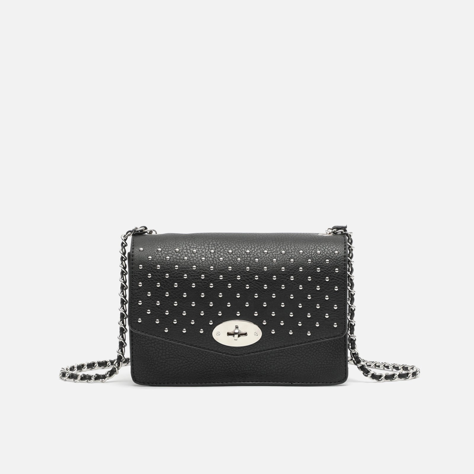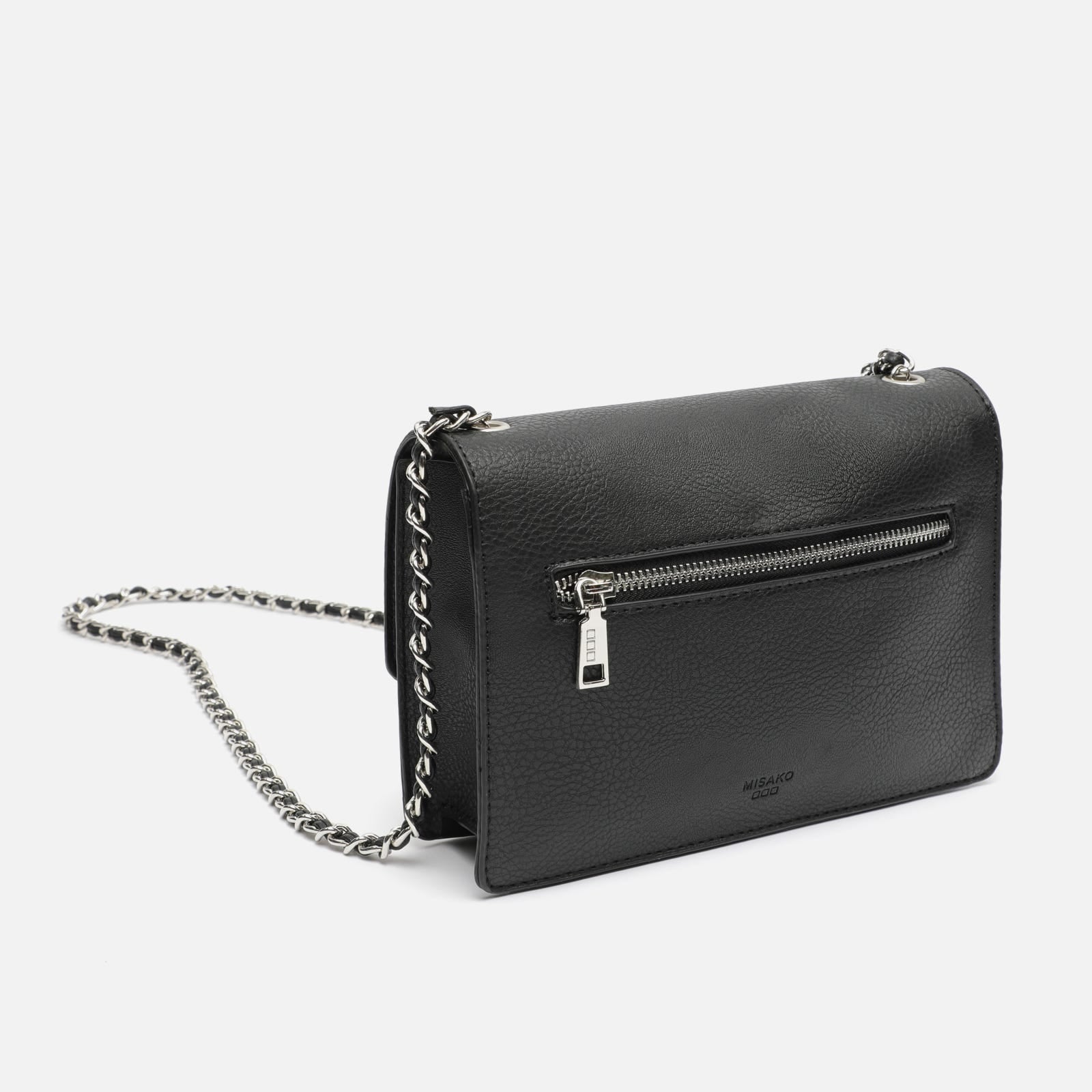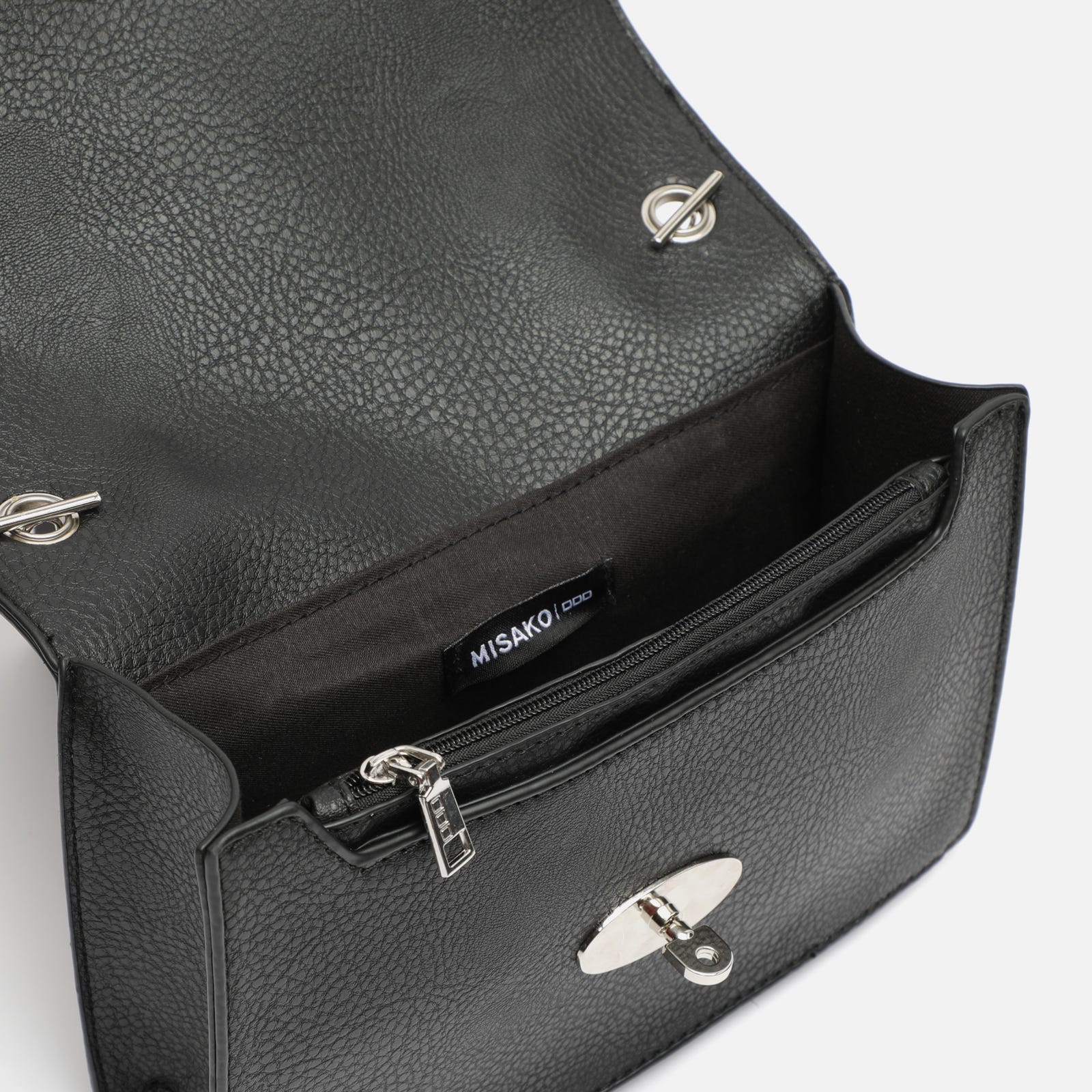 Tachitas è la borsa a tracolla Misako con ispirazione rock chic e un tocco di eleganza. La sua silhouette rettangolare e compatta è realizzata in vernice granulata che imita la sensazione di morbidezza della pelle naturale. Presenta dettagli sofisticati come le microborchie argentate disposte in un motivo sfumato, la patta con chiusura turn-lock in metallo lucido e una moderna tracolla con catena intrecciata a una cinghia in similpelle, che alleggerisce il peso sulla spalla e valorizza il design.