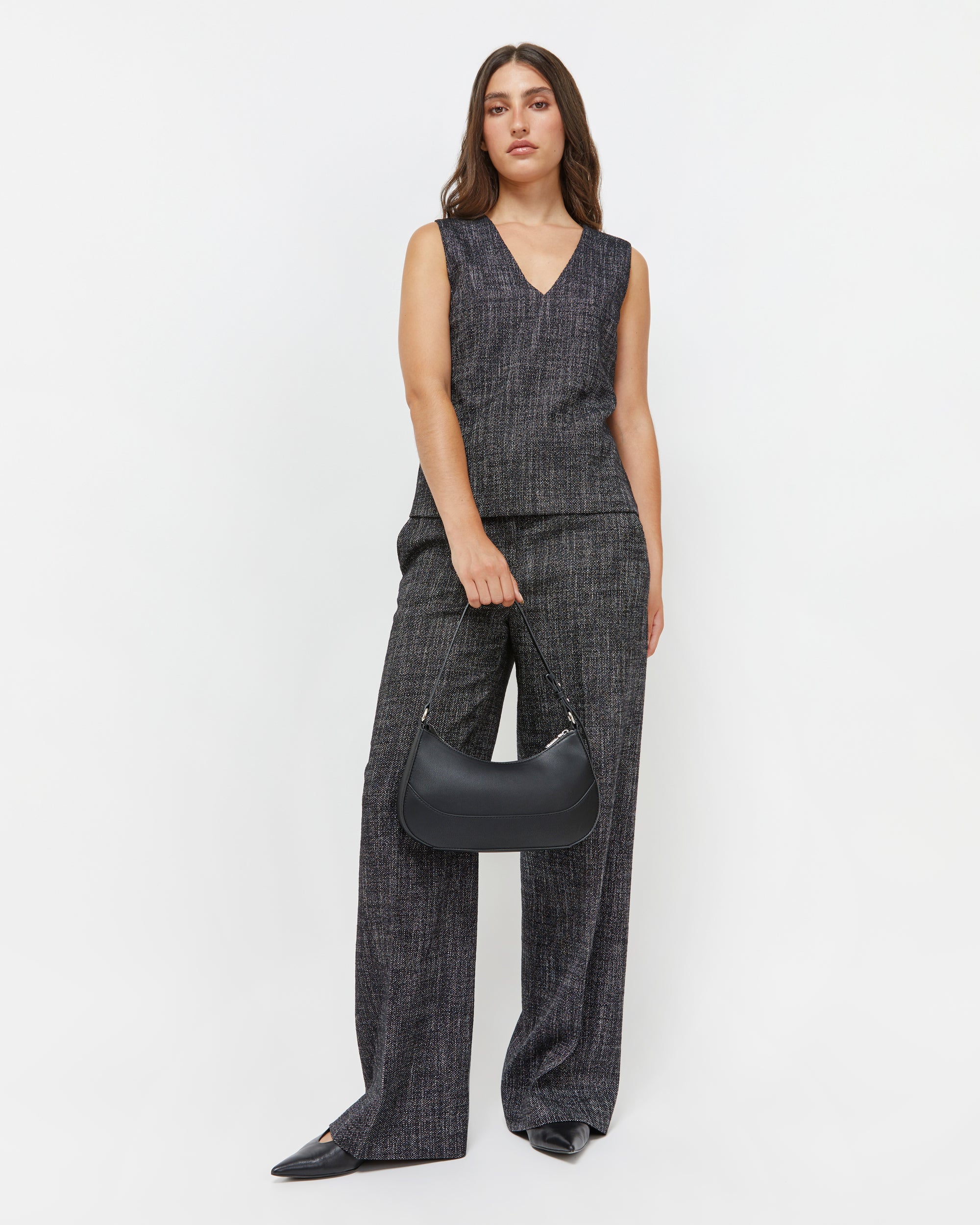 De binnenkant wordt beschermd door een glanzende metalen ritssluiting, die niet alleen veiligheid biedt, maar ook een elegante toets geeft. Het hoofdvak is ruim en heeft functionele vakjes om je essentials gemakkelijk op te bergen. Bovendien kun je dankzij de verstelbare riem de hoogte en de manier waarop je de tas draagt aanpassen aan je stijl of plannen. Enpa is een veelzijdig accessoire dat zowel geschikt is voor een weekendbrunch met vriendinnen als voor een zakelijke vergadering.