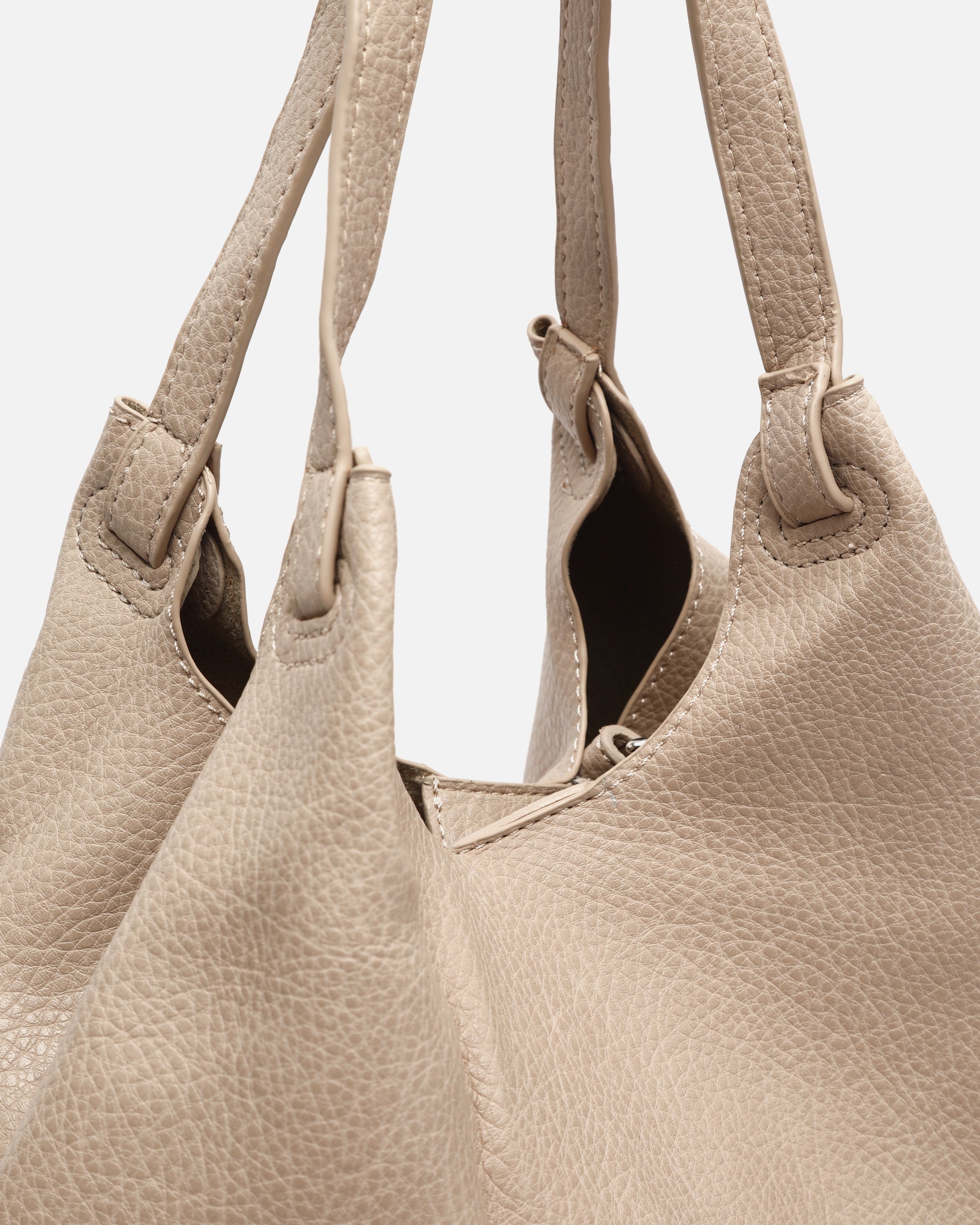 Krótkie uchwyty pozwalają na wygodne noszenie na ramieniu, a odpinany pasek na ramię daje swobodę noszenia torebki na skos, gdy jest to potrzebne. Wewnątrz znajduje się obszerna komora główna i praktyczna wyjmowana torba z zamkiem błyskawicznym, idealna do używania również osobno, która pozwala utrzymać porządek i chronić Twoje rzeczy.