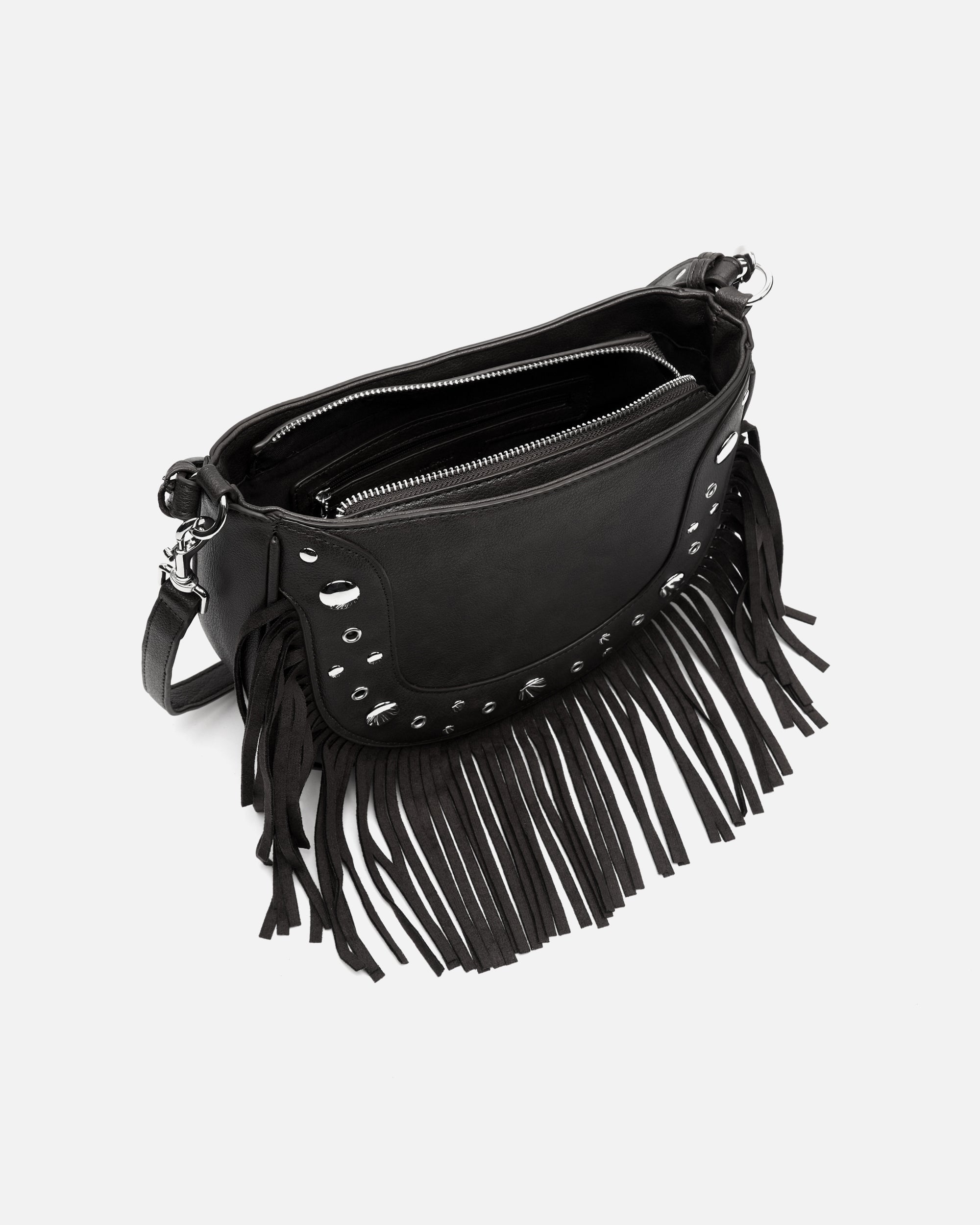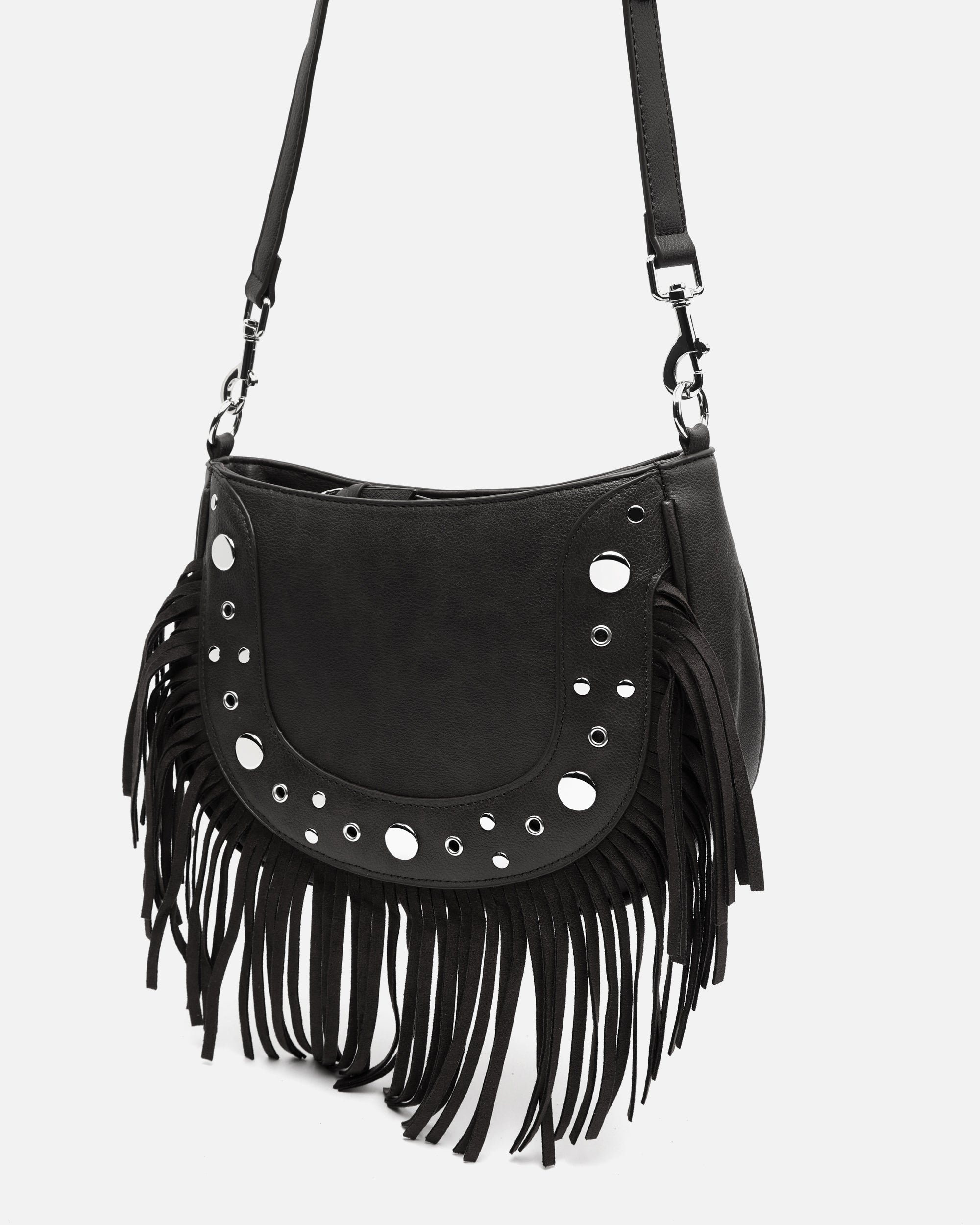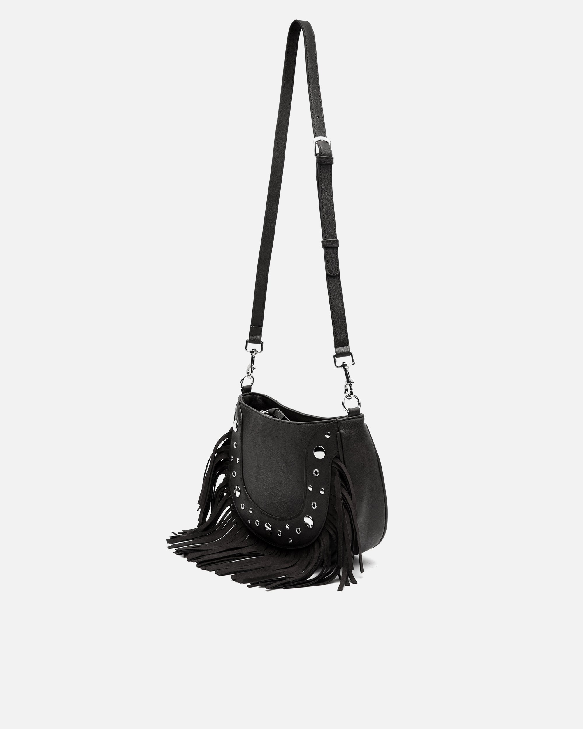Bolso de hombro con asa bandolera extraíble con detalles metálicos y flecos