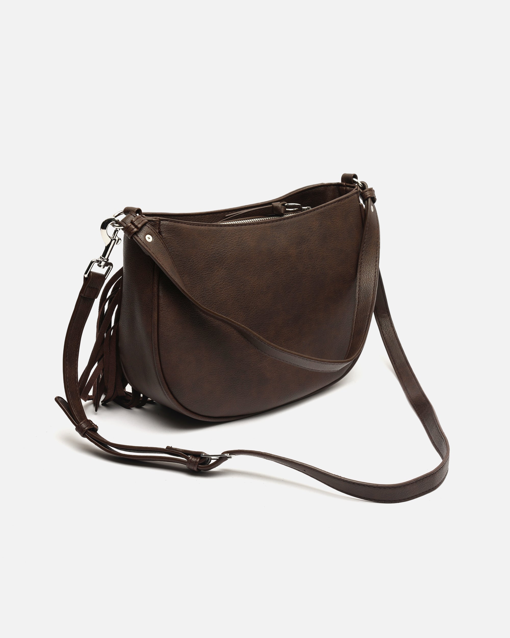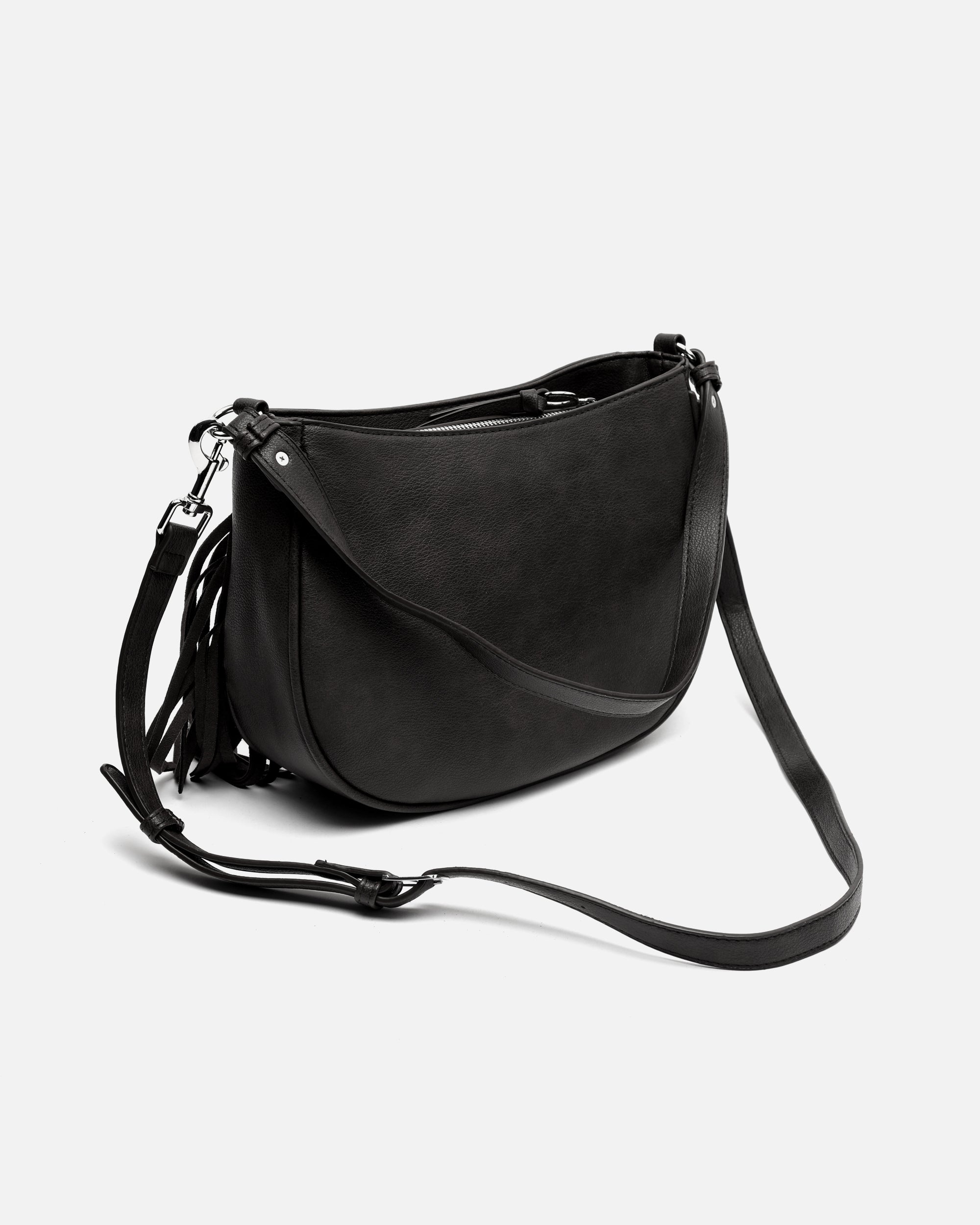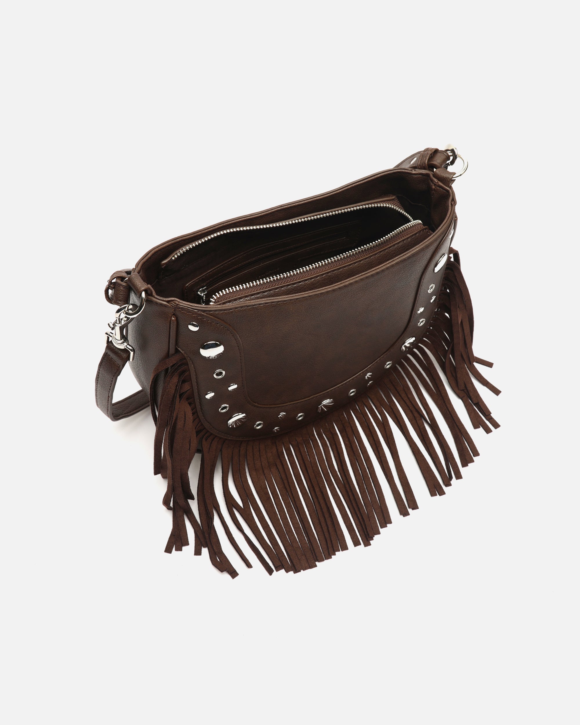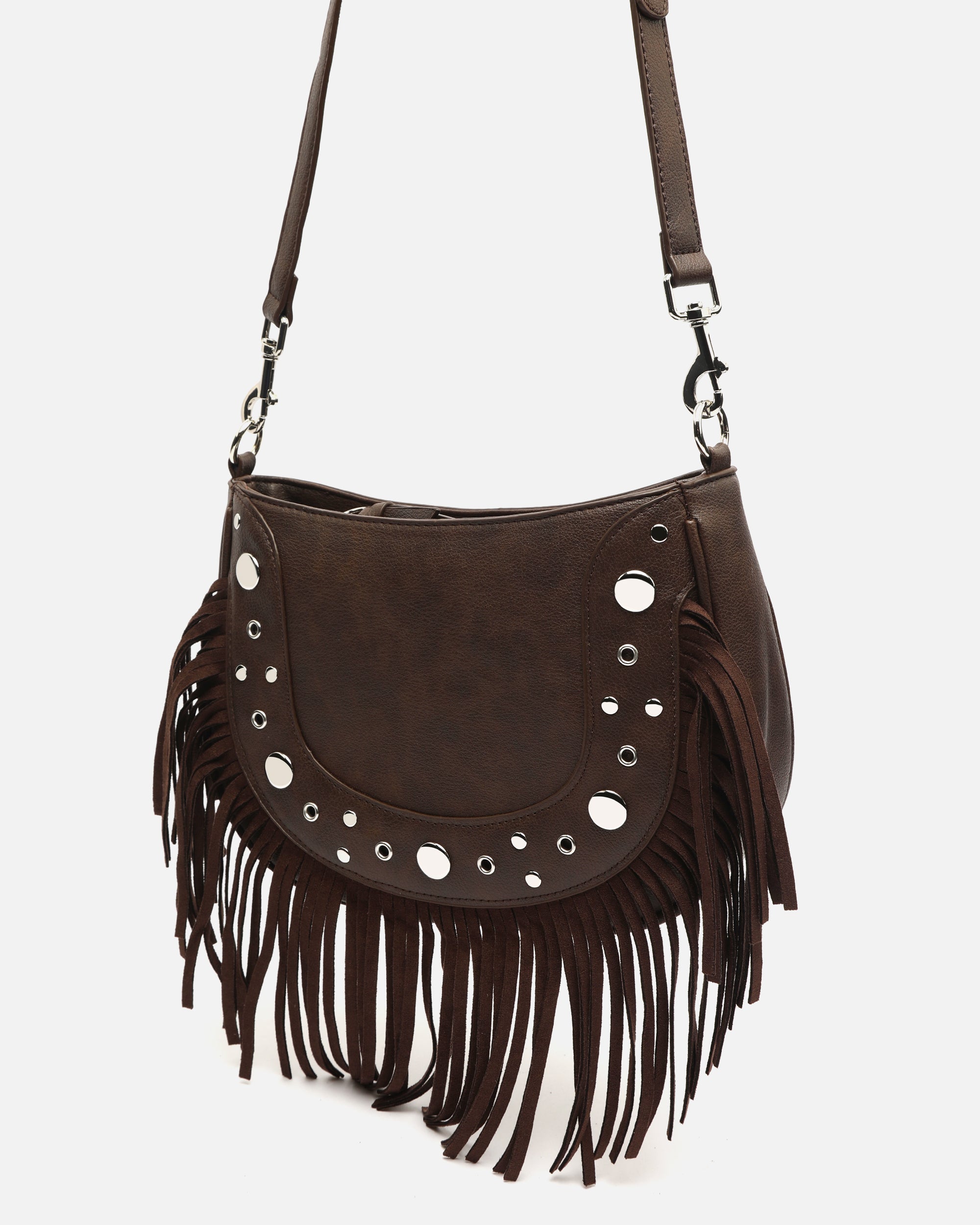 Bolso de hombro con asa bandolera extraíble con detalles metálicos y flecos