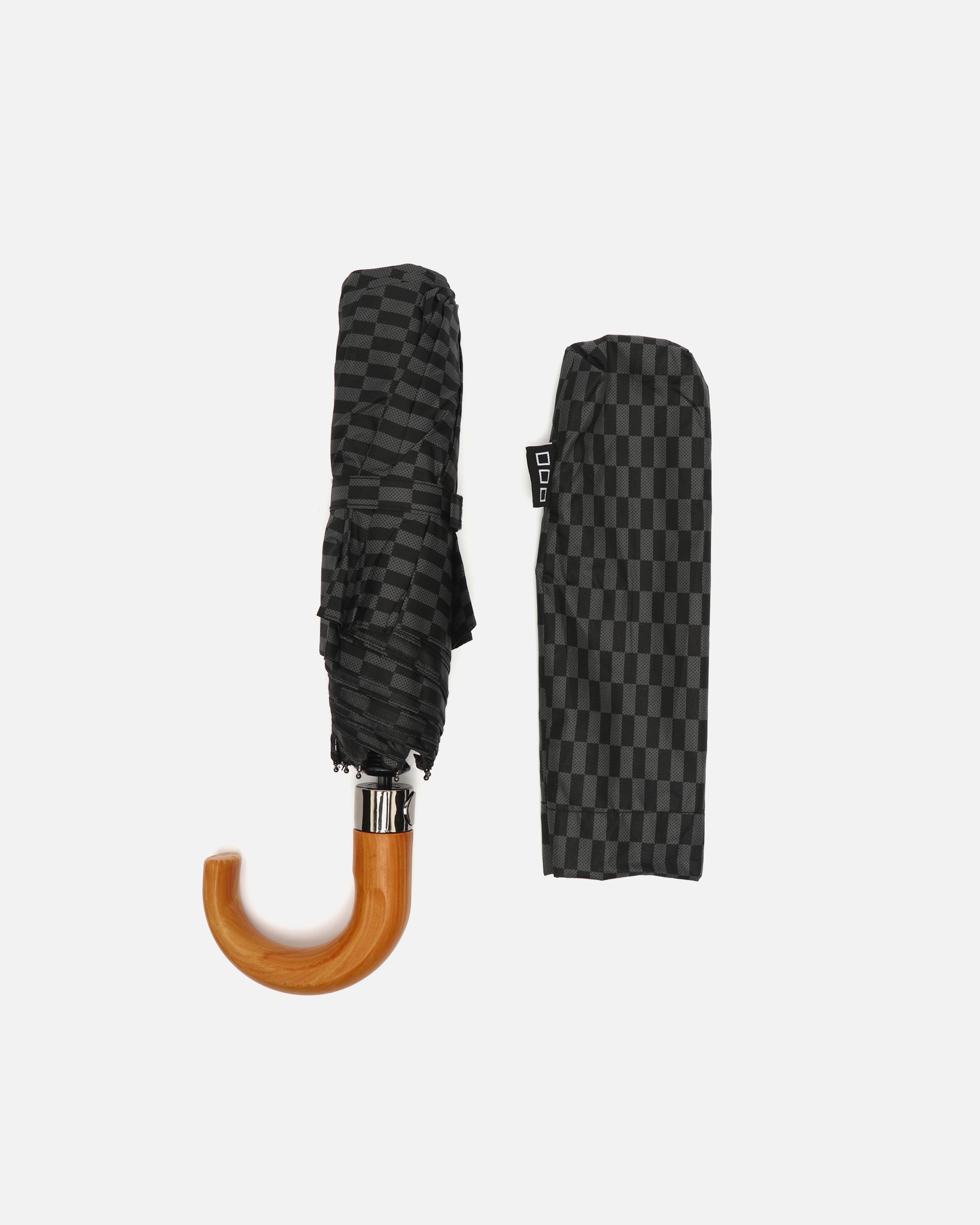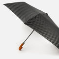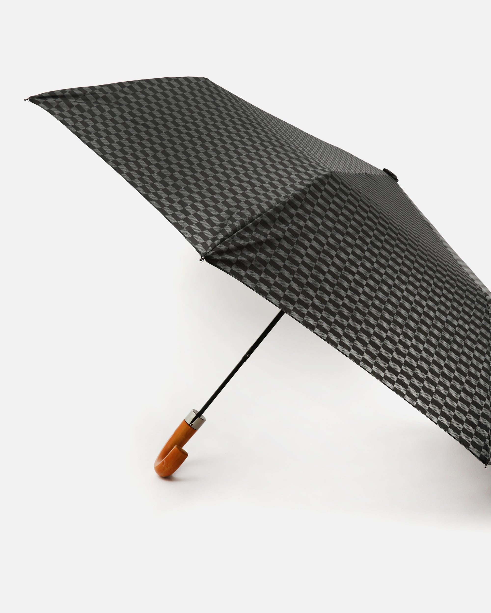 Su dosel, decorado con un sobrio patrón geométrico bicolor, aporta un toque de elegancia natural a tu look en los días más lluviosos, mientras que su estructura reforzada le confiere resistencia frente al viento sin perder ligereza.