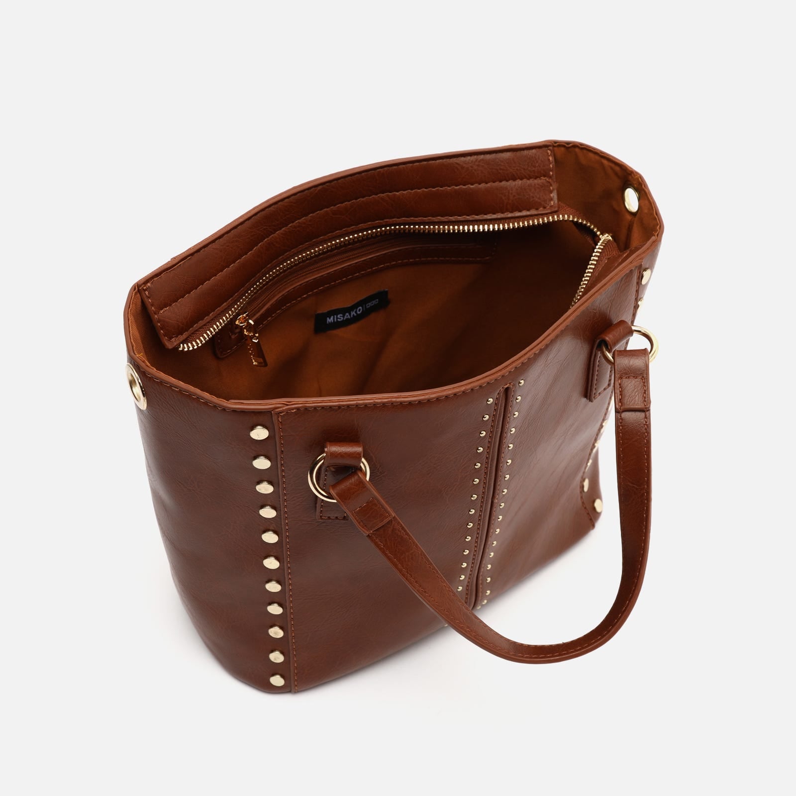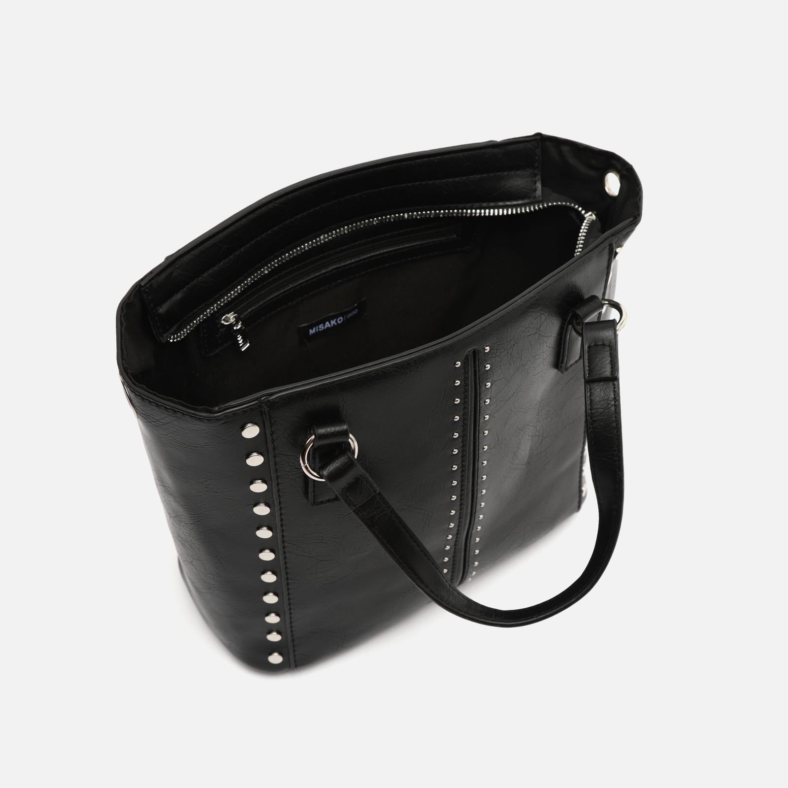 Más que un accesorio, el bolso Jita de Misako es tu compañero ideal en tu oficina y ocasiones especiales gracias a su estilo sofisticado. Su elegante polipiel texturizada contrasta perfectamente con los taches metálicos que aportan un toque urbano y actual. Incluye una bandolera extraíble que permite usarlo como bolso de hombro a cruzado, adaptándose fácilmente a tu día y necesidad Su interior cuenta con un compartimento principal con cierre de cremallera y un bolsillo también con cremallera ideal para no perder esos artículos valiosos más pequeños. En el exterior un bolsillo perfecto para mantener lo imprescindible a la mano complementa su funcional diseño. Combínala con uno de nuestros portamonedas con detalles metálicos para completar el look.