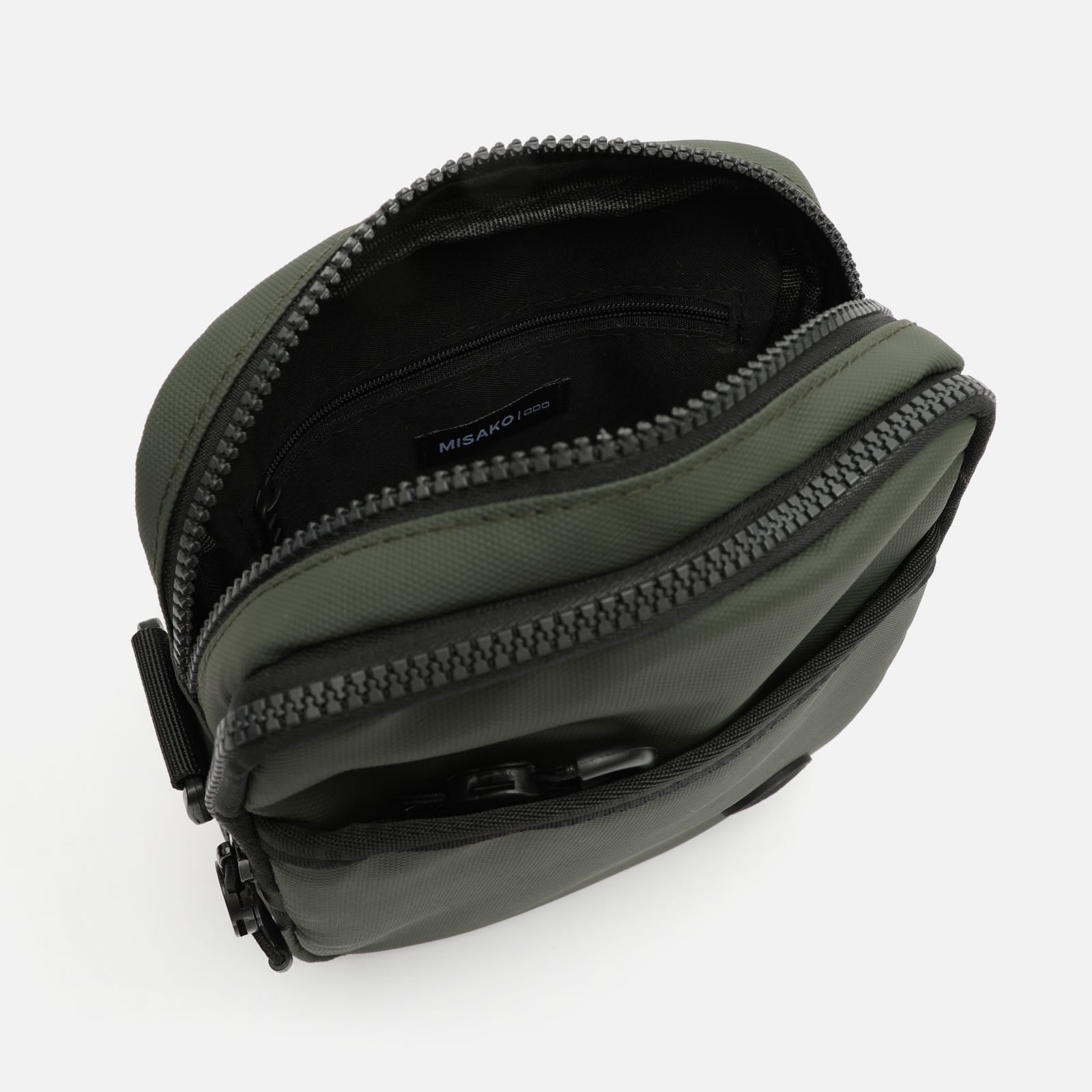 Incluye un compartimento principal con cremallera, un bolsillo plano frontal para el móvil o tarjetas de transporte, y un bolsillo trasero con elástico interior para sujetar auriculares o llaves.