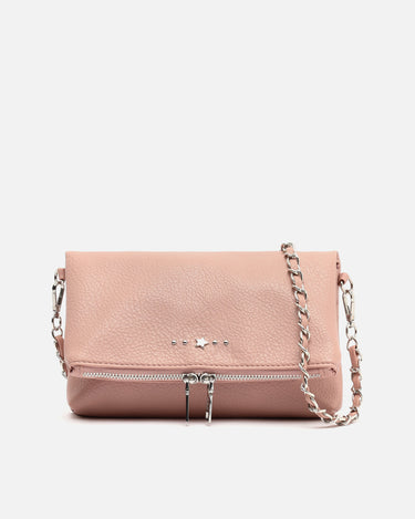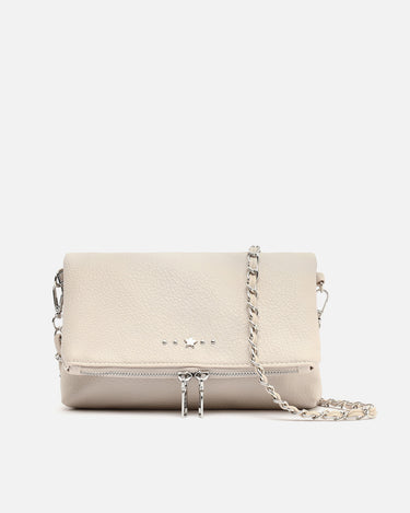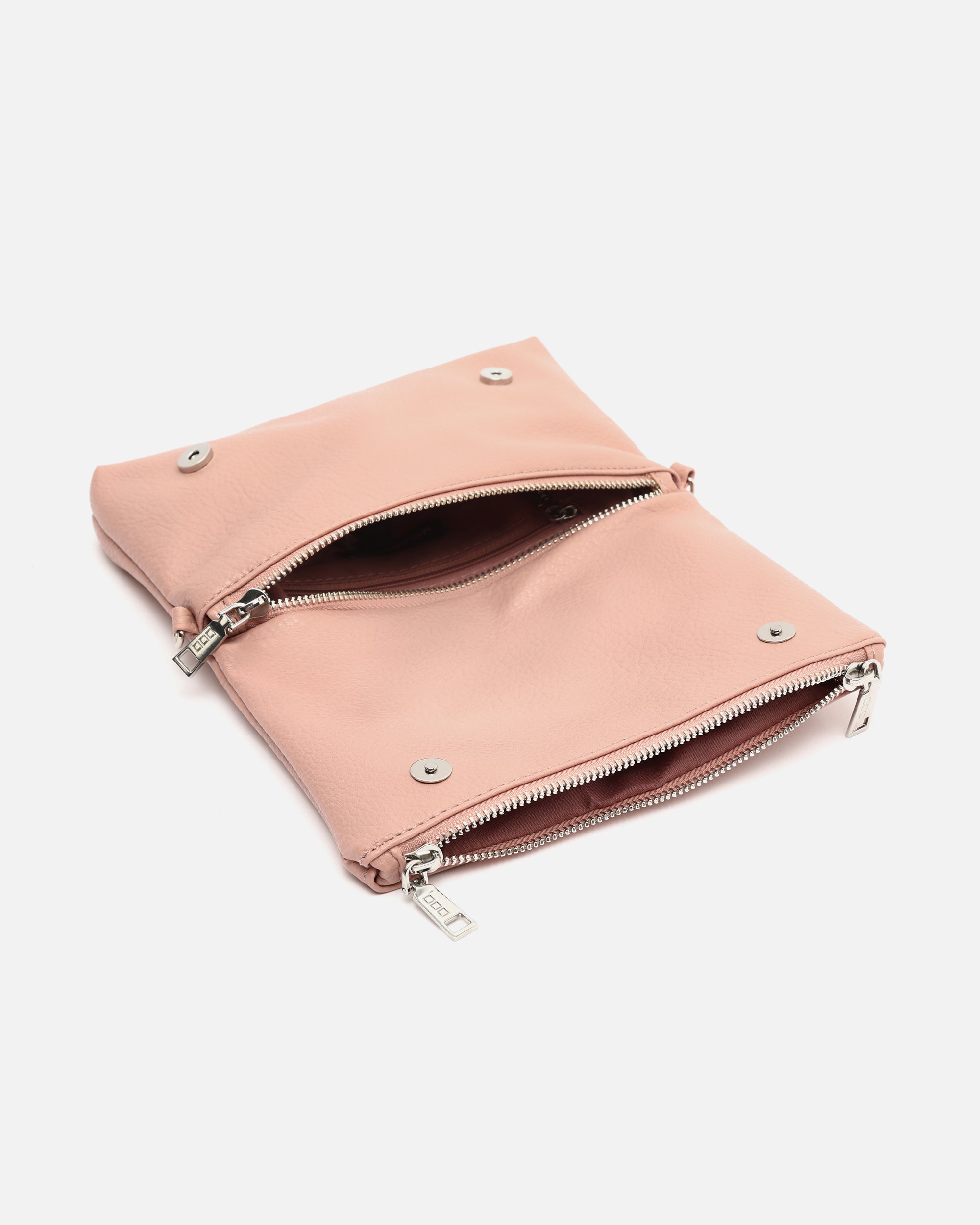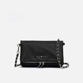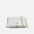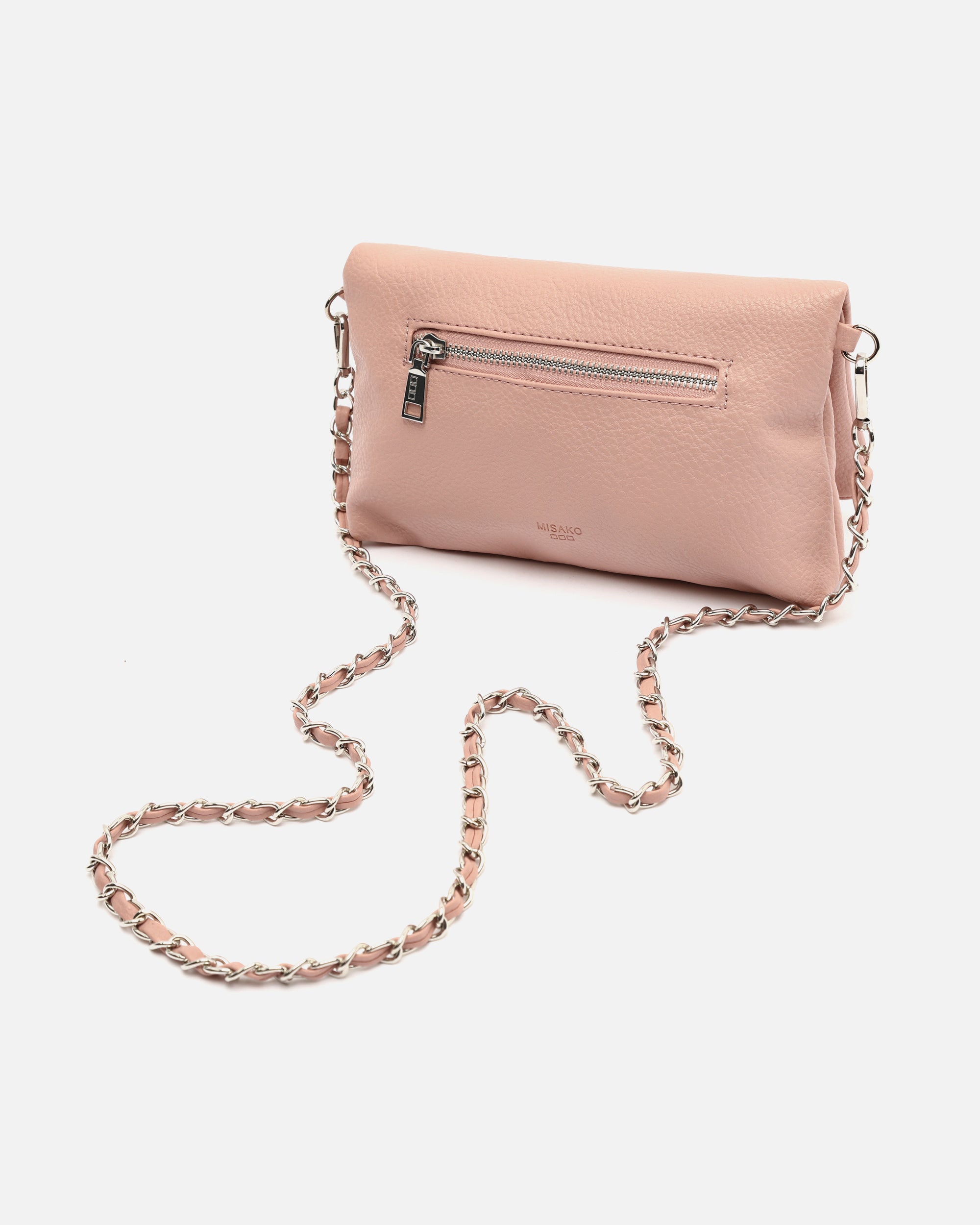 Laurini es el bolso bandolera con solapa de Misako, de diseño rectangular y confeccionado en un tejido efecto piel con textura que le aporta un estilo sofisticado y llamativo. Cuenta con dos compartimentos con cremallera independiente, ocultos bajo la solapa para mantener tus imprescindibles siempre ordenados y seguros. La cadena plateada, entrelazada en polipiel, añade un toque urbano y moderno que realza cualquier look. Puedes llevarlo cruzado durante el día y retirarla fácilmente para transformarlo en un clutch ideal para salidas nocturnas. Los detalles metálicos en forma de estrella y microtachas le dan un carácter más sofisticado y original.