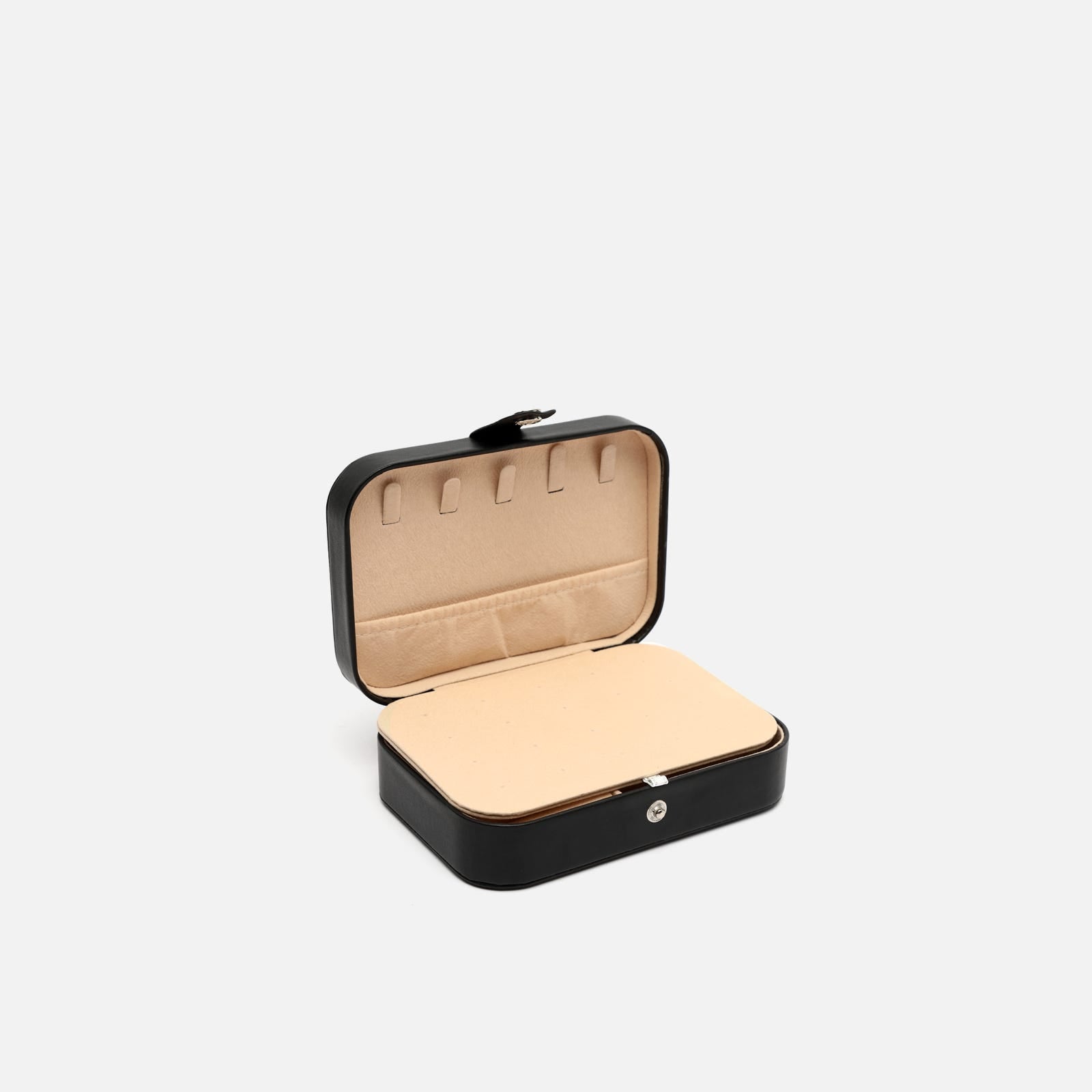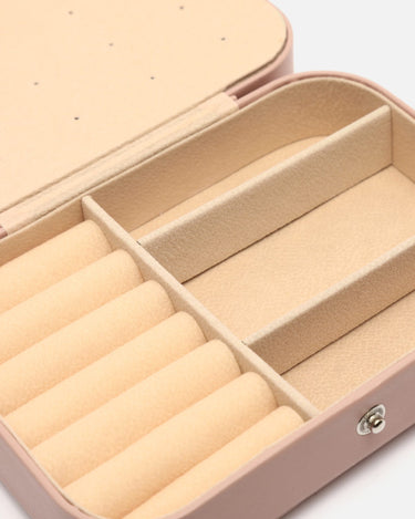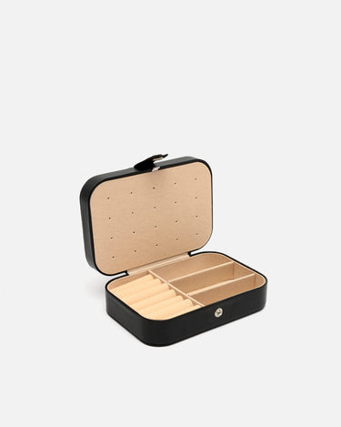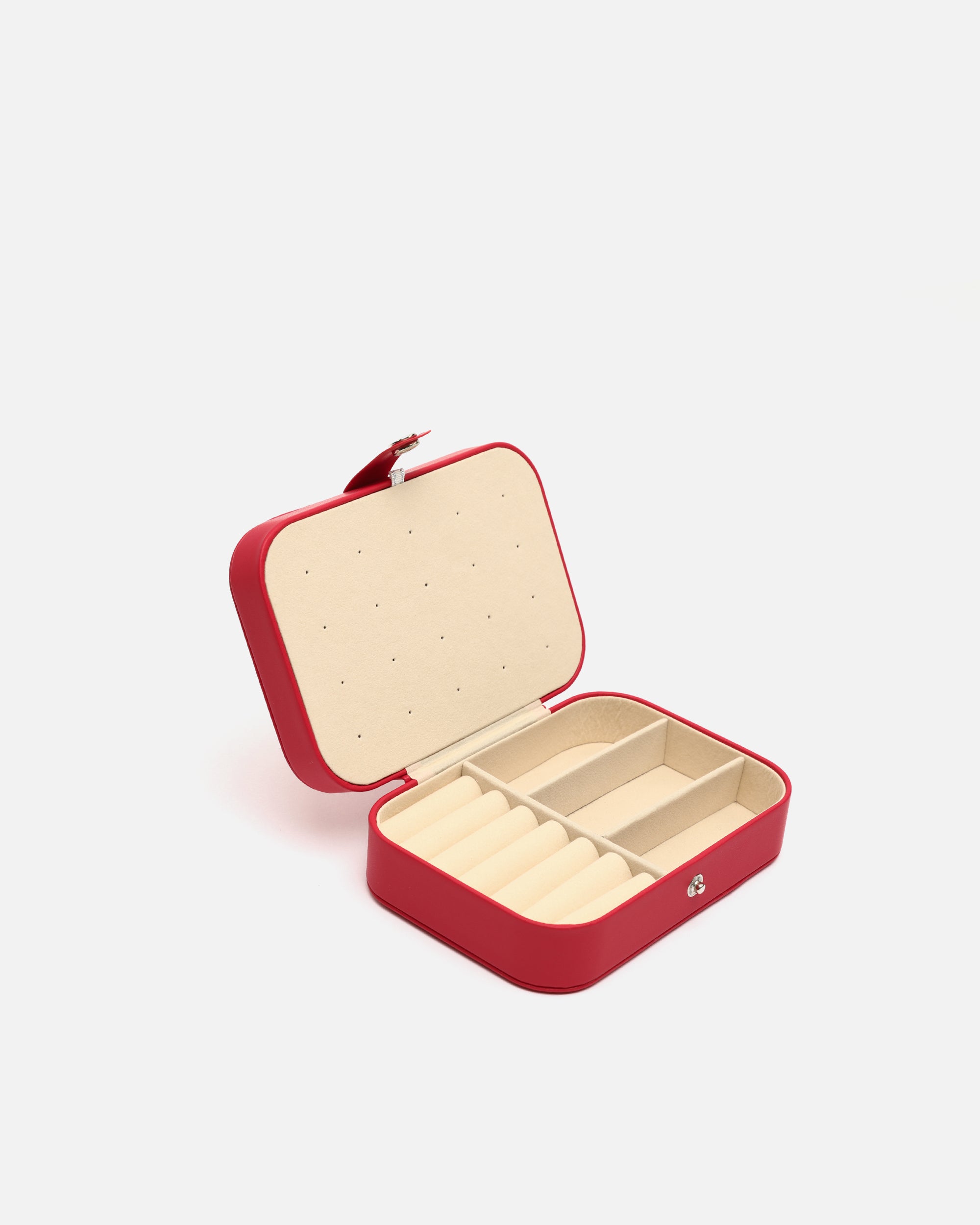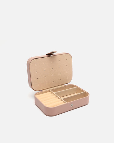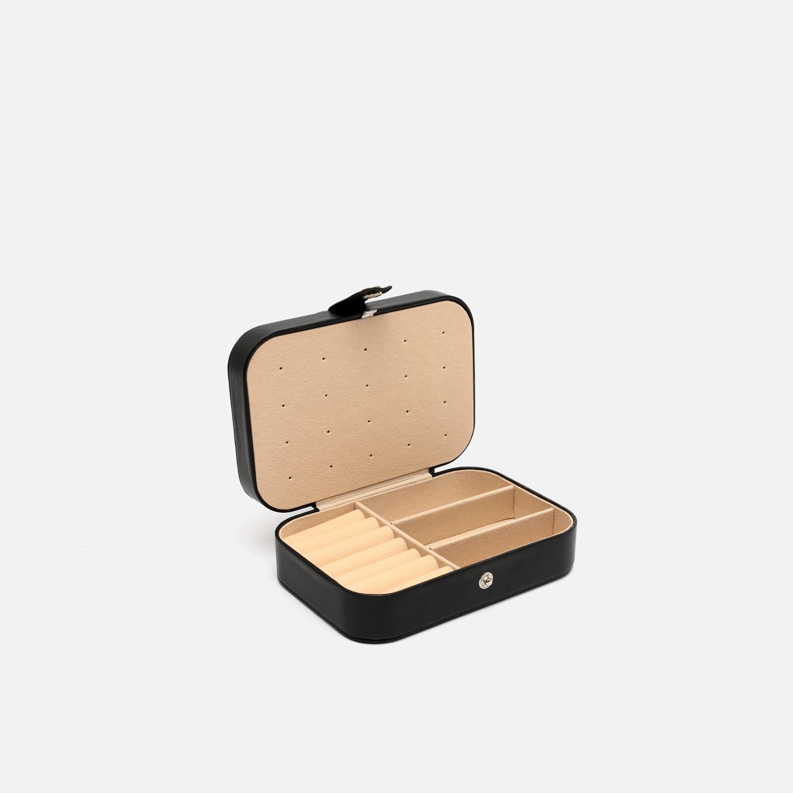 Su formato rígido con cierre a presión metálico mantiene tus piezas más preciadas seguras durante cualquier trayecto. El exterior, con acabado mate y tacto suave, aporta un aire desenfadado, mientras que su interior aterciopelado está cuidadosamente organizado para ofrecer múltiples compartimentos: espacios acolchados para anillos, divisiones ajustadas para pendientes o pulseras, y una solapa con ganchos para colgar collares sin que se enreden.