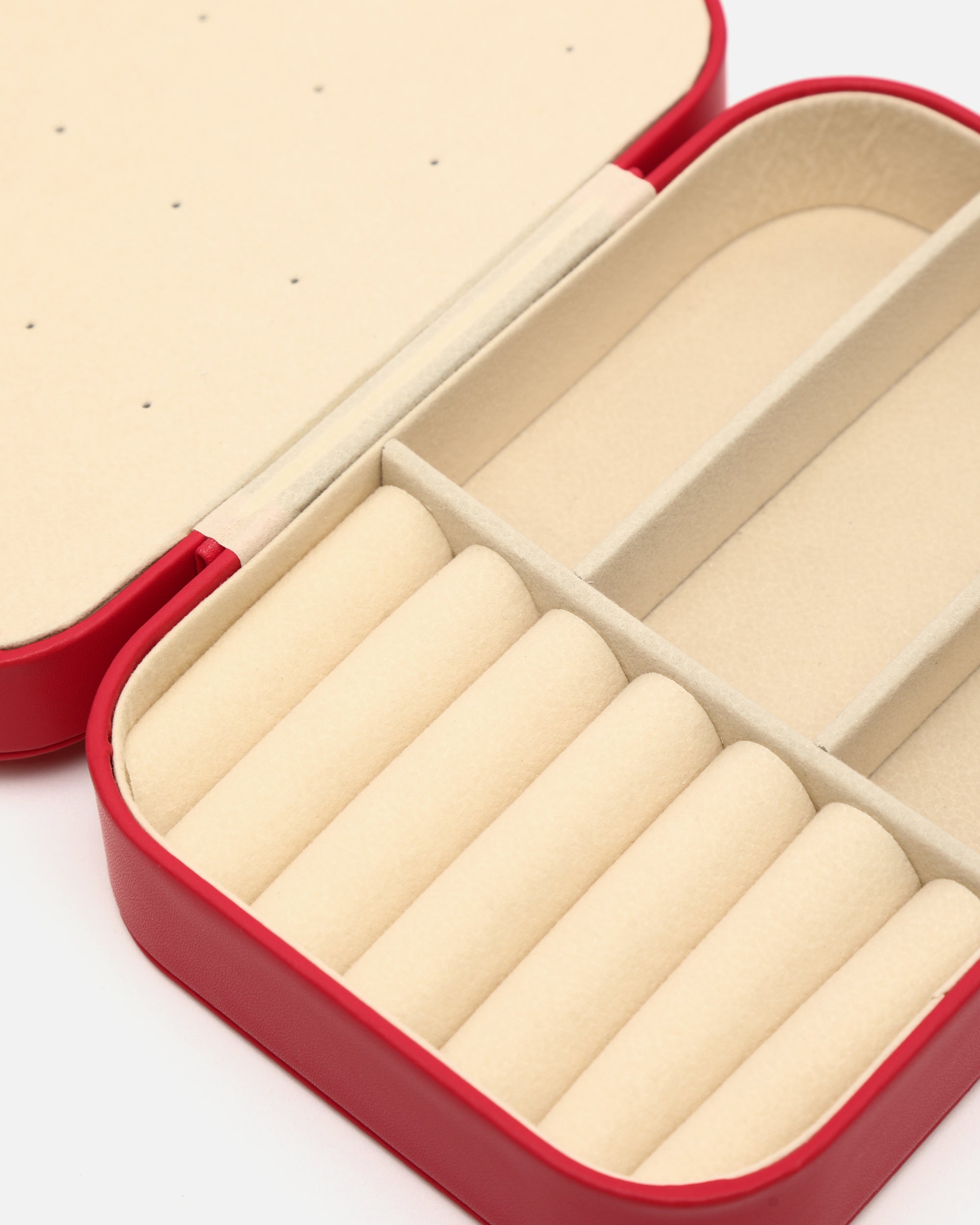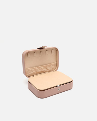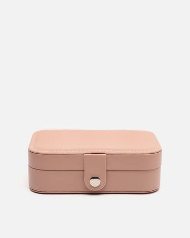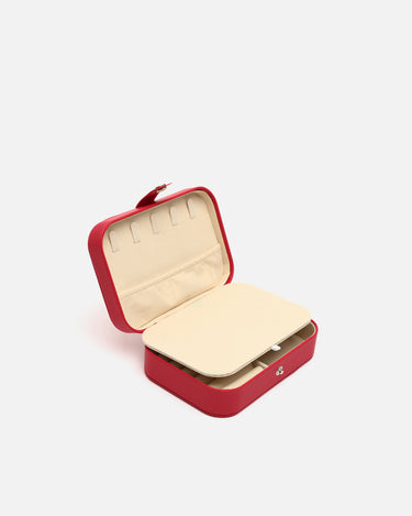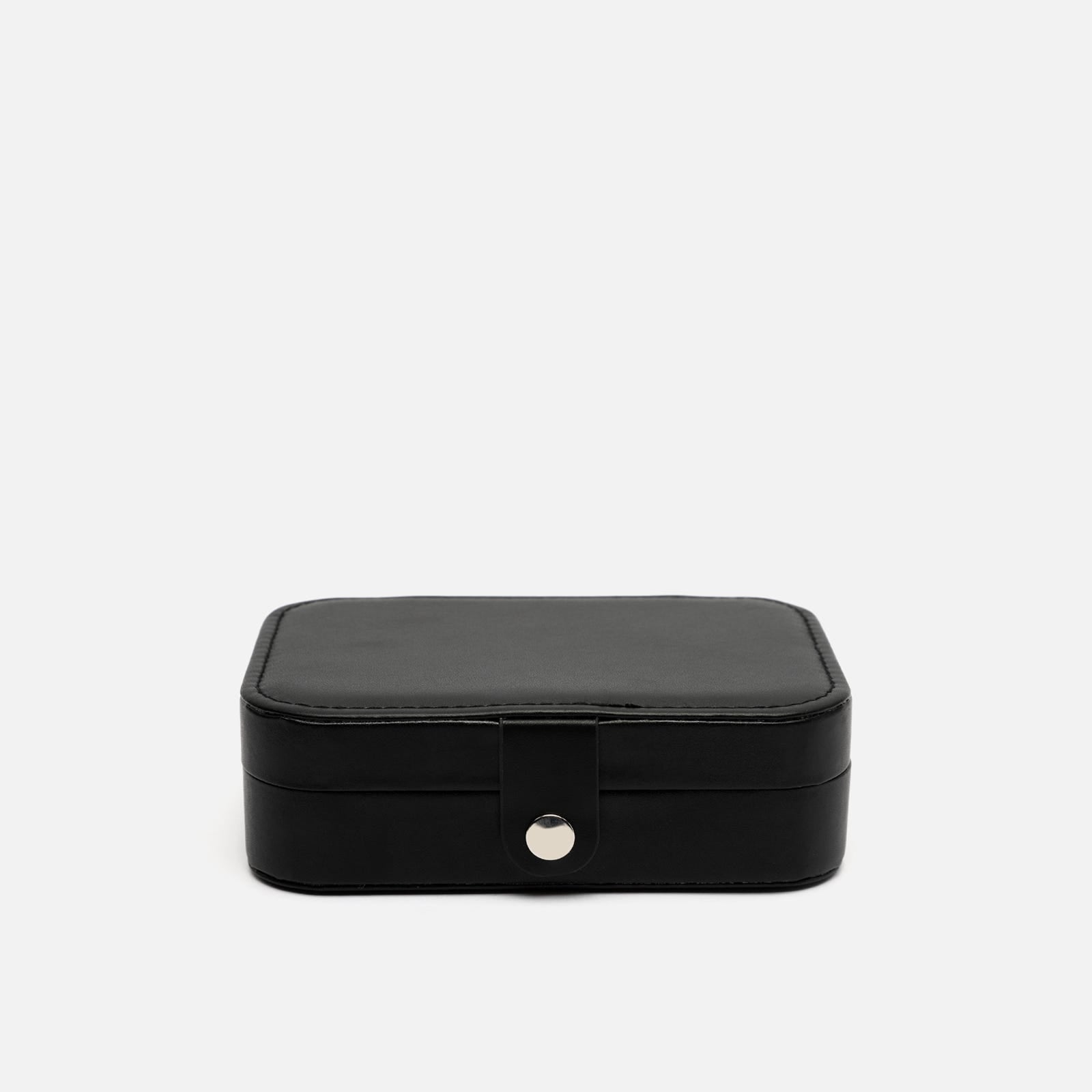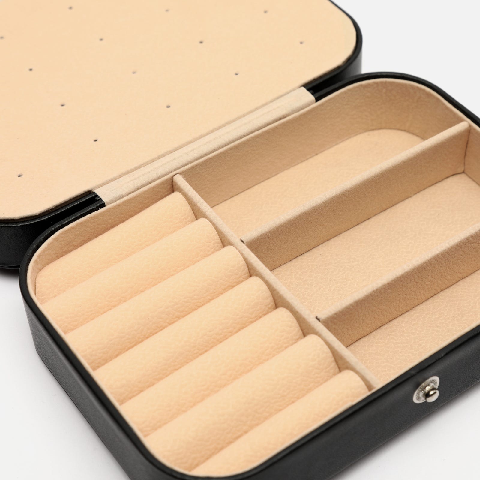 Su formato rígido con cierre a presión metálico mantiene tus piezas más preciadas seguras durante cualquier trayecto. El exterior, con acabado mate y tacto suave, aporta un aire desenfadado, mientras que su interior aterciopelado está cuidadosamente organizado para ofrecer múltiples compartimentos: espacios acolchados para anillos, divisiones ajustadas para pendientes o pulseras, y una solapa con ganchos para colgar collares sin que se enreden.
