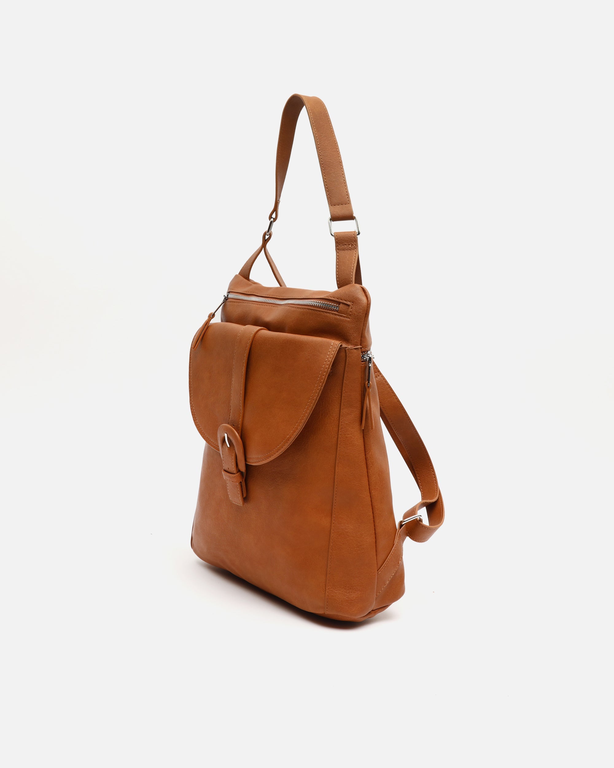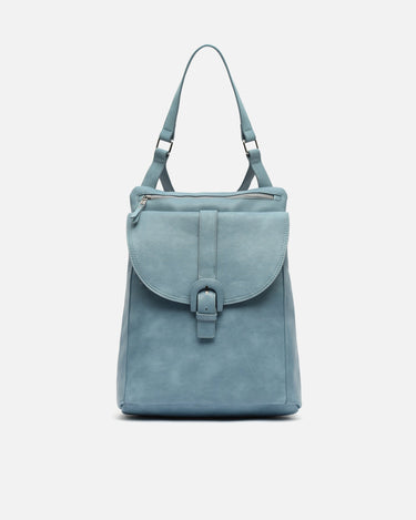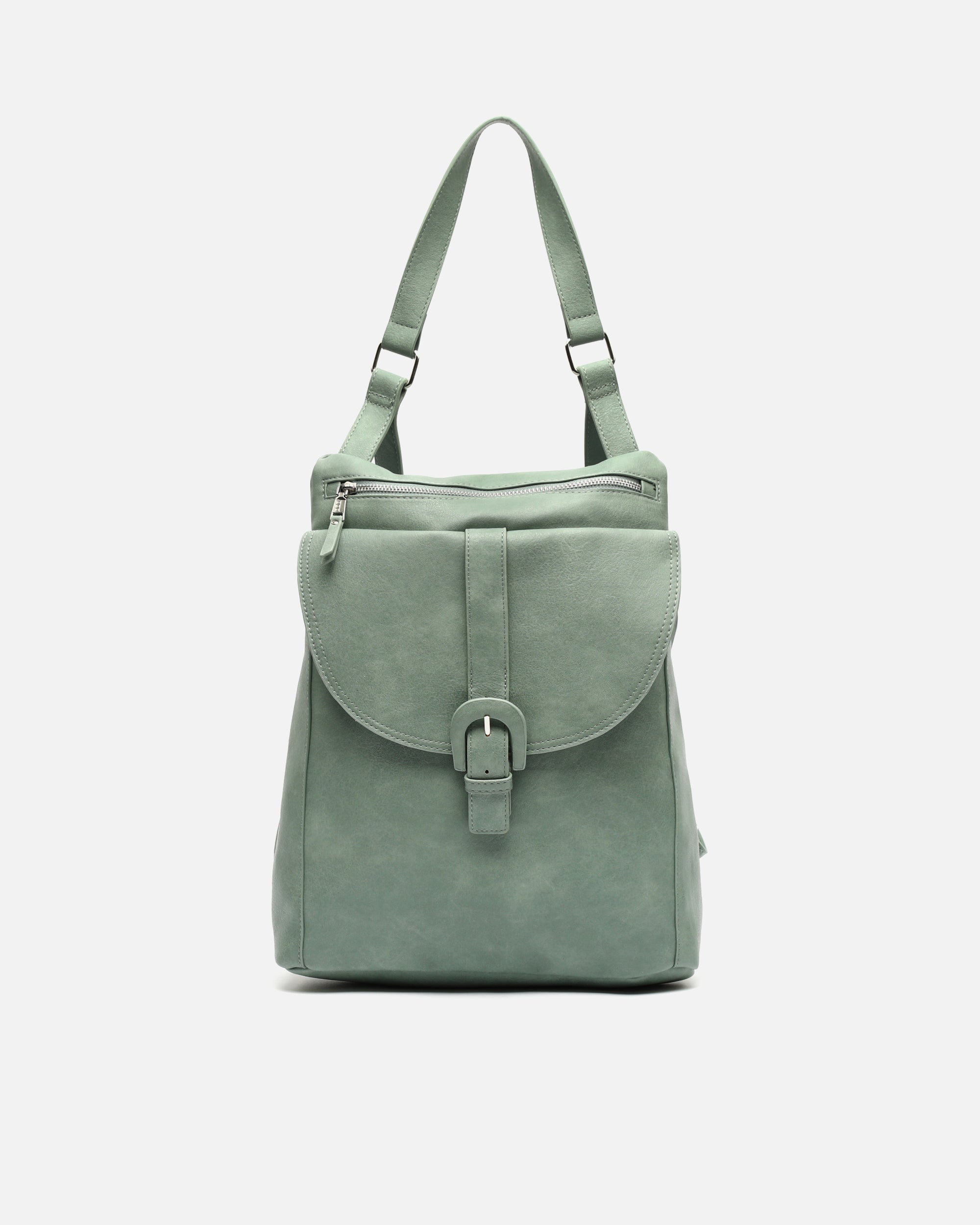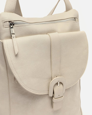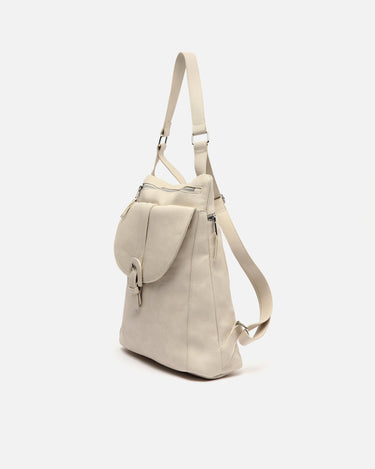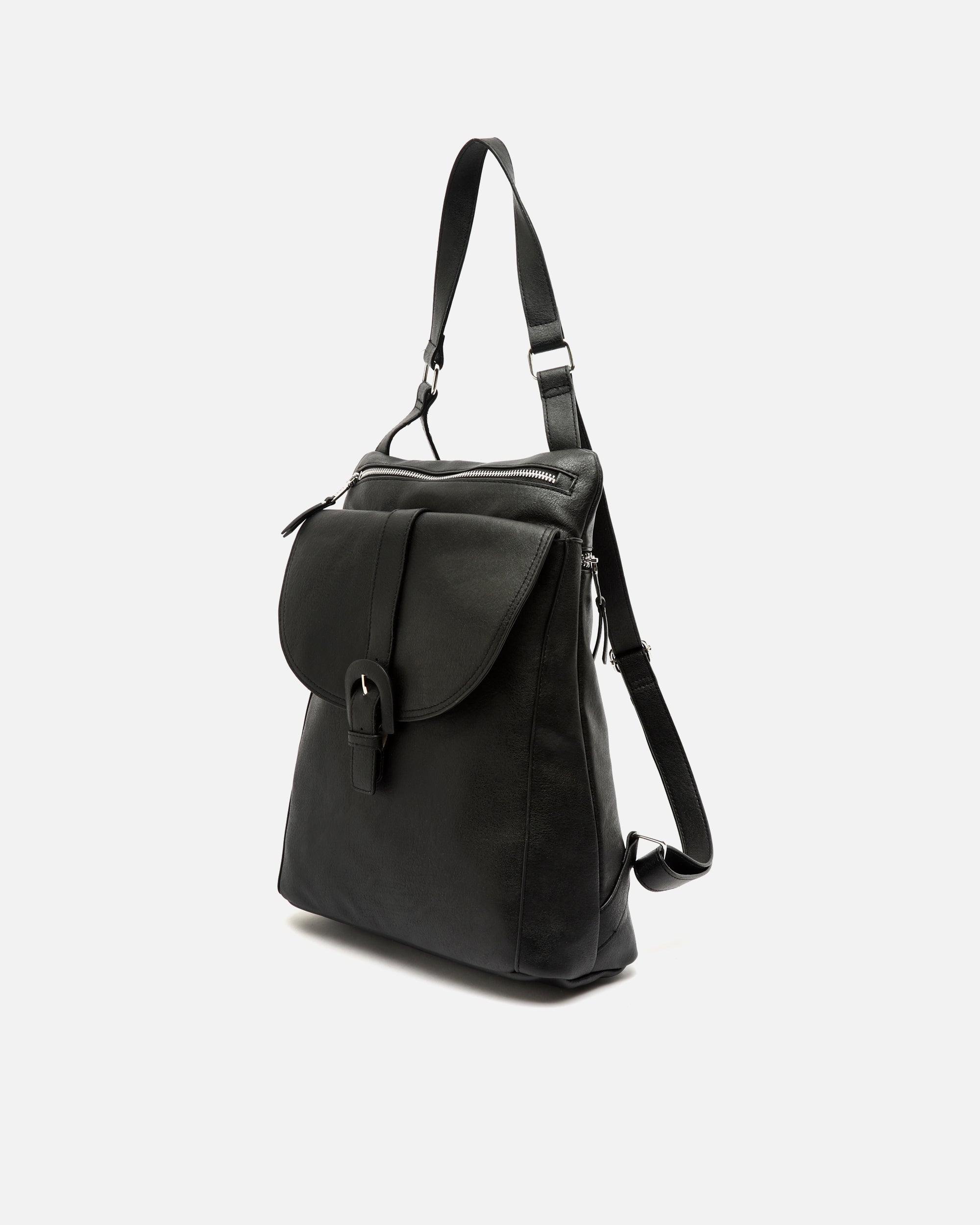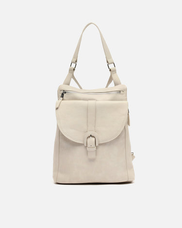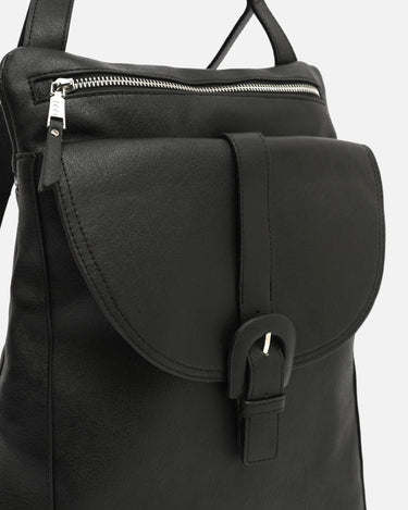 Confeccionada en tejido efecto piel suave al tacto, destaca por su solapa frontal curva, rematada con una tira y hebilla decorativa a tono que realza su diseño. Incorpora bolsillos estratégicamente ubicados, un práctico sistema de cierre dual y un bolsillo frontal oculto bajo la solapa con broche imantado que aporta un plus de seguridad.