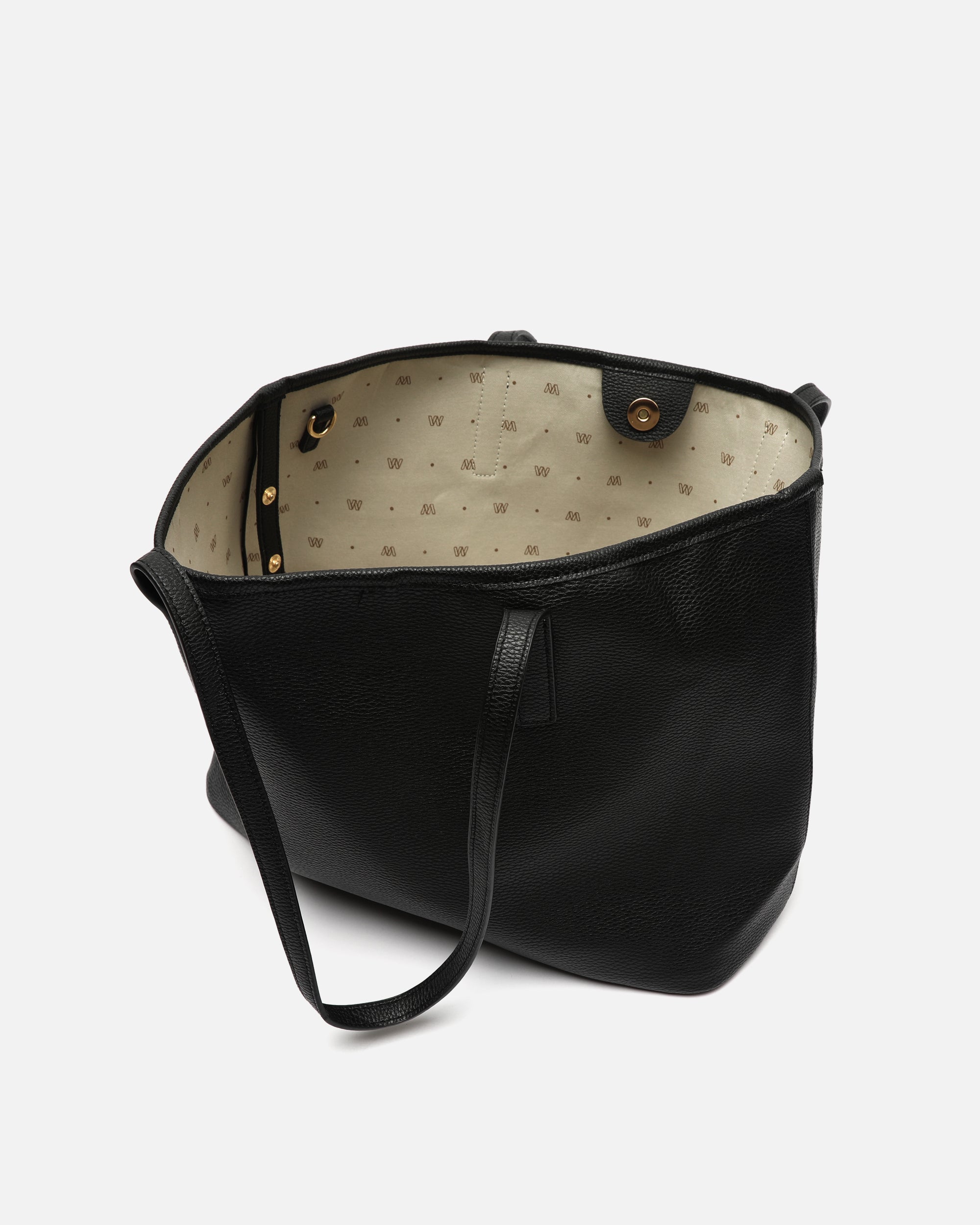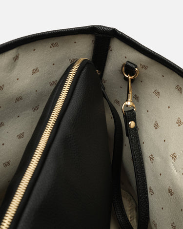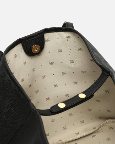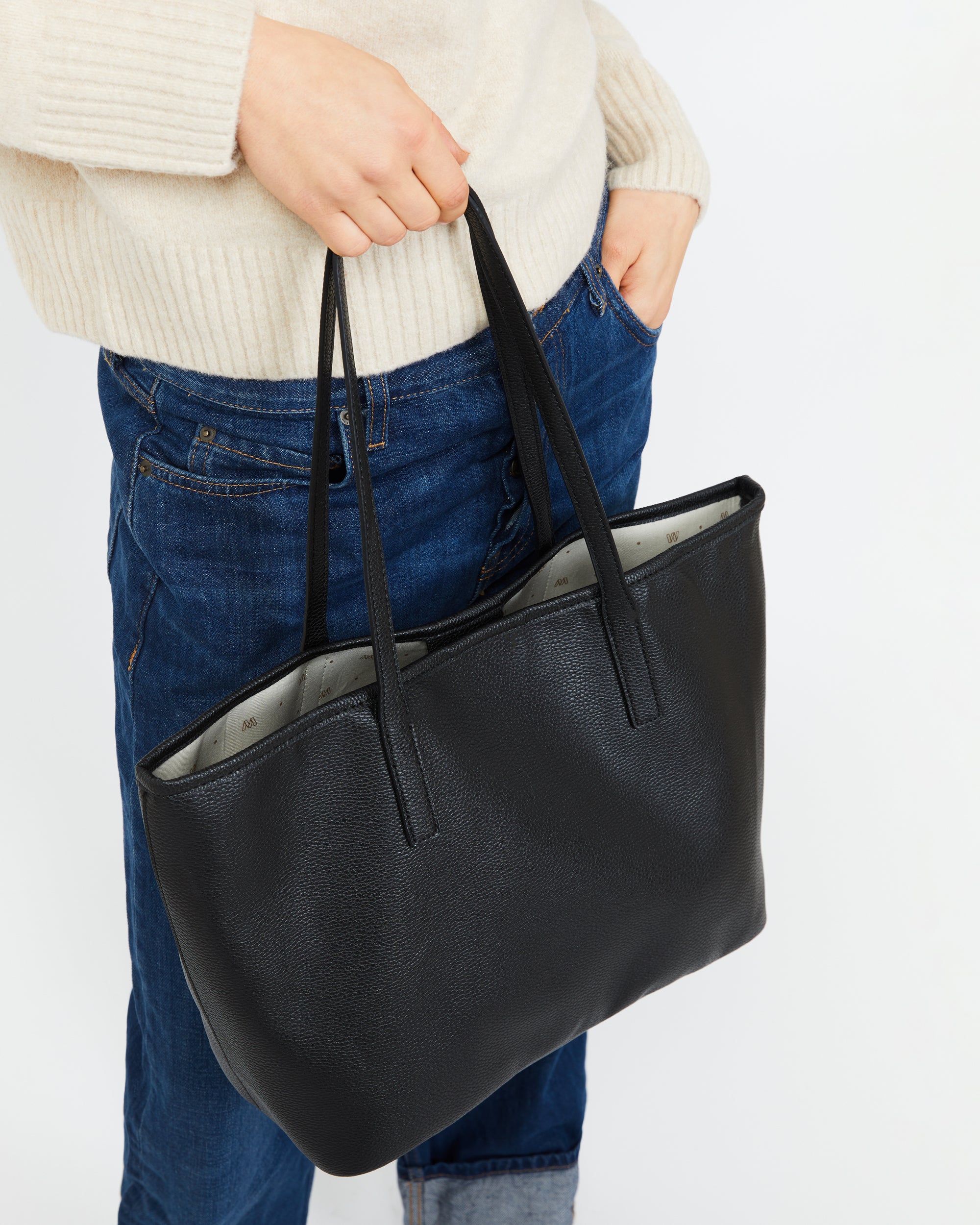 Confeccionado en suave efecto piel granulada, su exterior minimalista se realza con un interior amplio, forrado en tejido jaspeado a contraste y estampado con la icónica "M" de nuestra marca.