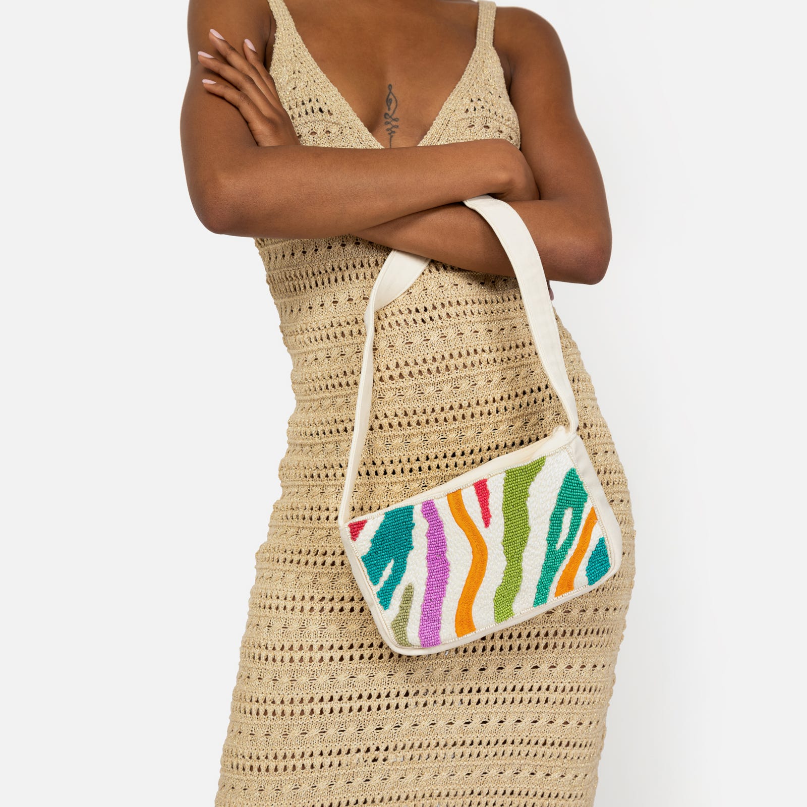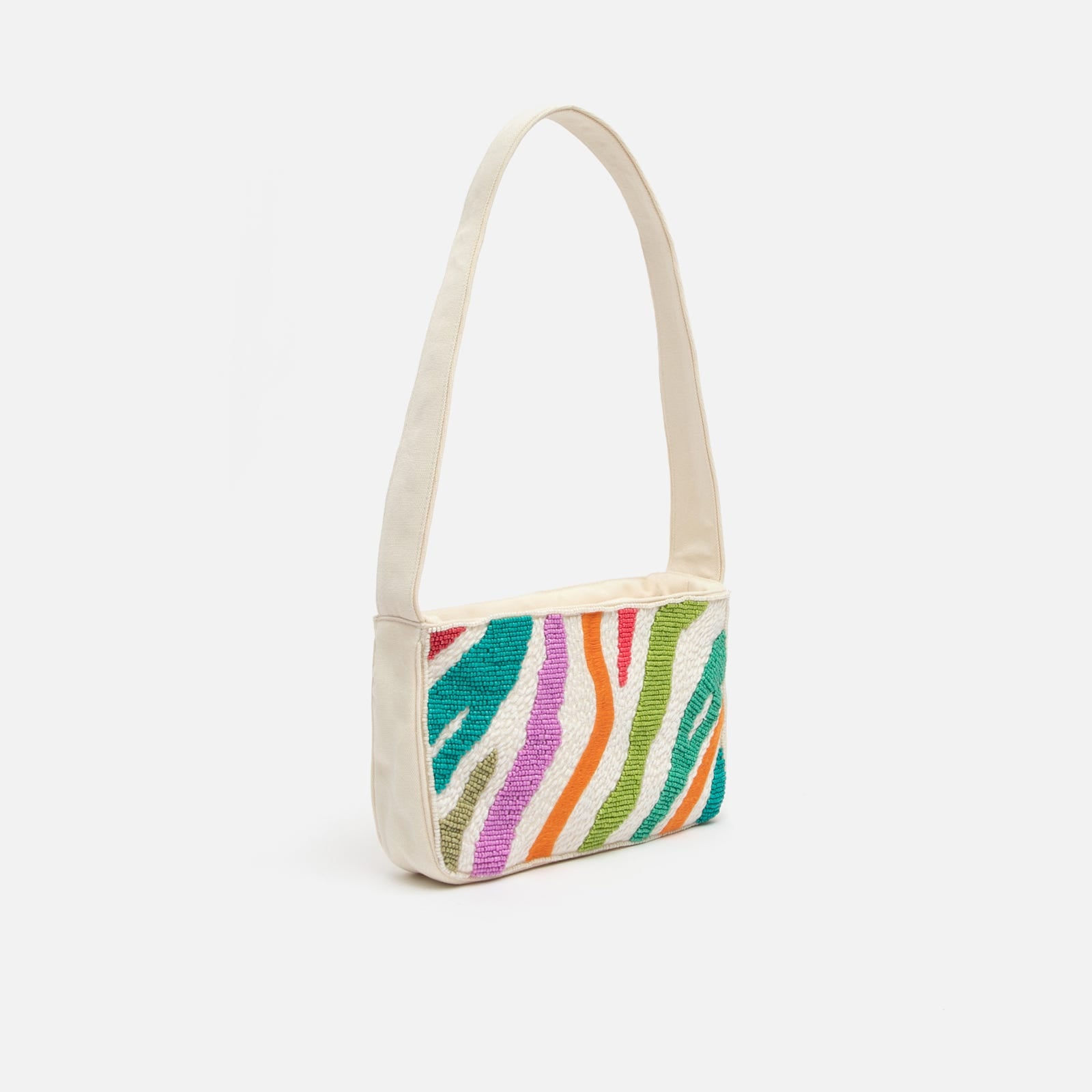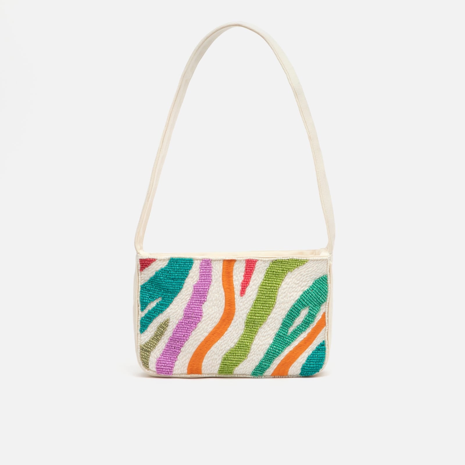Este bolso baguette beige es el complemento perfecto para el verano. Su diseño cuenta con un llamativo animal print multicolor que añade un toque vibrante a tu estilo.Dispone de un compartimento principal con bolsillo interior y cierre de cremallera, lo que te permite mantener tus pertenencias organizadas mientras disfrutas de tus actividades diarias. Es ideal para combinarlo con tus looks durante los meses más cálidos.