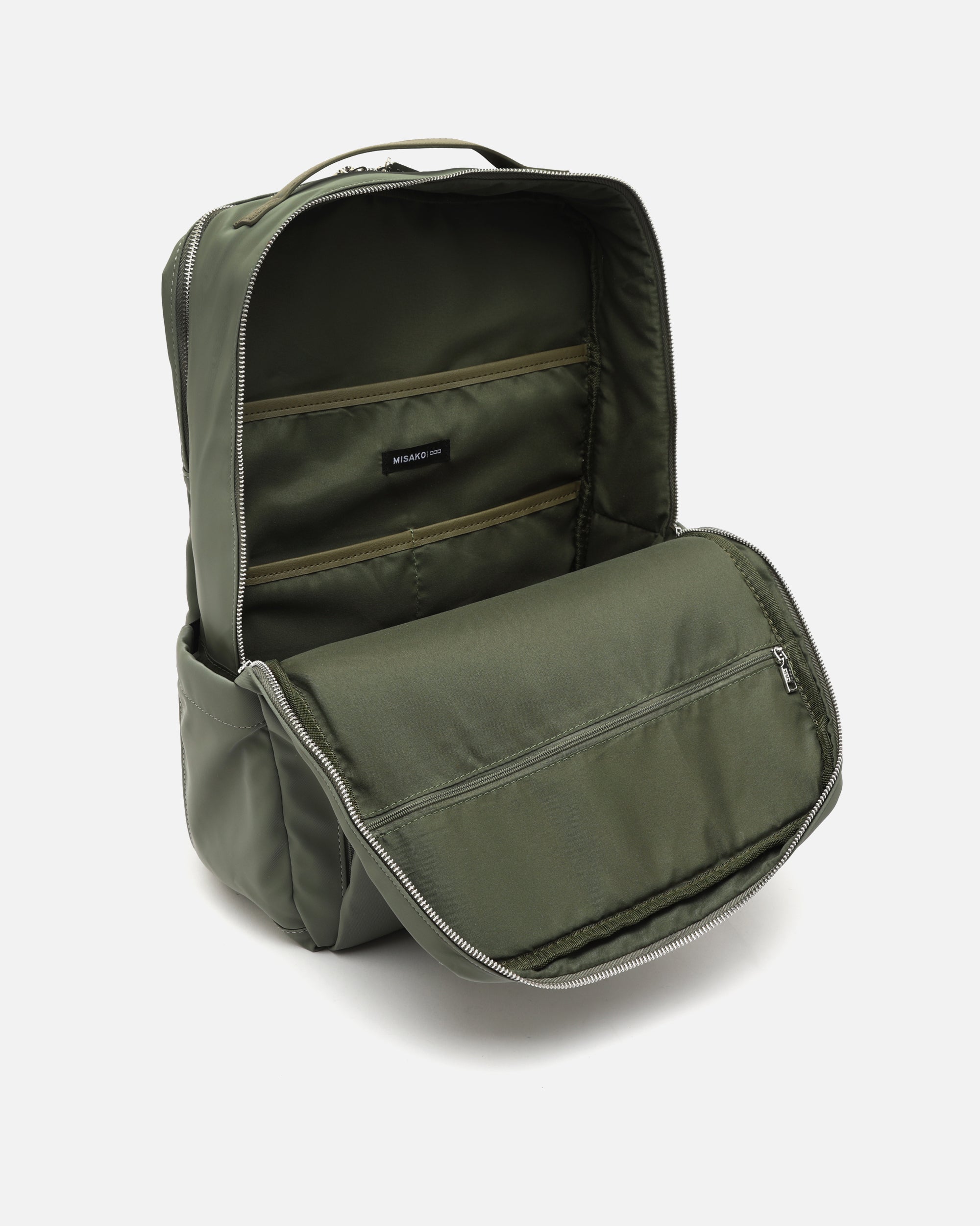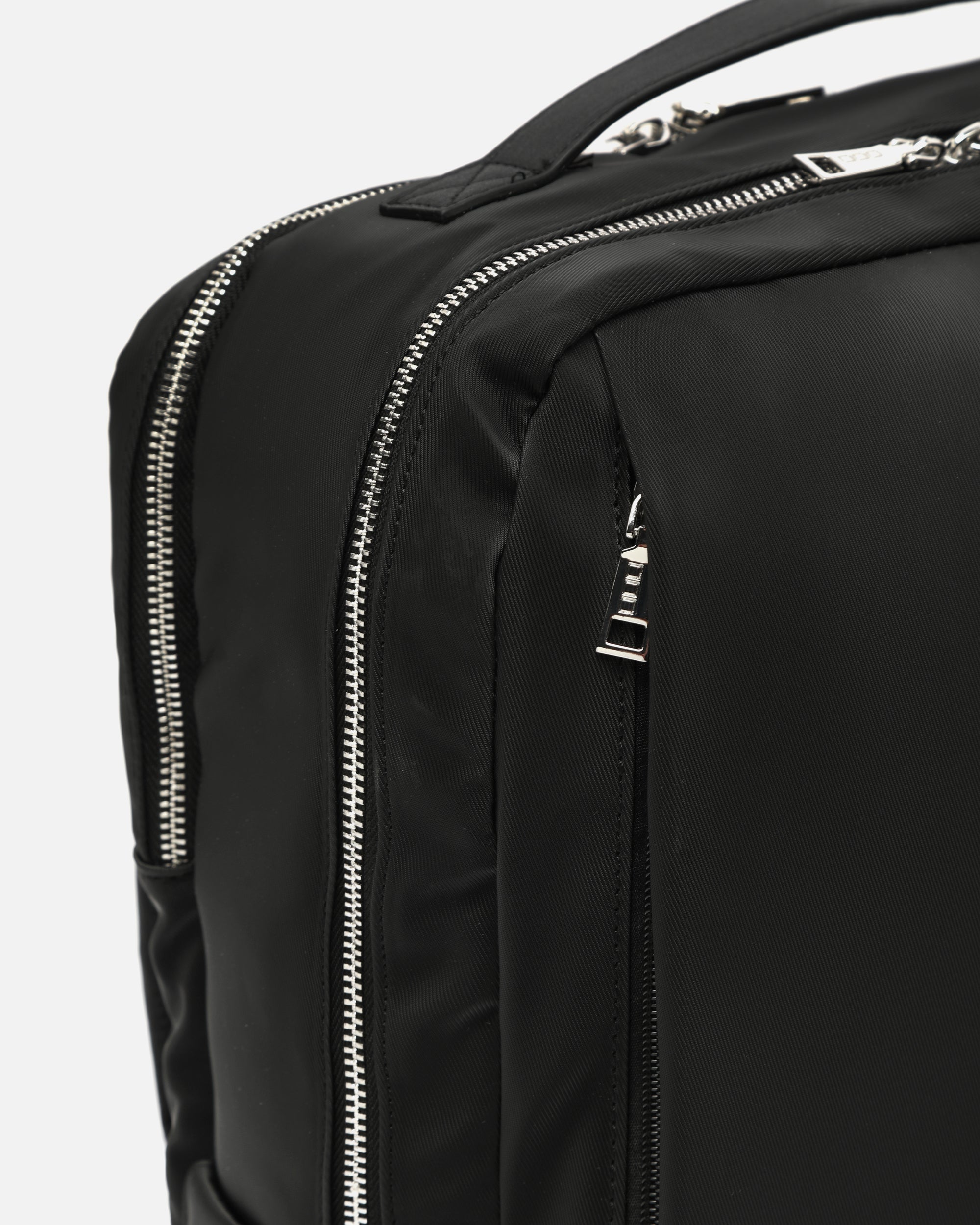 Fabricada em nylon durável, apresenta uma estética funcional com um toque sofisticado. O seu acabamento suave em tons neutros faz com que seja a escolha perfeita para quem prefere acessórios discretos com personalidade. O seu design inclui fechos duplos de metal, bolsos exteriores de acesso rápido e um compartimento principal almofadado, ideal para manter o seu computador portátil, documentos e objectos essenciais bem organizados.