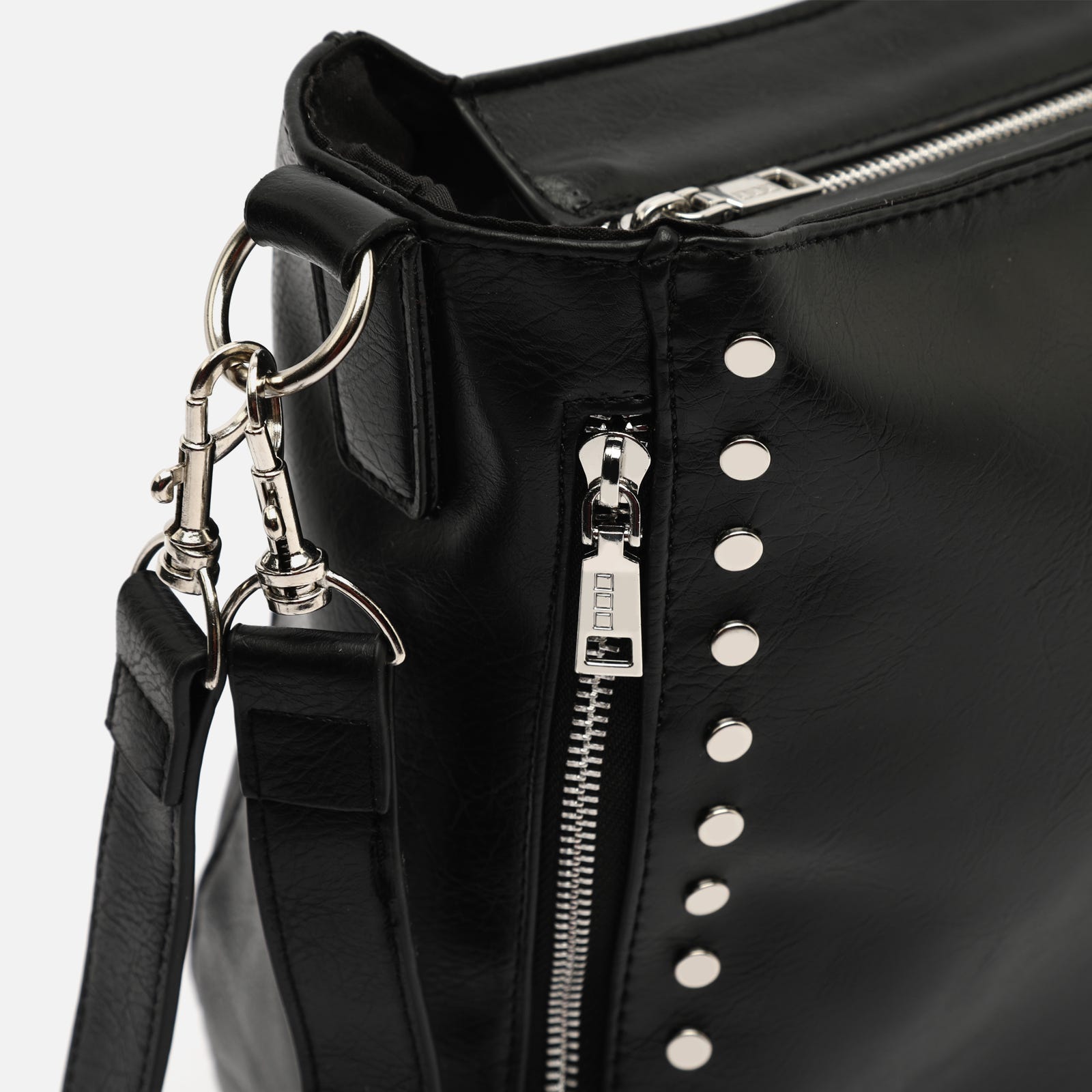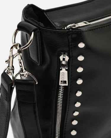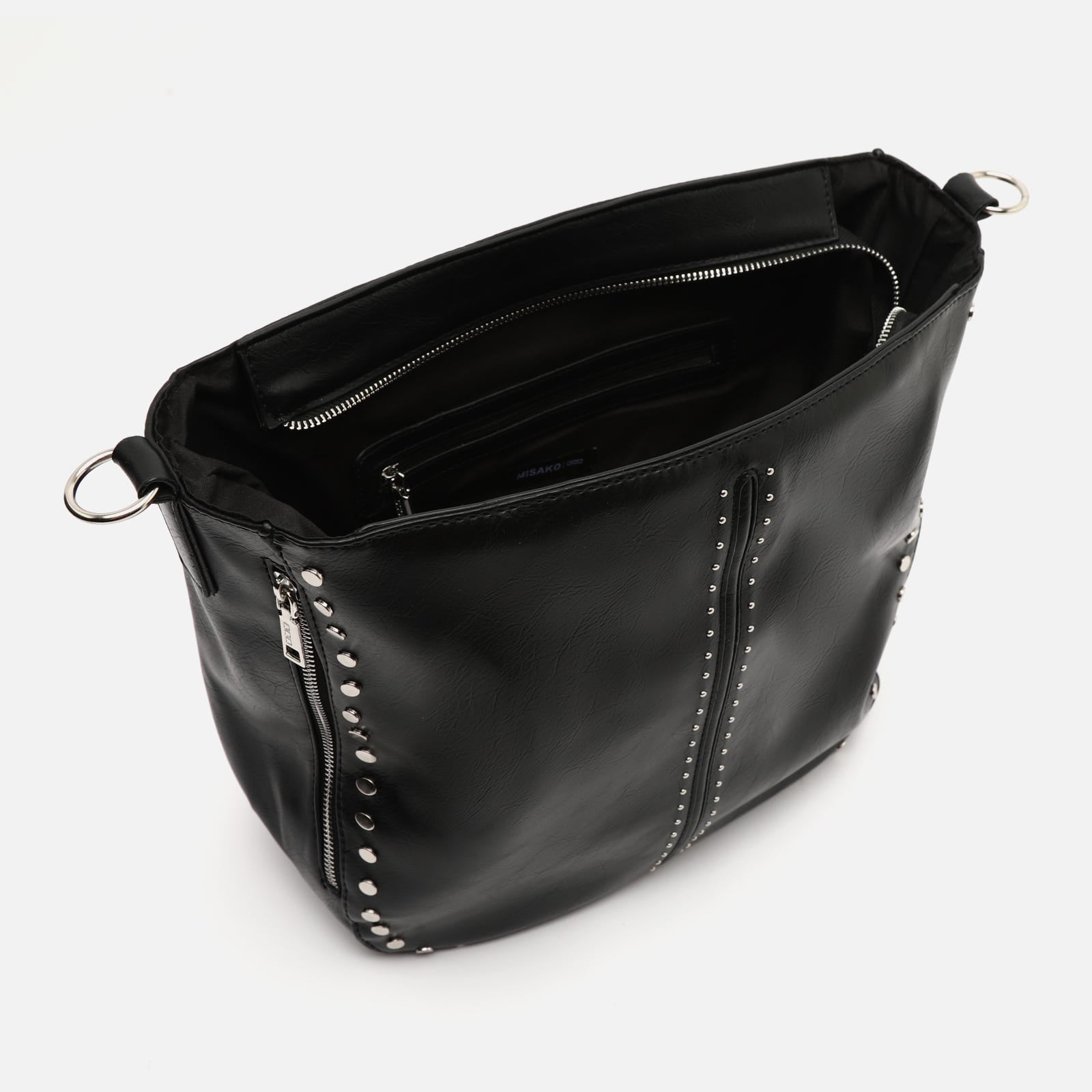 Combina a suavidade do efeito de pele com detalhes metálicos prateados, como micro tachas e rebites, para um visual moderno e arrojado. Foi concebida com vários bolsos: dois bolsos laterais com fechos de correr metálicos à frente, um bolso superior para aceder ao compartimento principal e outro na parte de trás, que é profundo e perfeito para manter os seus objectos essenciais à mão. As pegas em metal têm gravado o logótipo Misako. Inclui uma alça de ombro ajustável e amovível, bem como uma alça curta amovível que lhe permite transportá-la ao ombro ou como mala de mão. Este acessório é tudo o que precisa para marcar a diferença onde quer que vá.