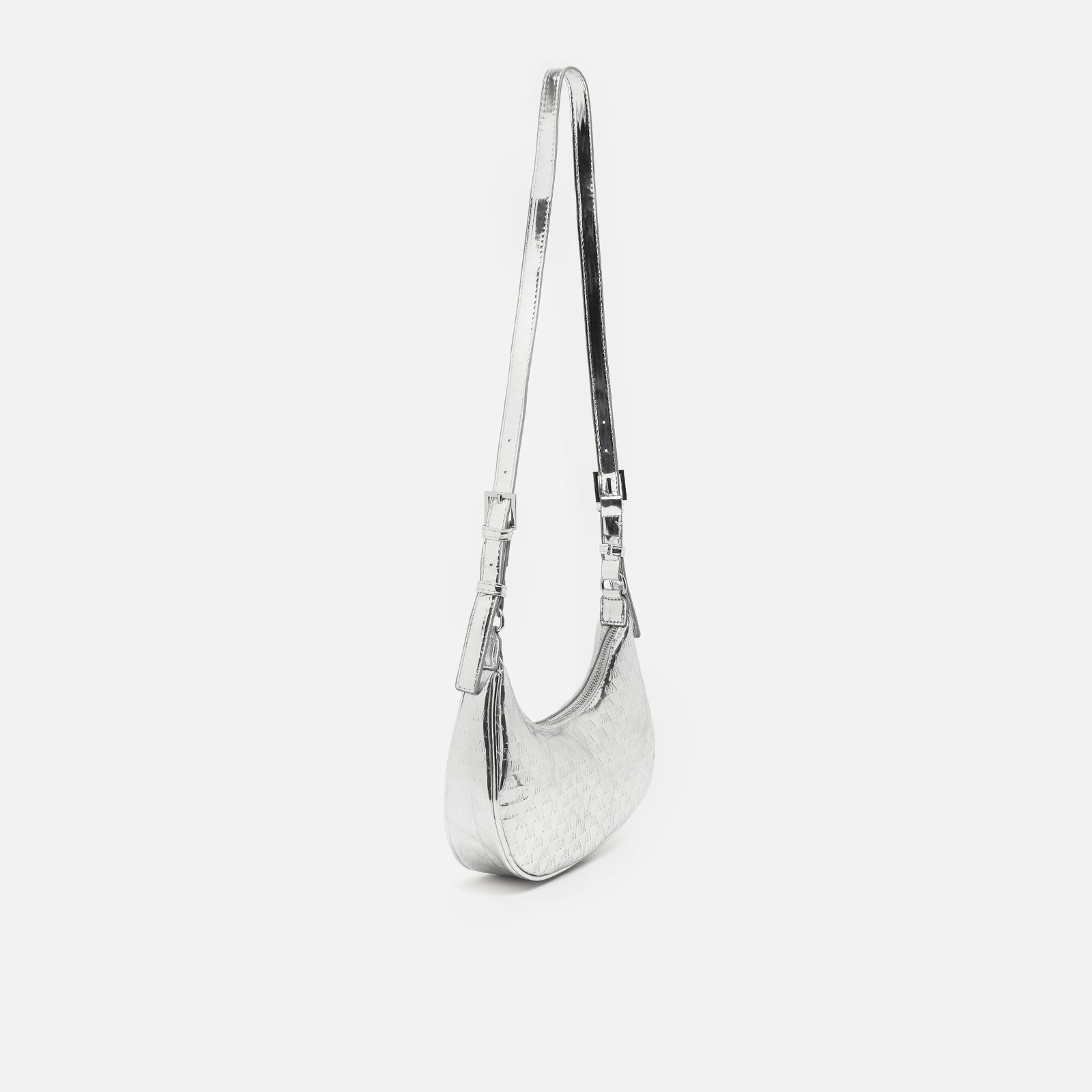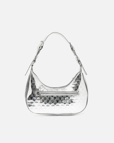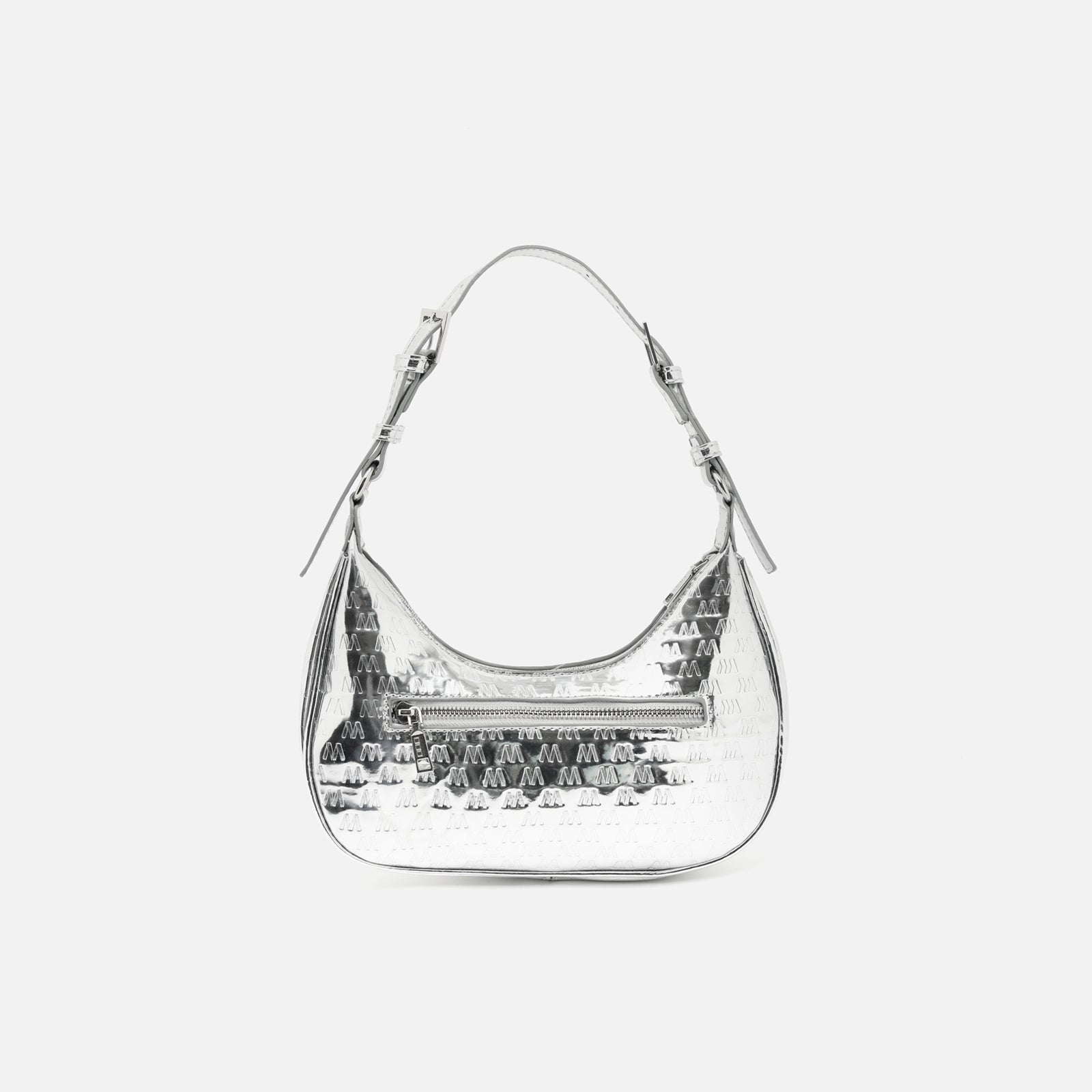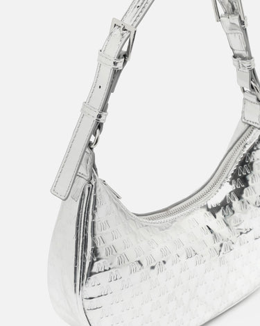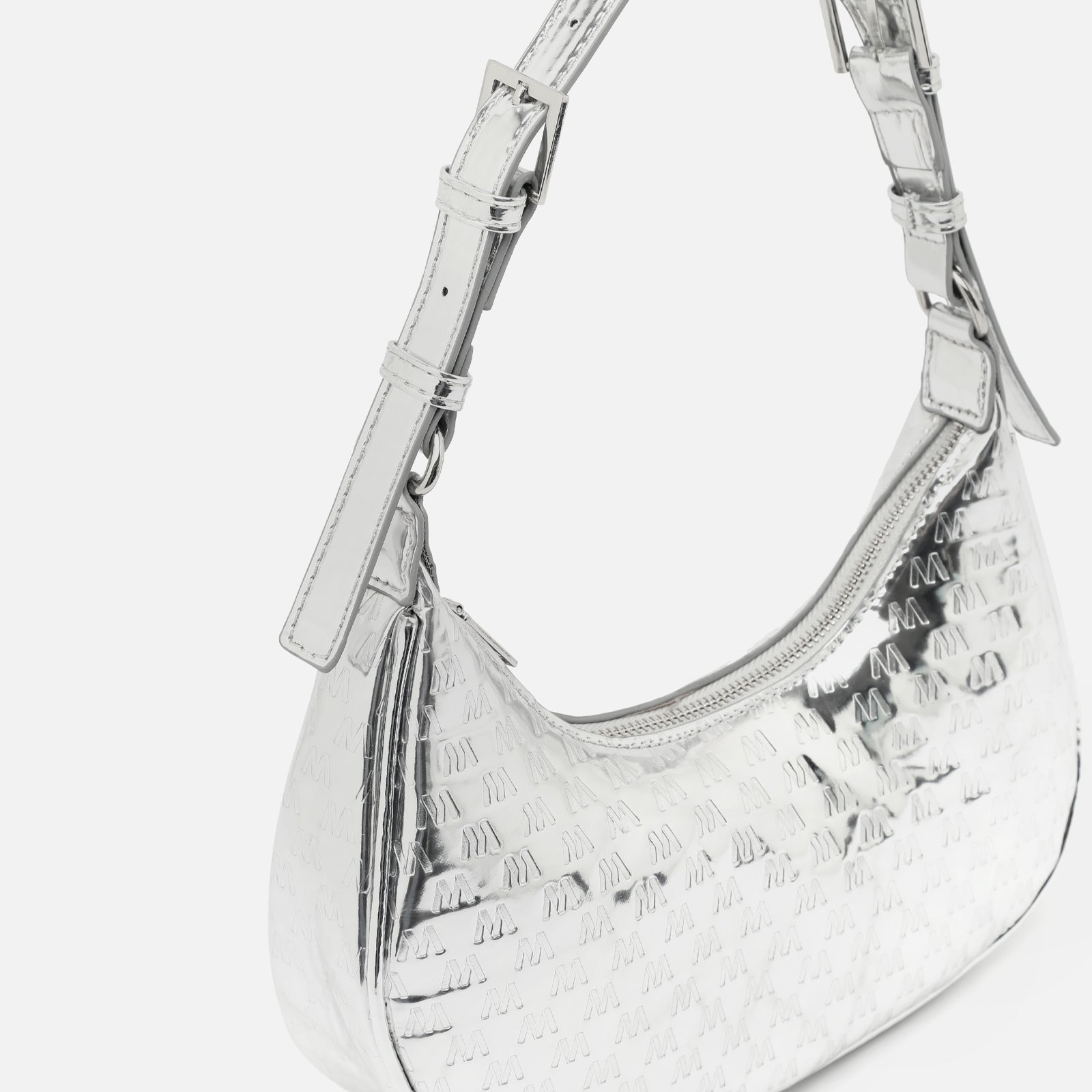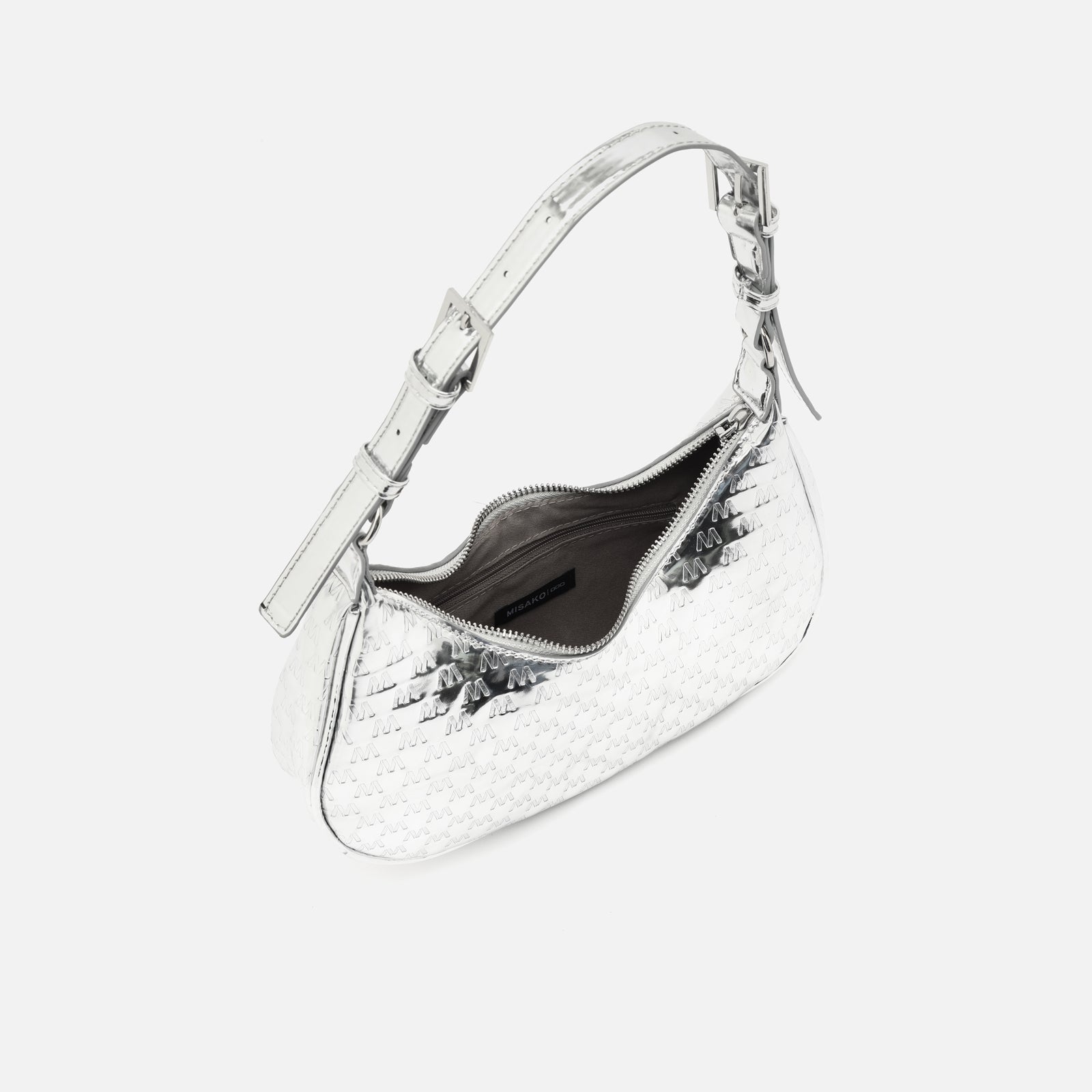 Design compacto num modelo que faz a diferença. A bolsa Misra da Misako é confeccionada num tecido com efeito metalizado, decorada com o icónico monograma da marca gravado em toda a superfície, o que lhe confere um brilho e estilo únicos.