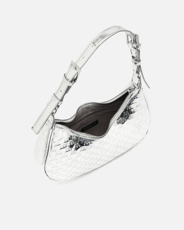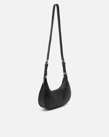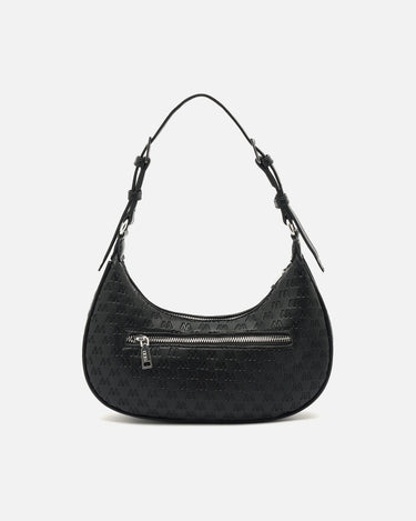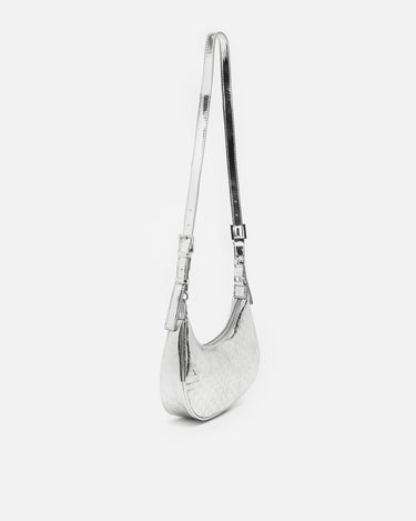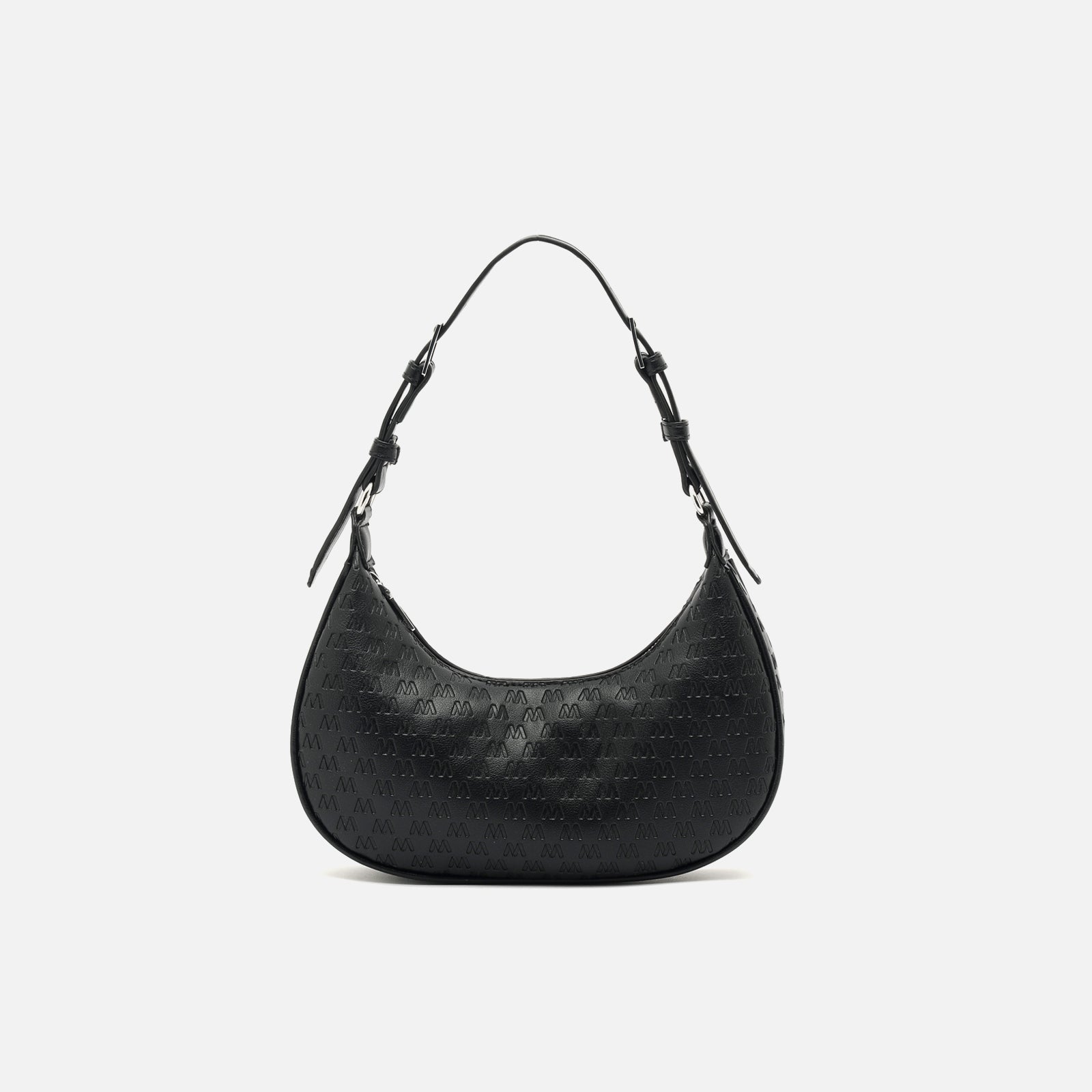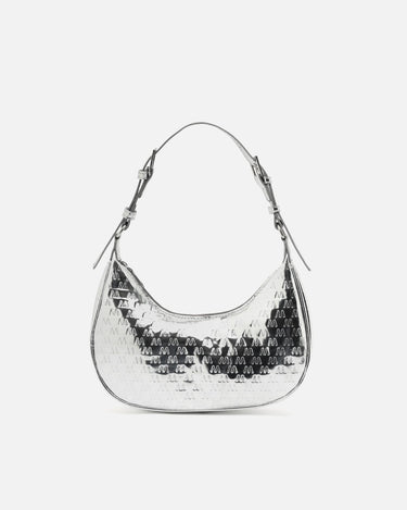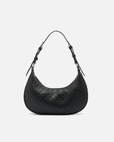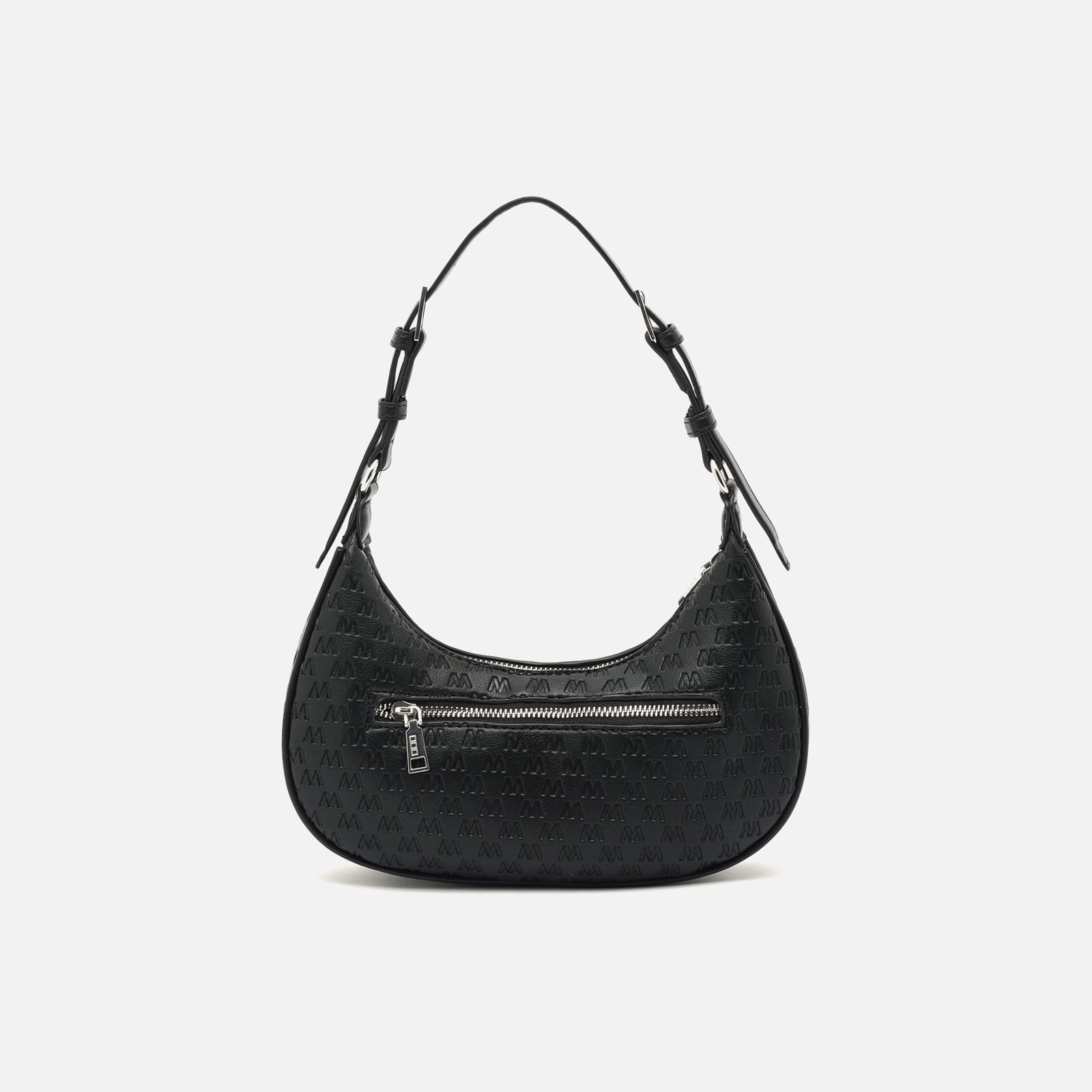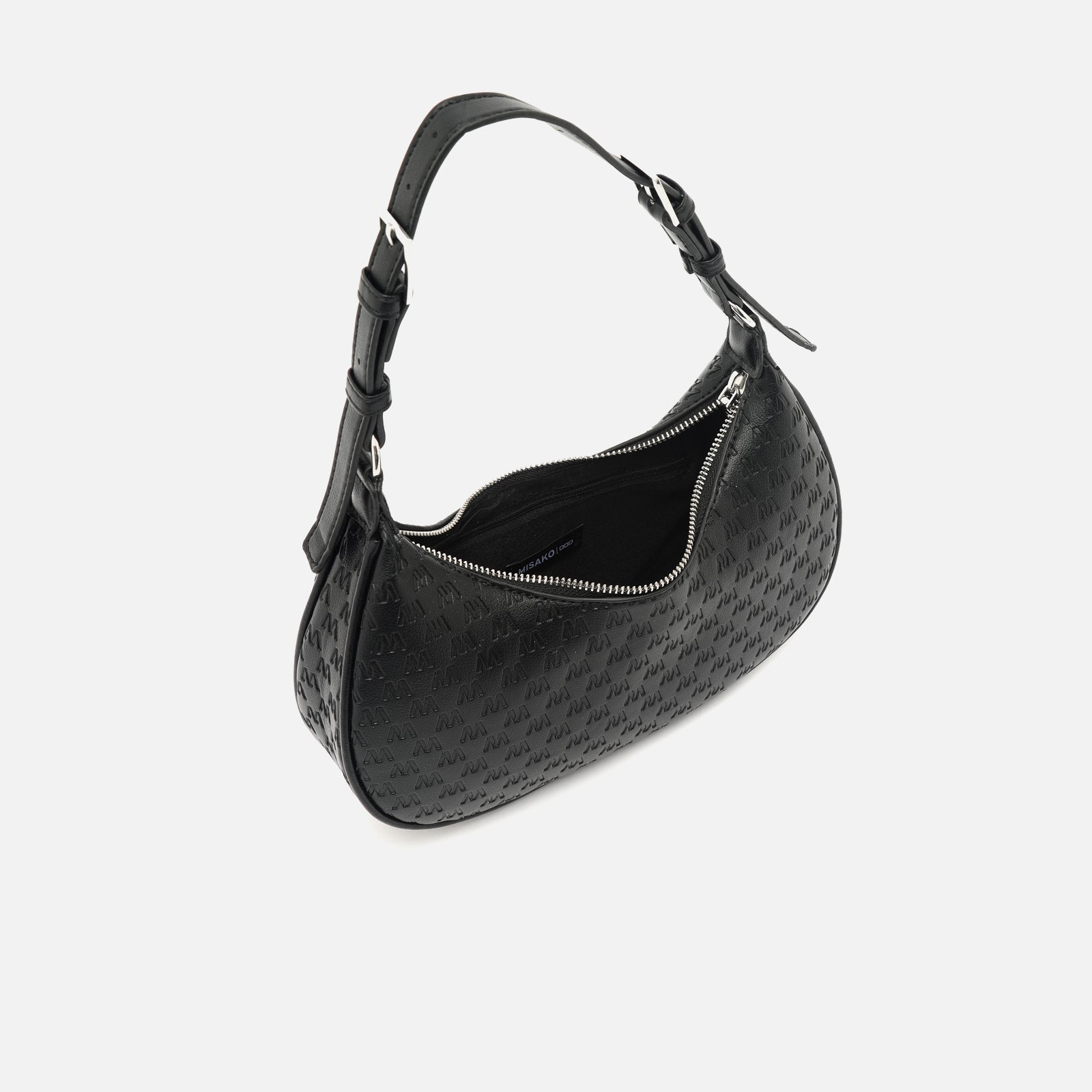 Design compacto num modelo que faz a diferença. A bolsa Misra da Misako é confeccionada num tecido com efeito metalizado, decorada com o icónico monograma da marca gravado em toda a superfície, o que lhe confere um brilho e estilo únicos.