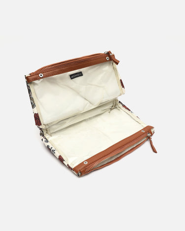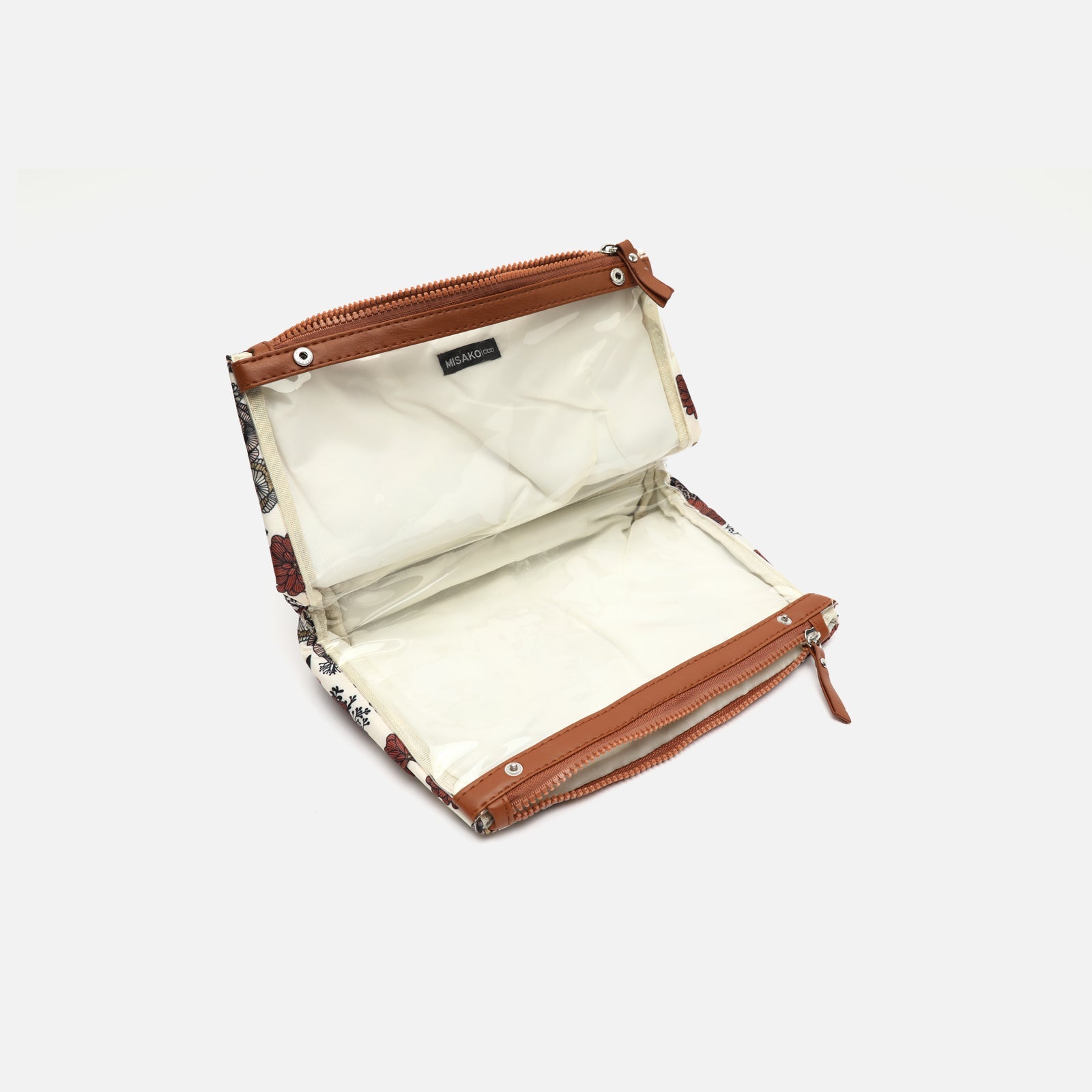 No exterior, apresenta dois bolsos planos de acesso rápido, ideais para organizar produtos de uso frequente ou pequenos objectos essenciais. Quando totalmente aberta, revela um interior em forma de acordeão, permitindo visualizar rapidamente todo o conteúdo.